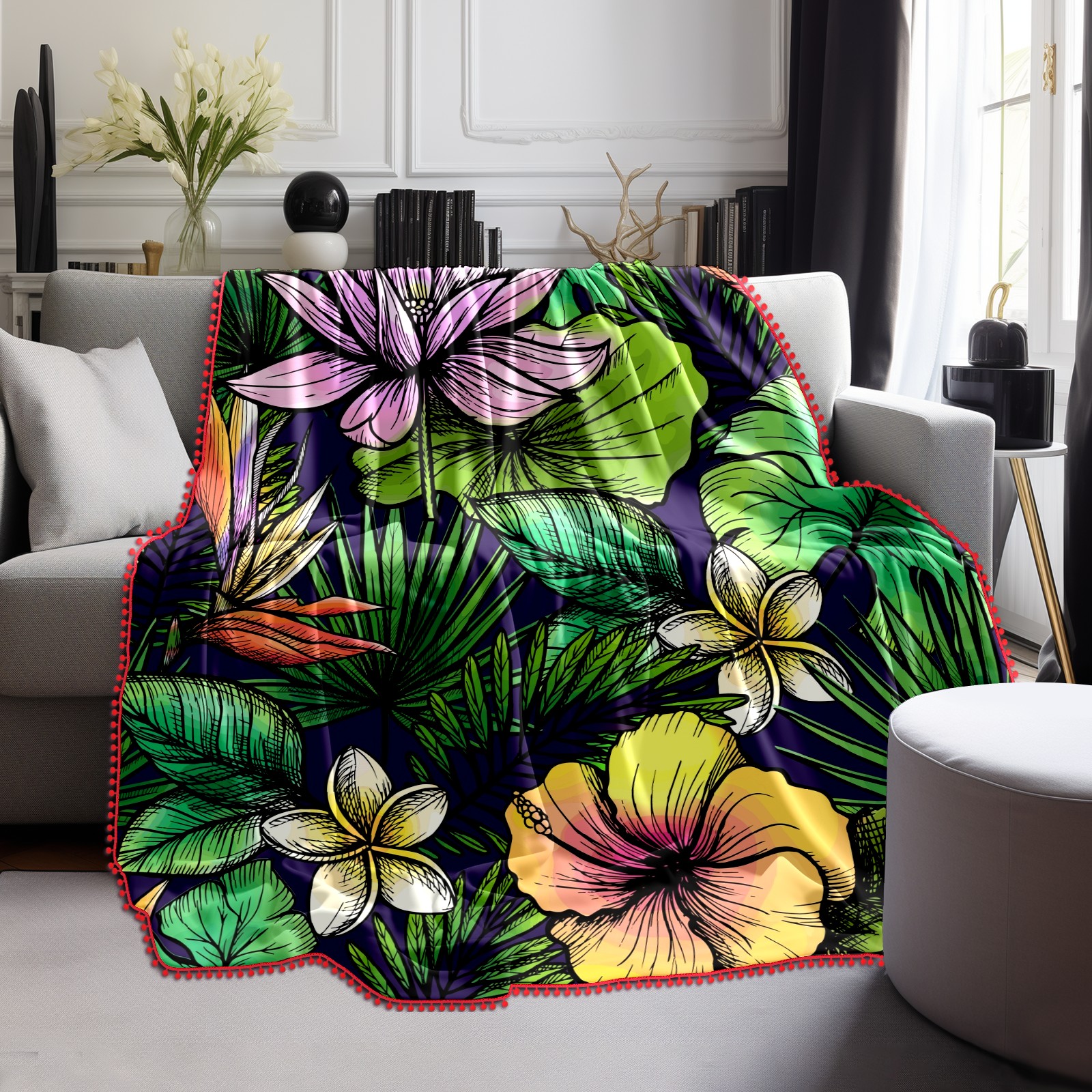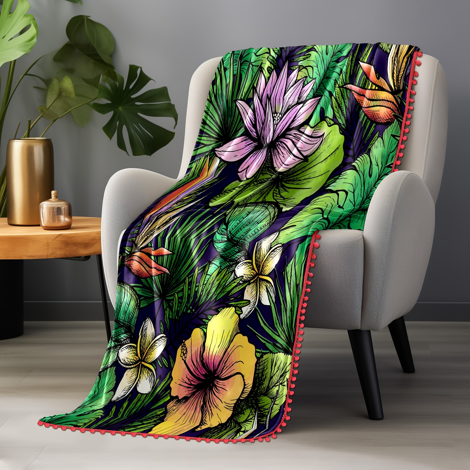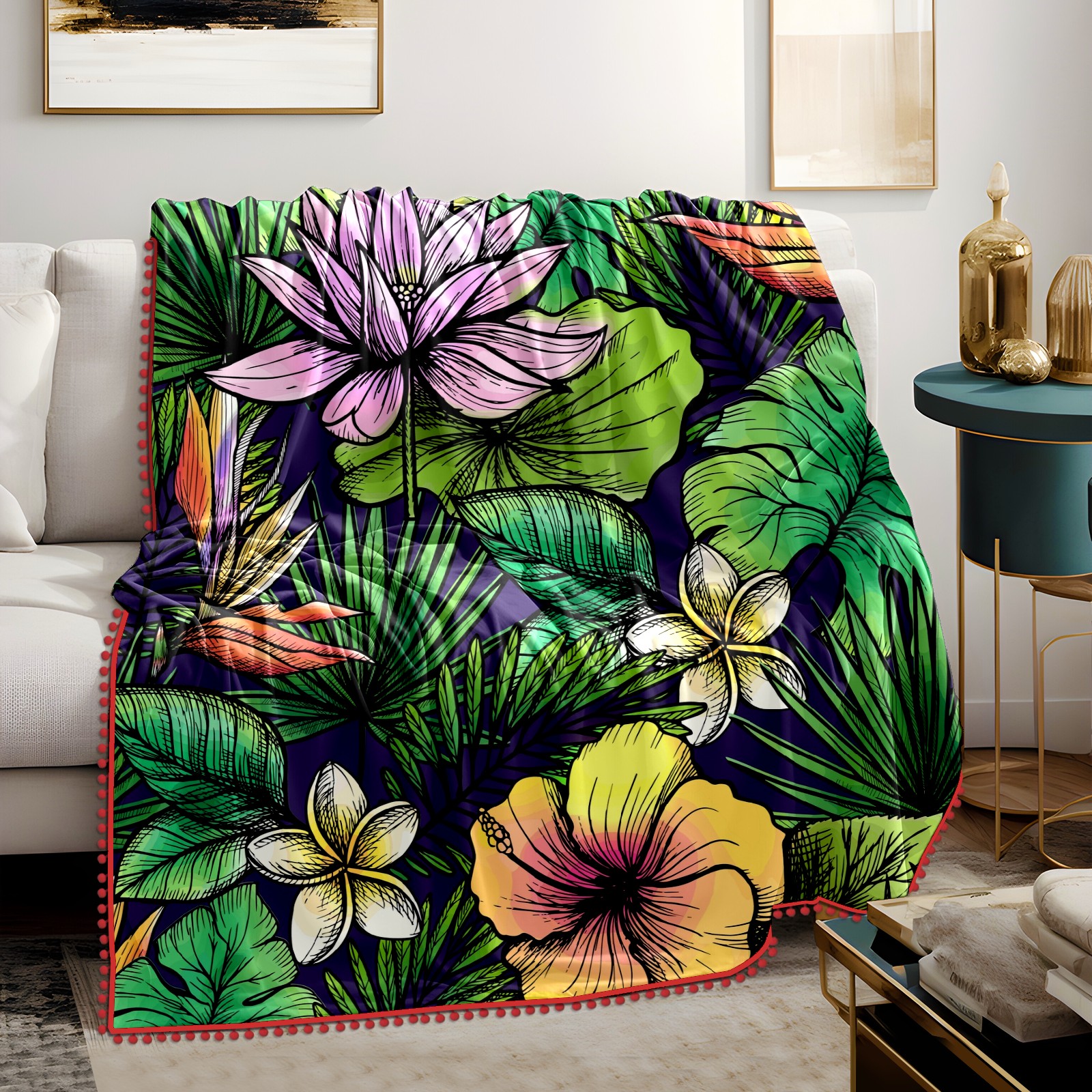 流苏毛毯 Tropical Palm Leaves Floral Lotus