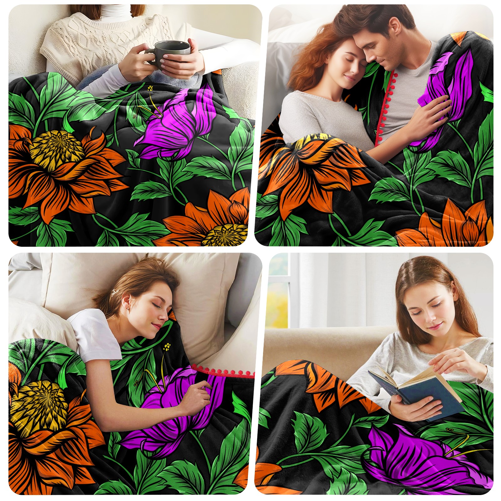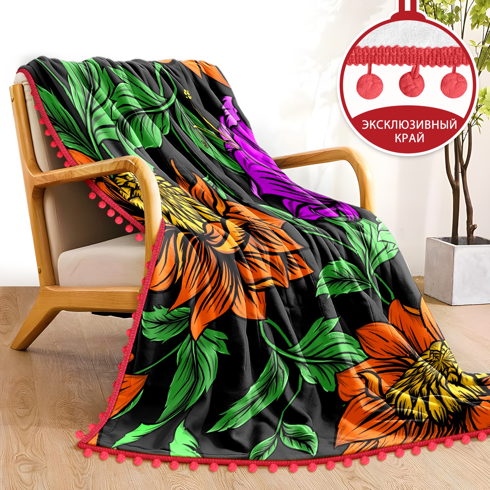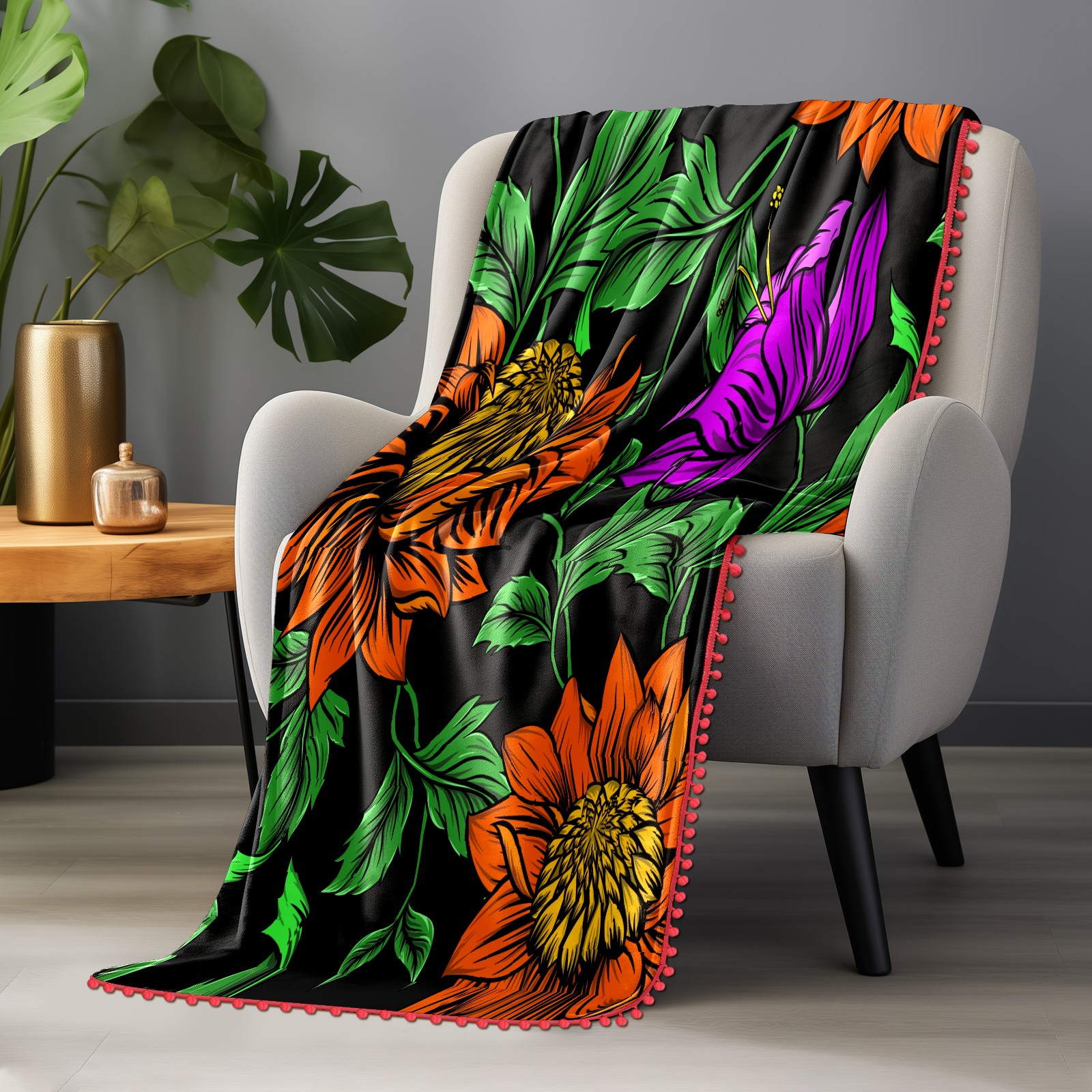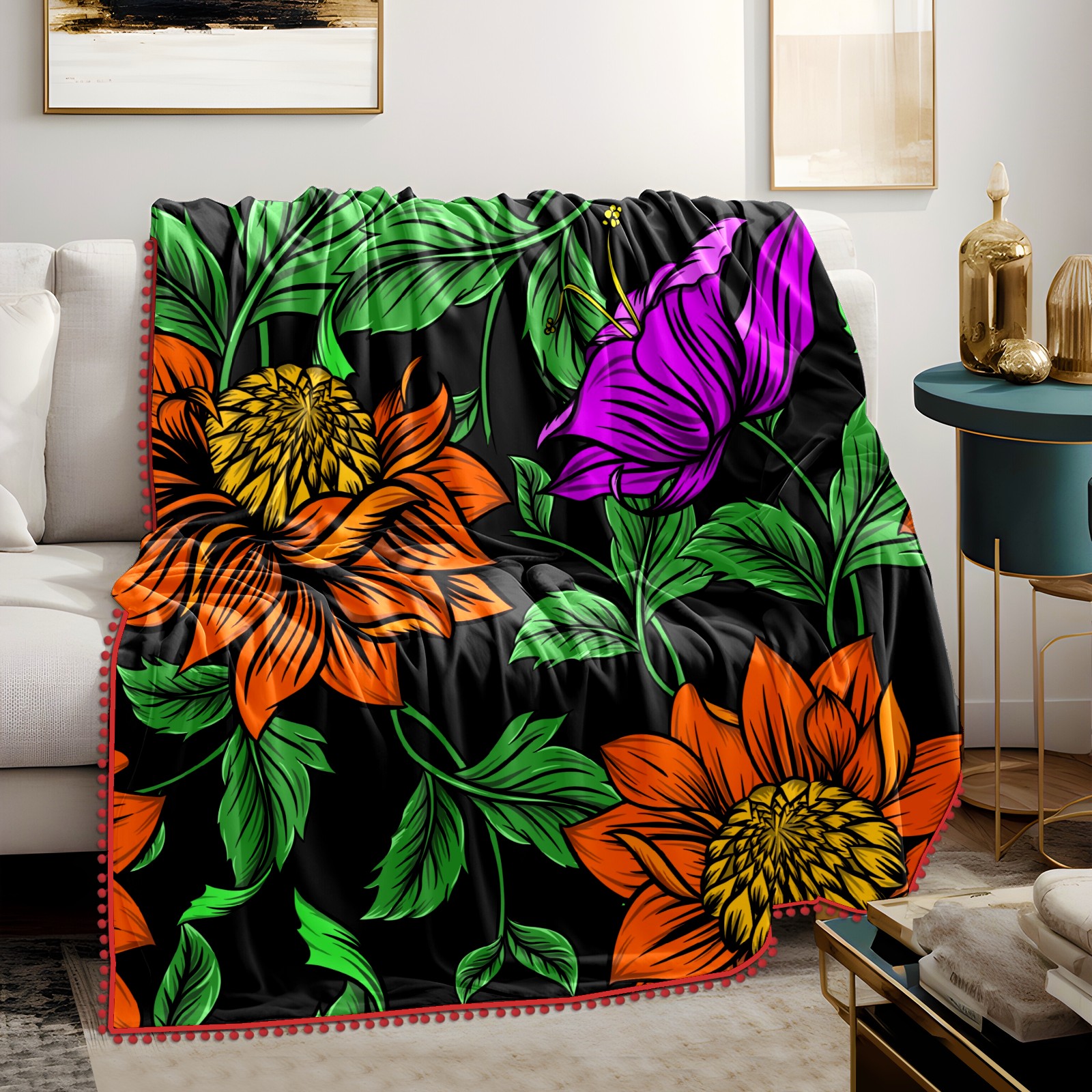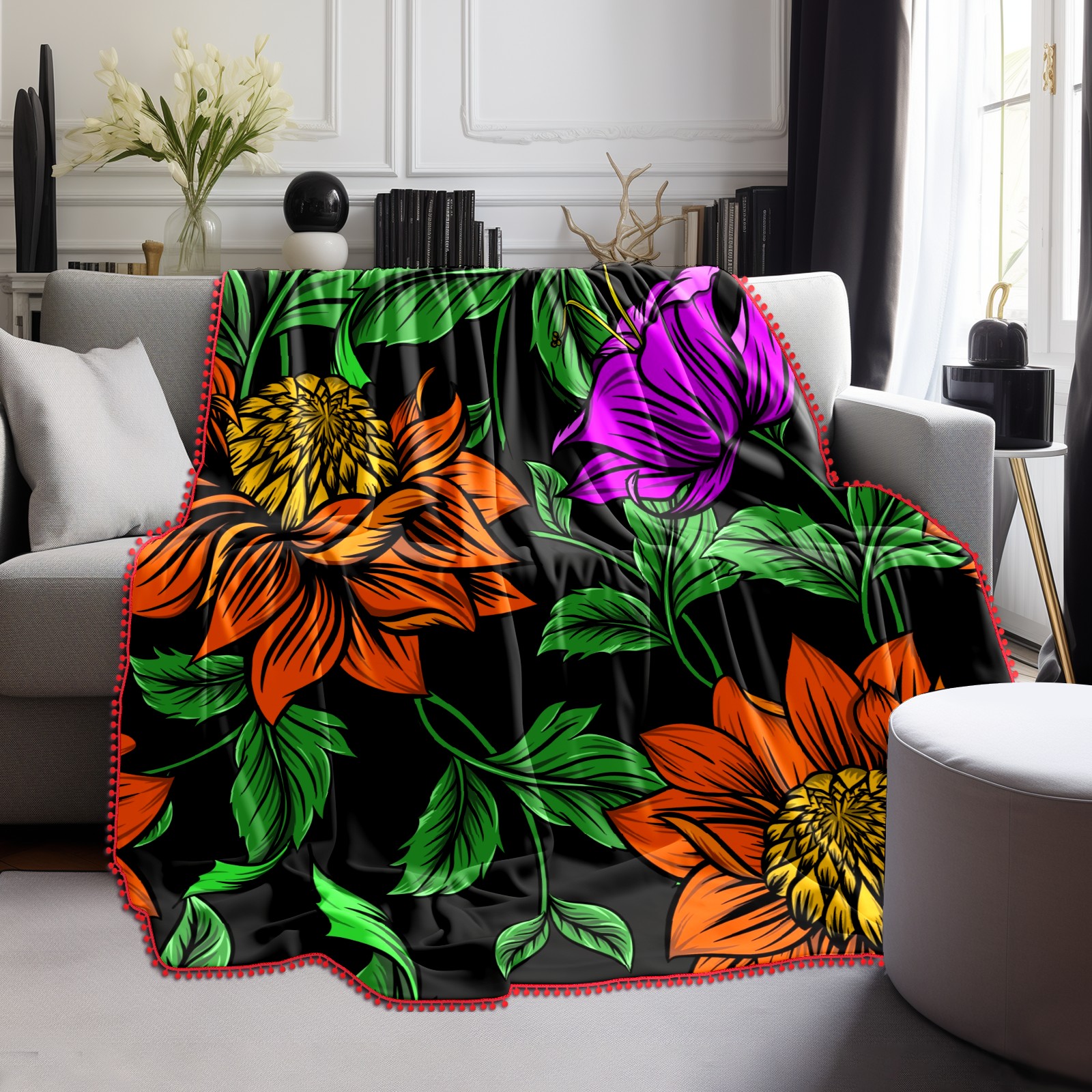 流苏毛毯 Drawing Orange Rose Flower Green Leaves