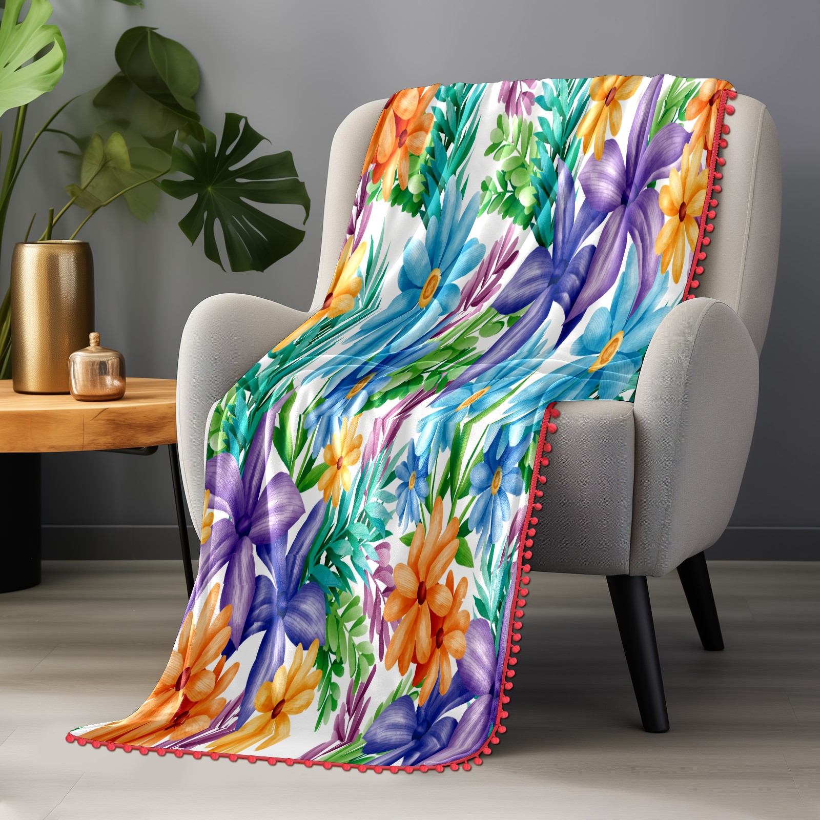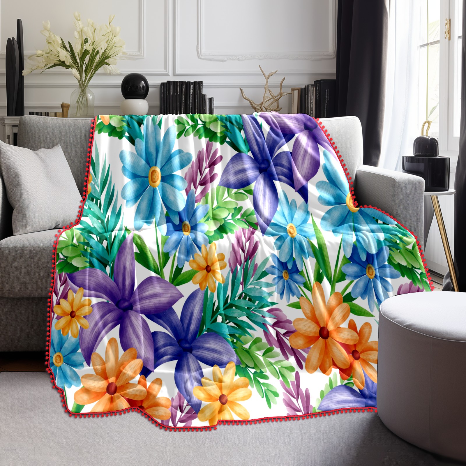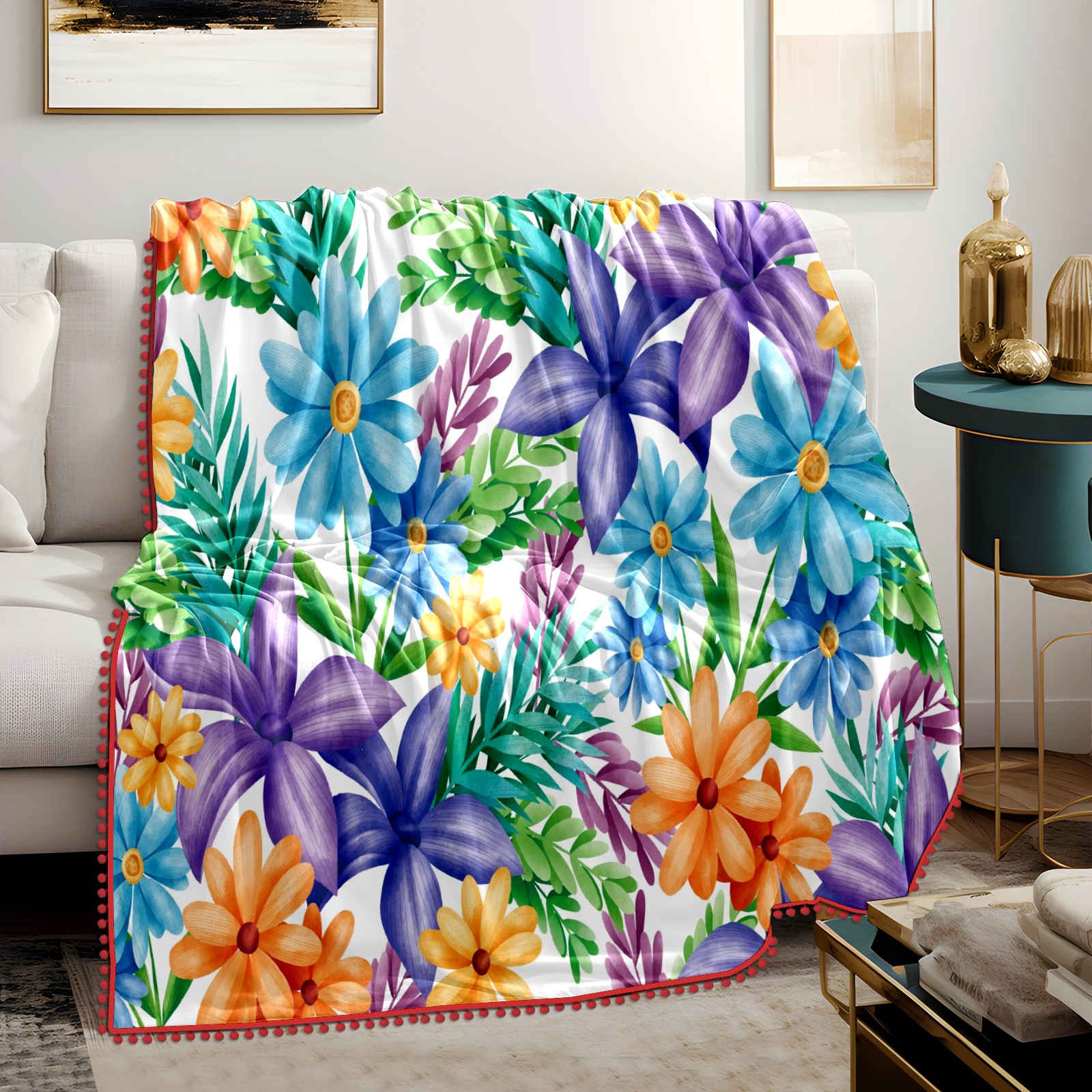 流苏毛毯 Blue Yellow Purple Florals Green Leaves