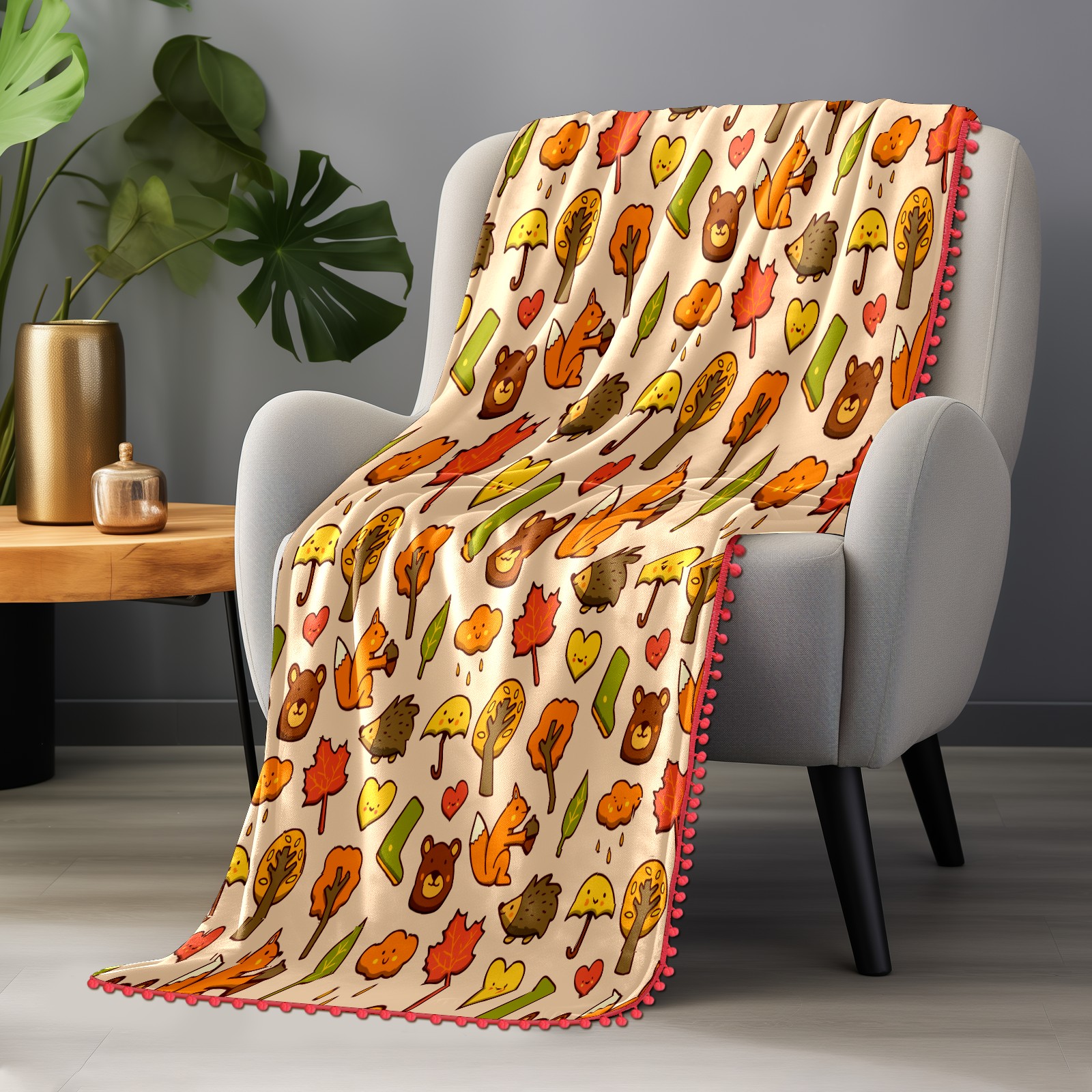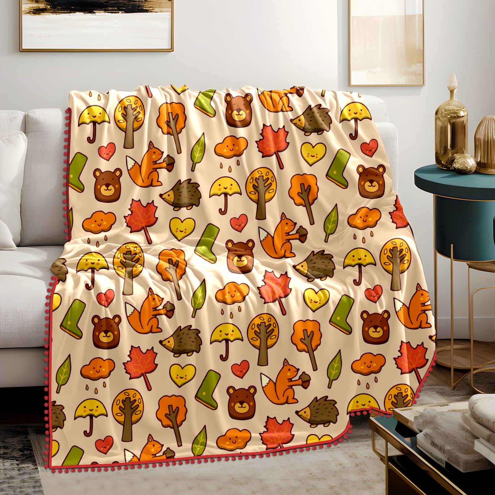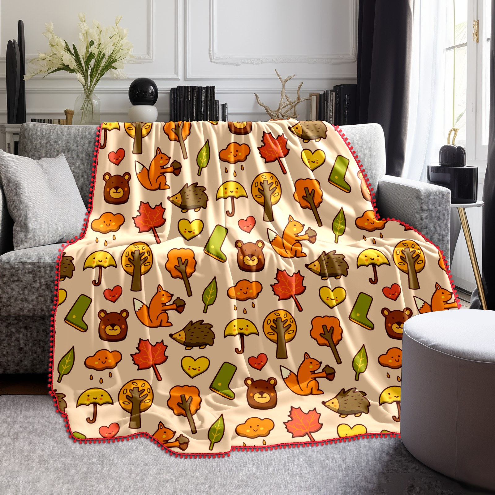 流苏毛毯 Autumn Hedgehog Fox Leaves Rainy Tree Doodle Pattern