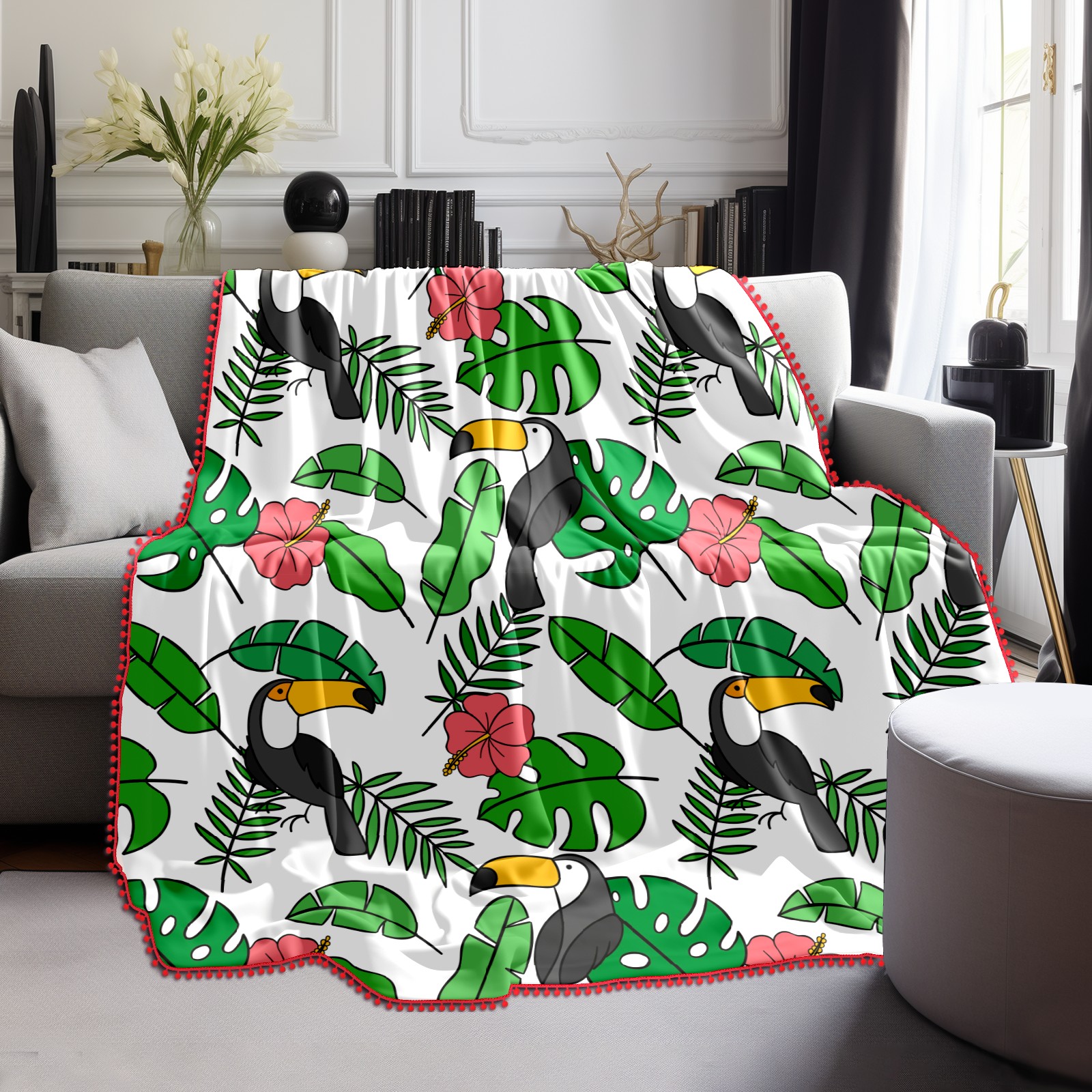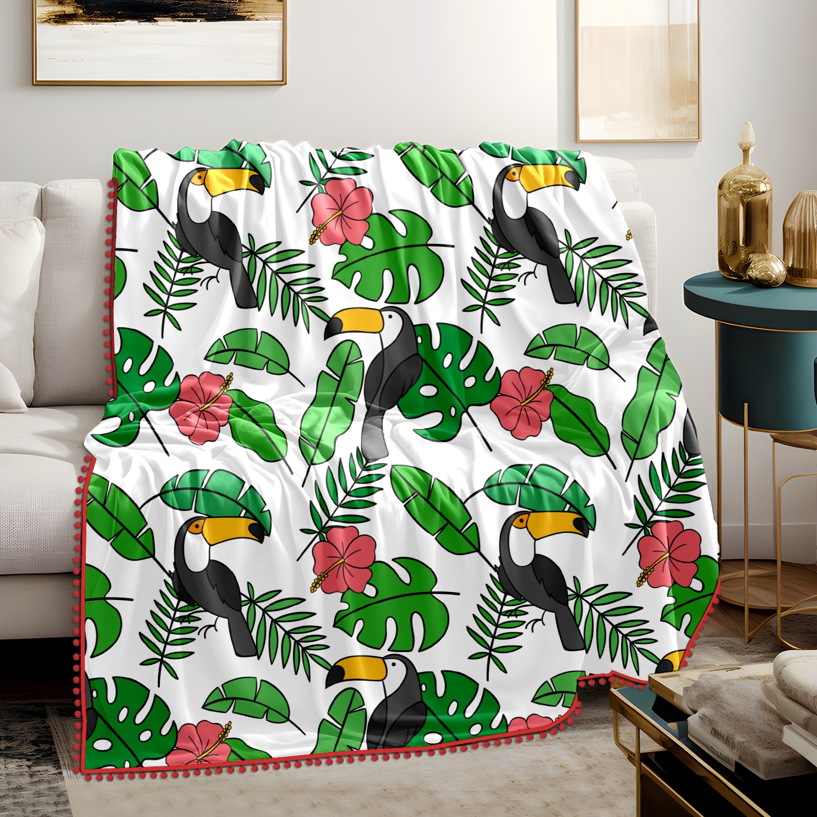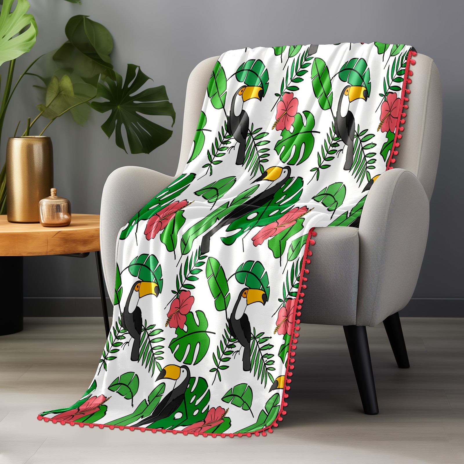 流苏毛毯 Toucan Birds Tropical Palm Leaves
