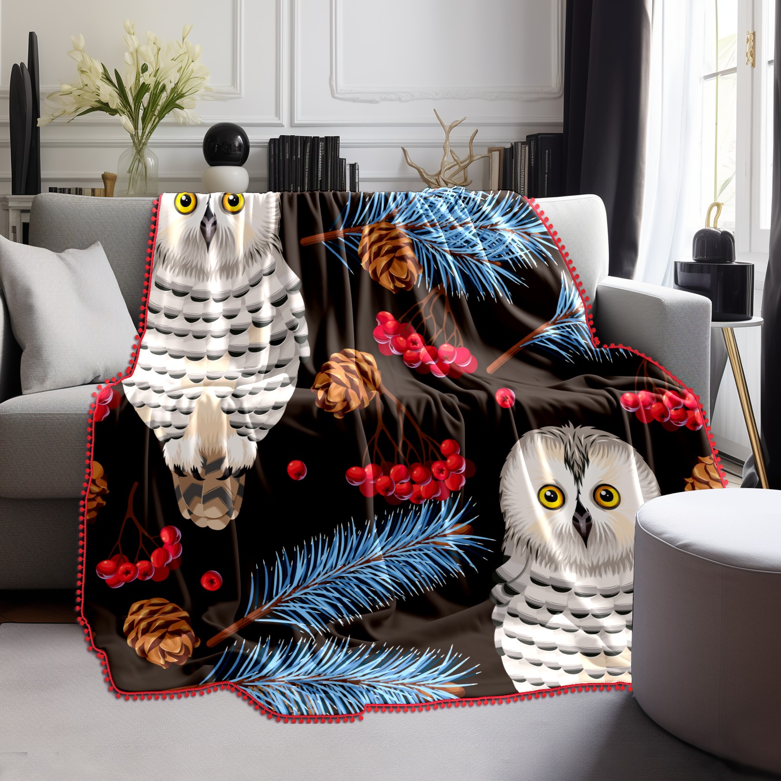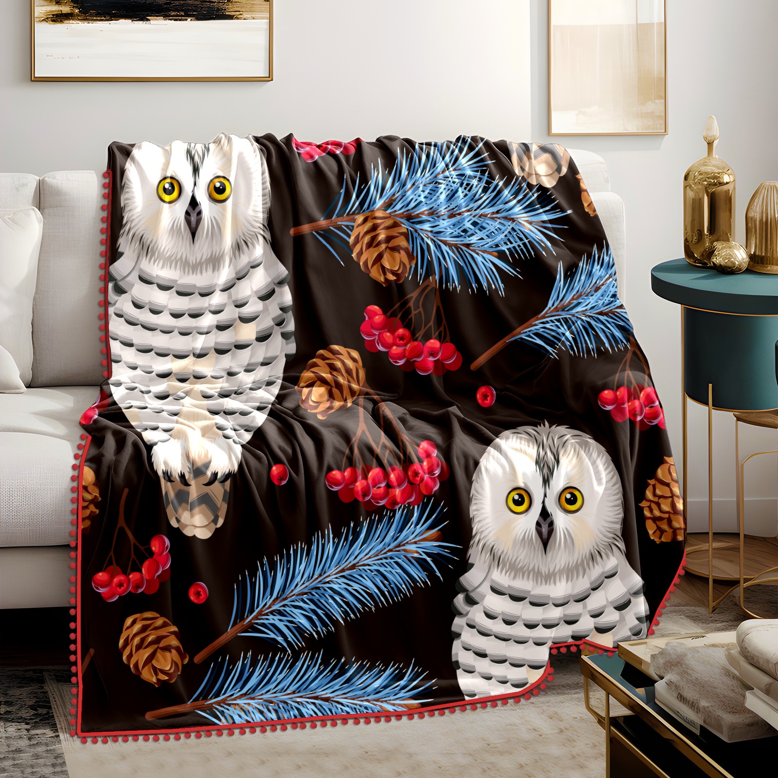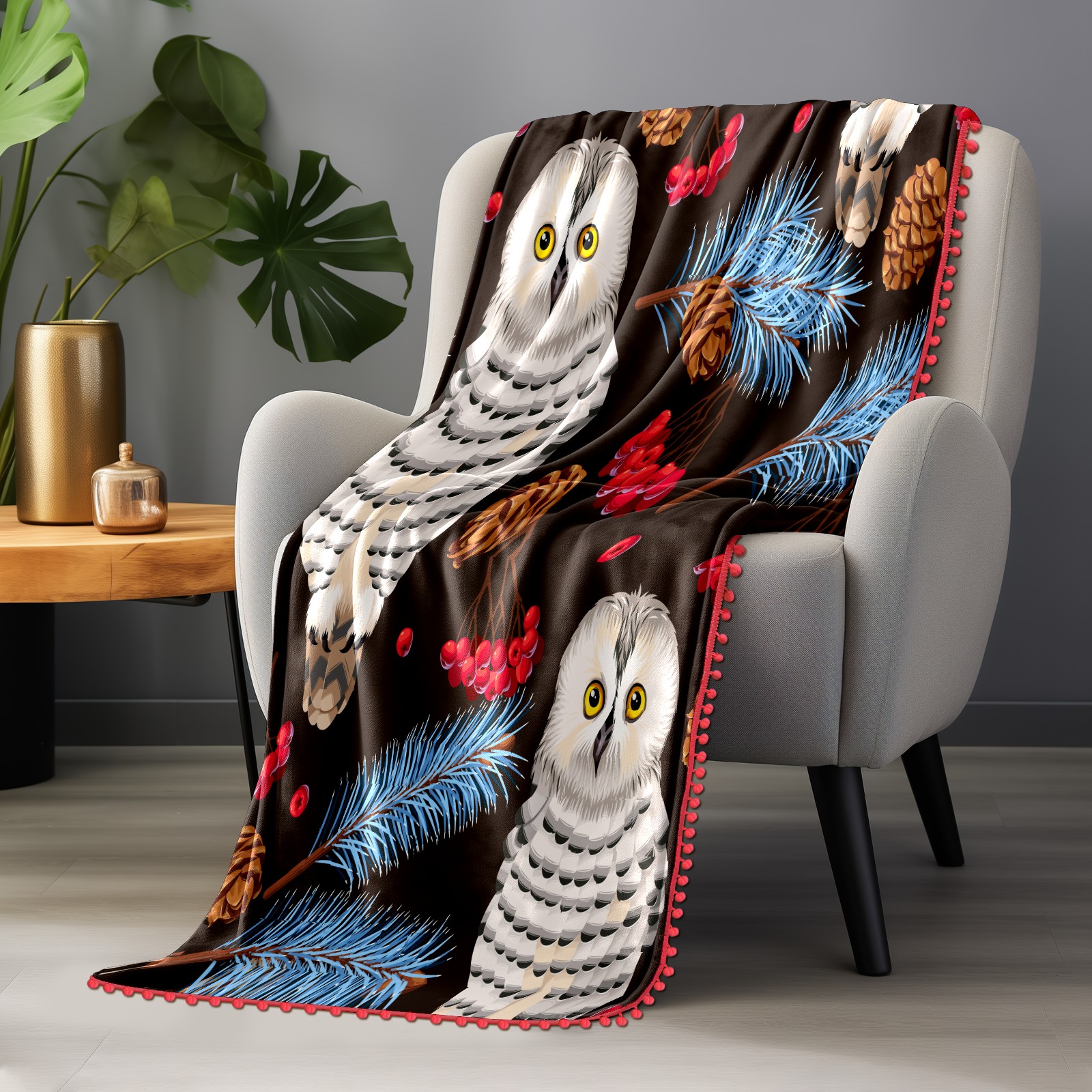 流苏毛毯 Retro Owl Leaves Floral
