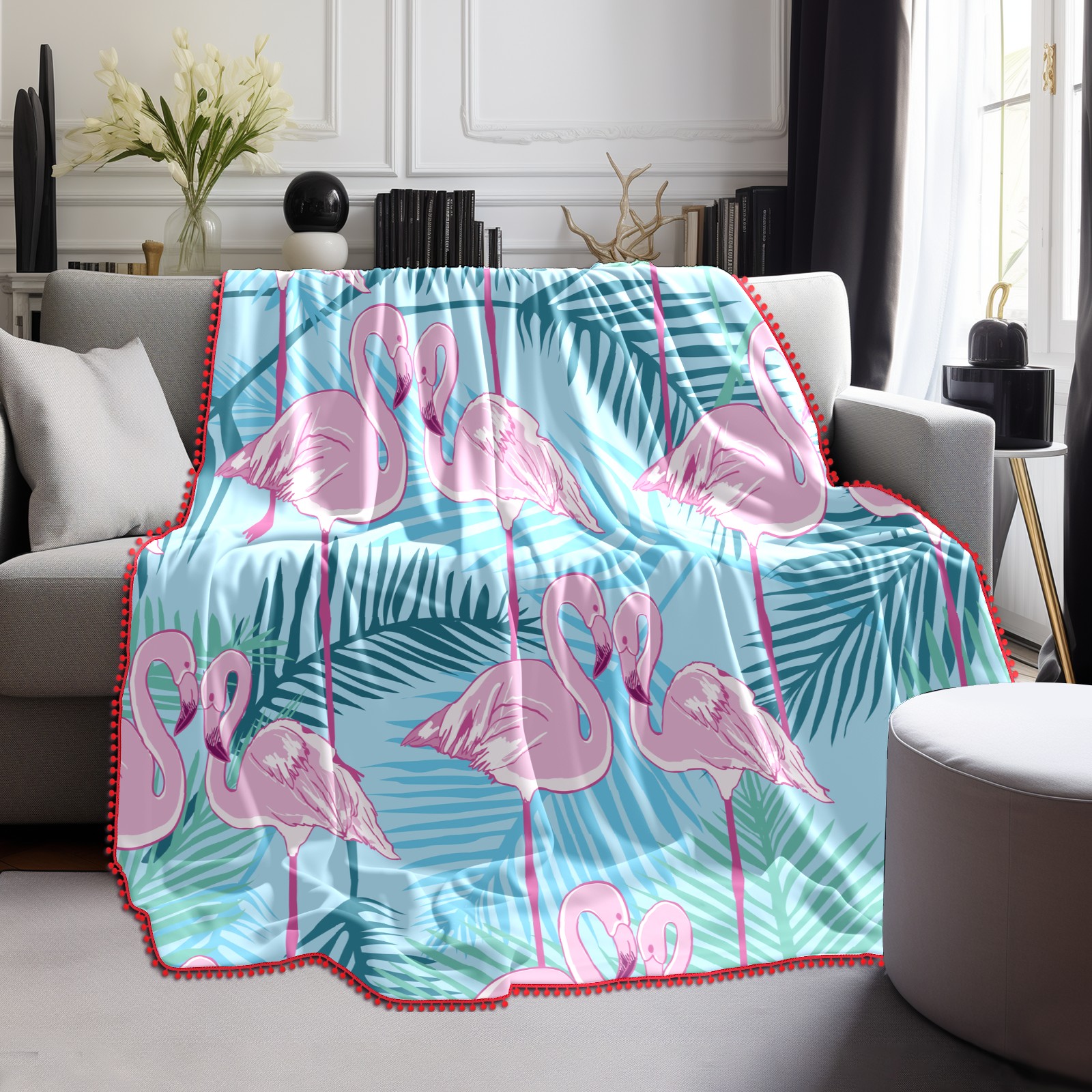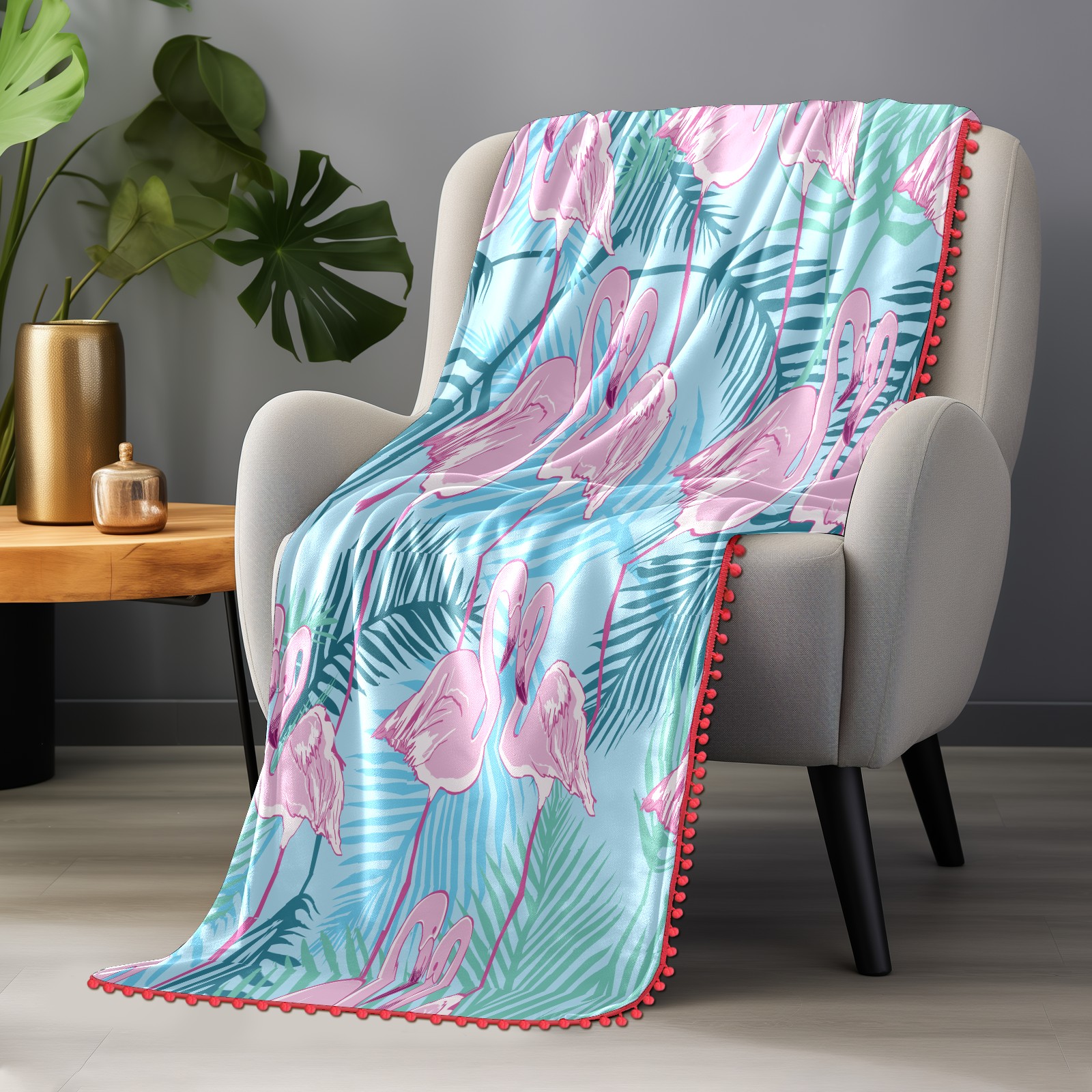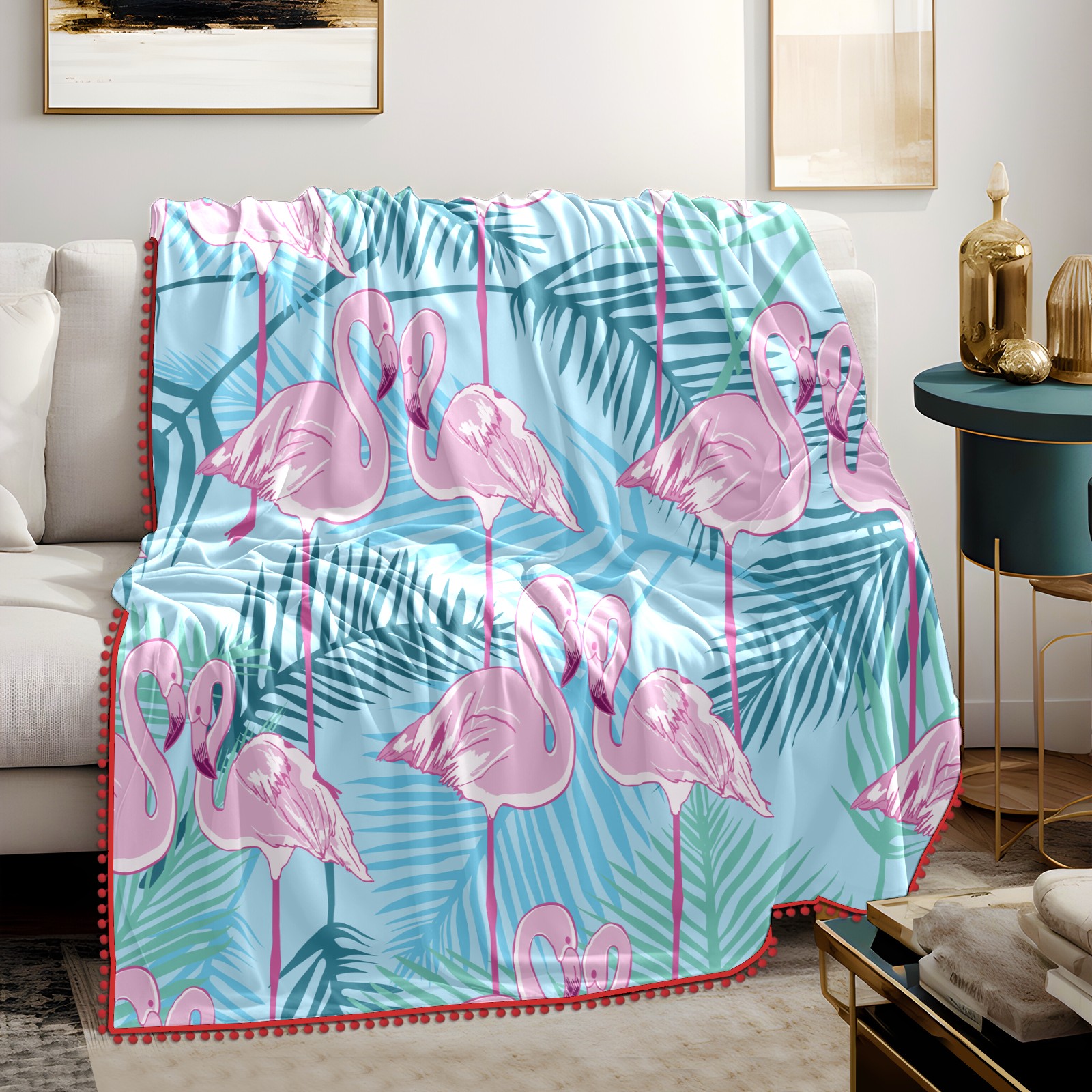 流苏毛毯 Pink Flamingos Green Forest Leaves