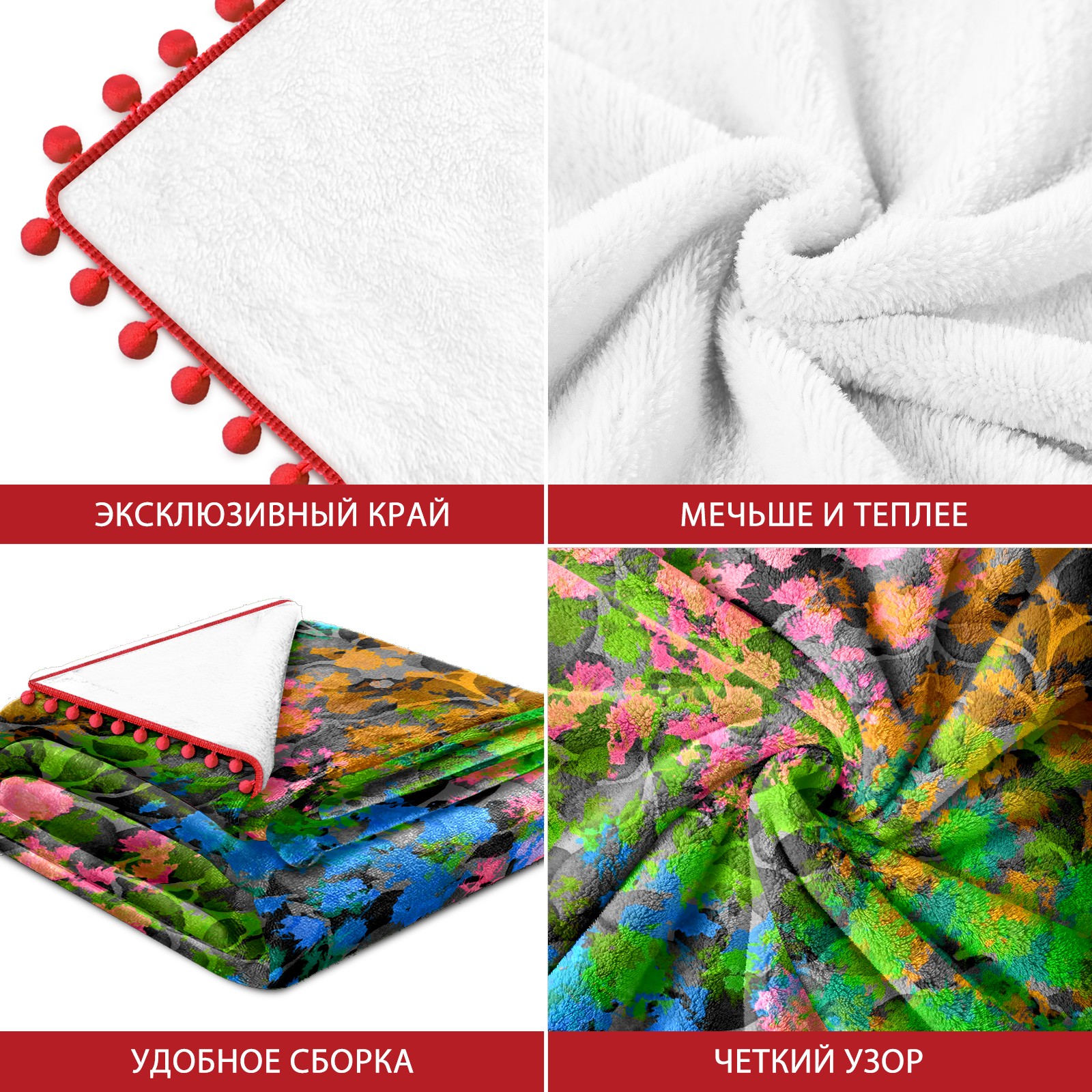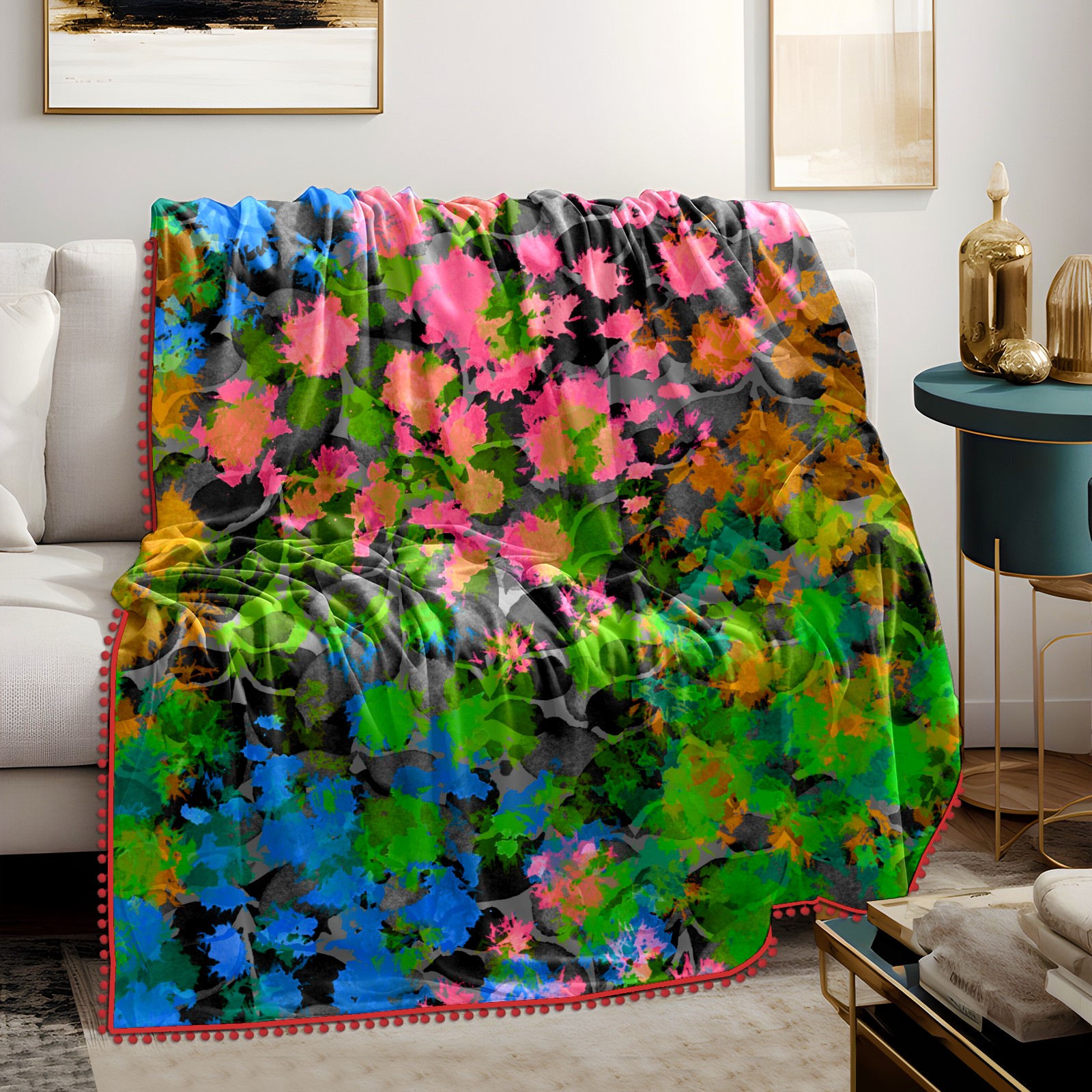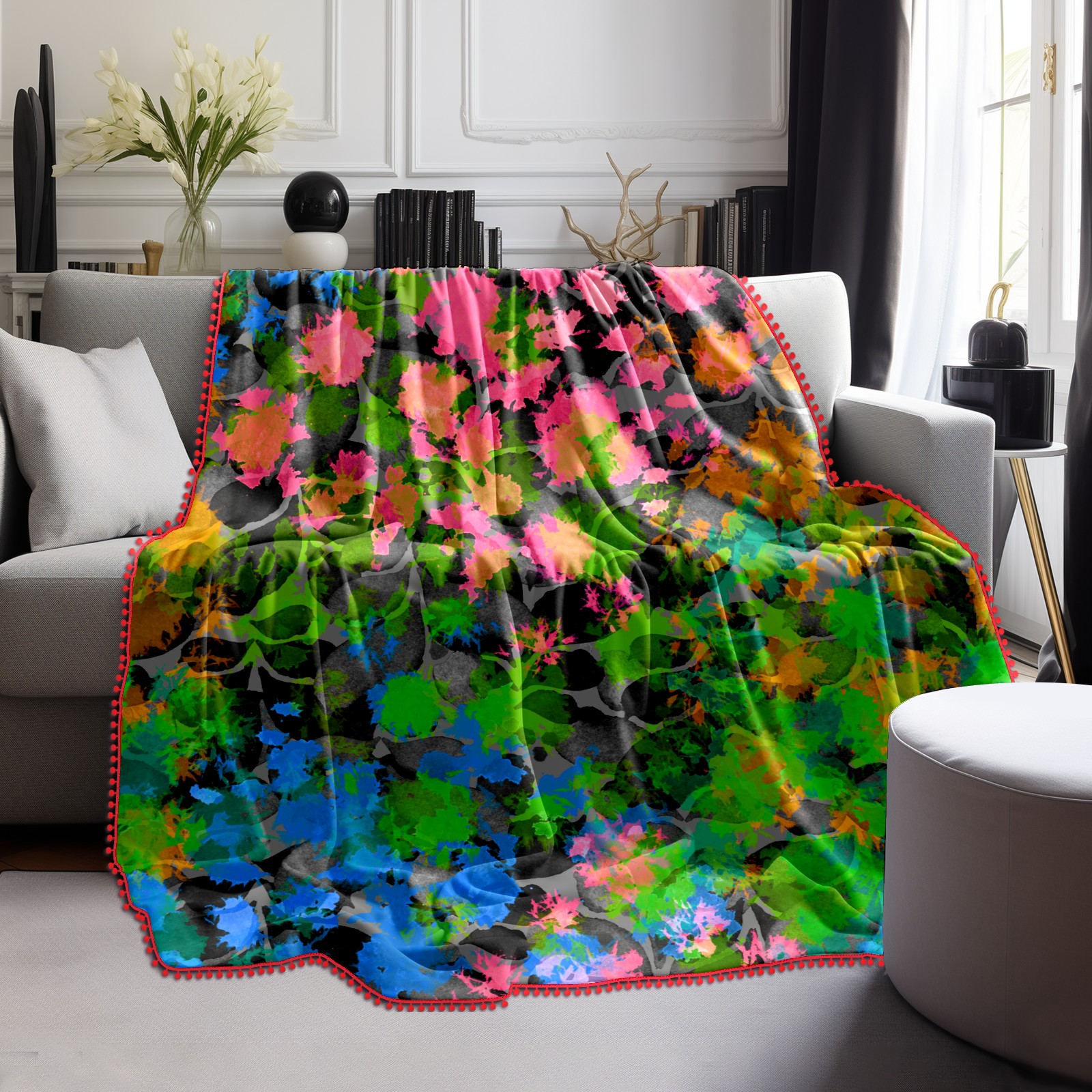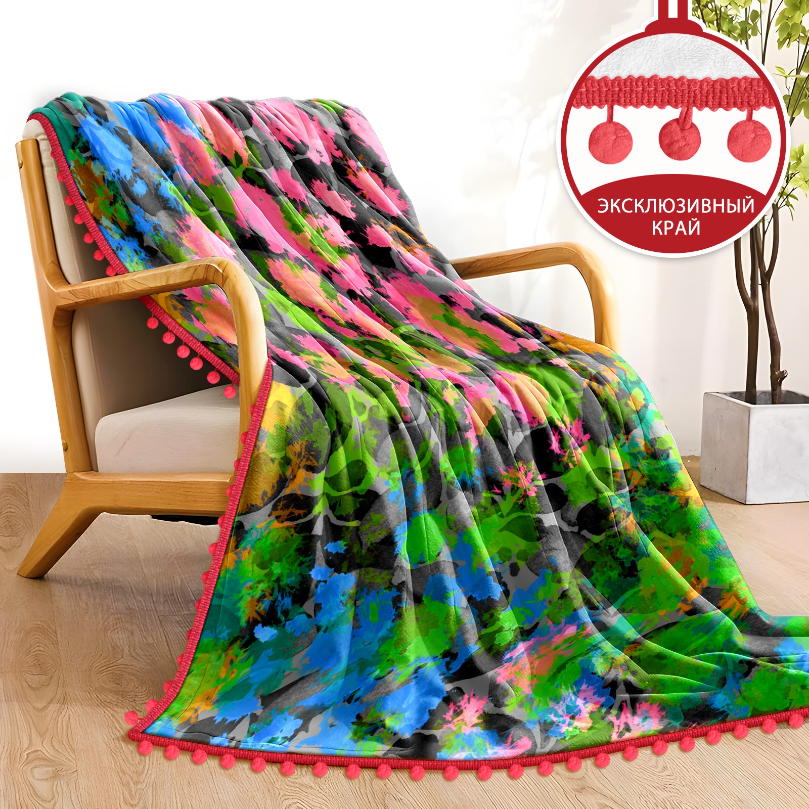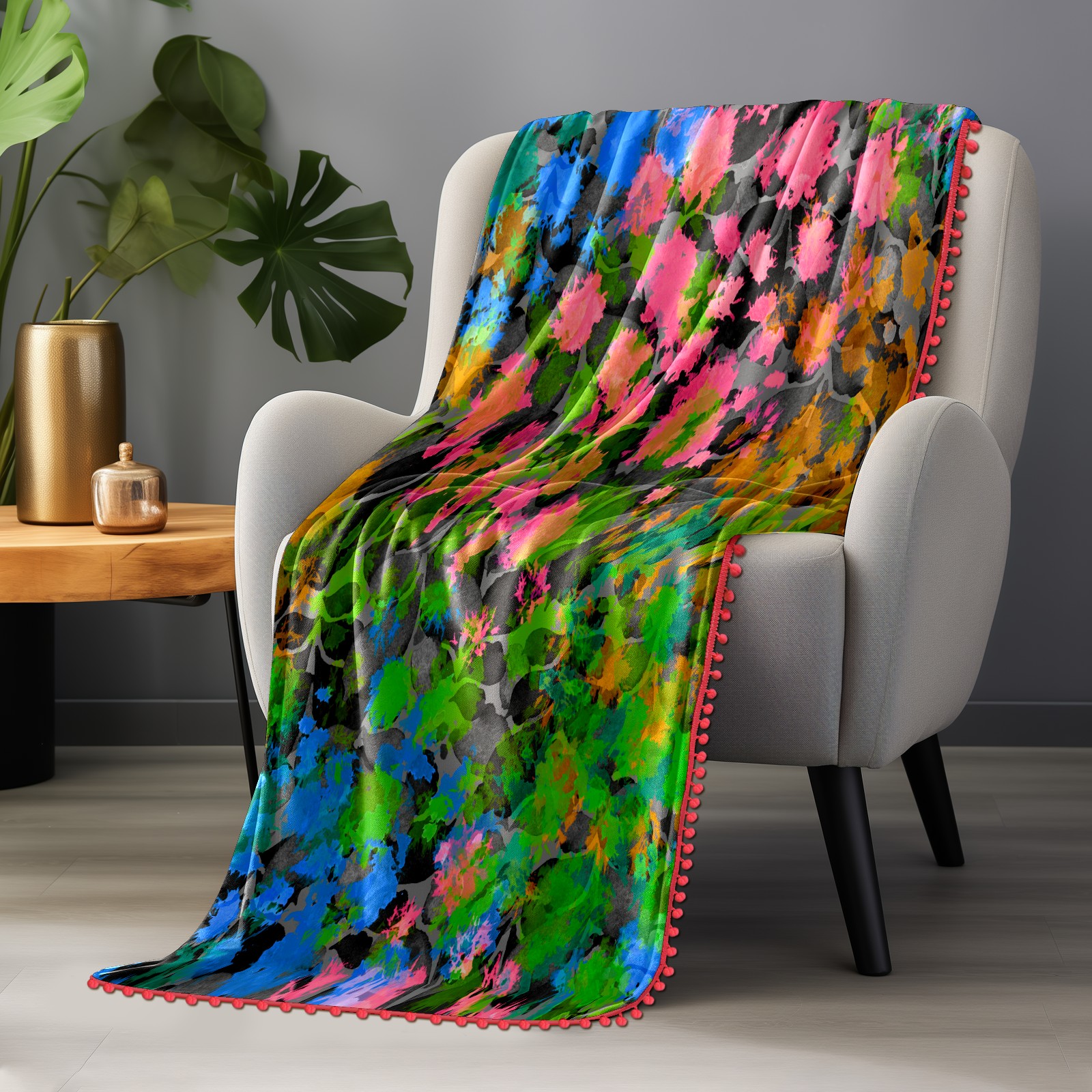 流苏毛毯 Flowers leaves green pink