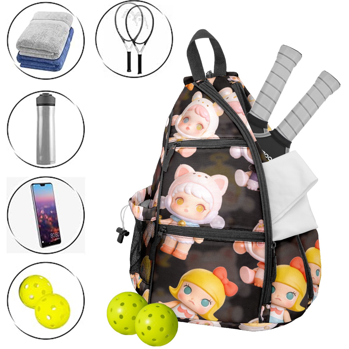 Pickleball Backpack for Women and Men, Adjustable Pickleball Sling Bag for Paddles, Balls & Accessories (创作经典IP图 (69))