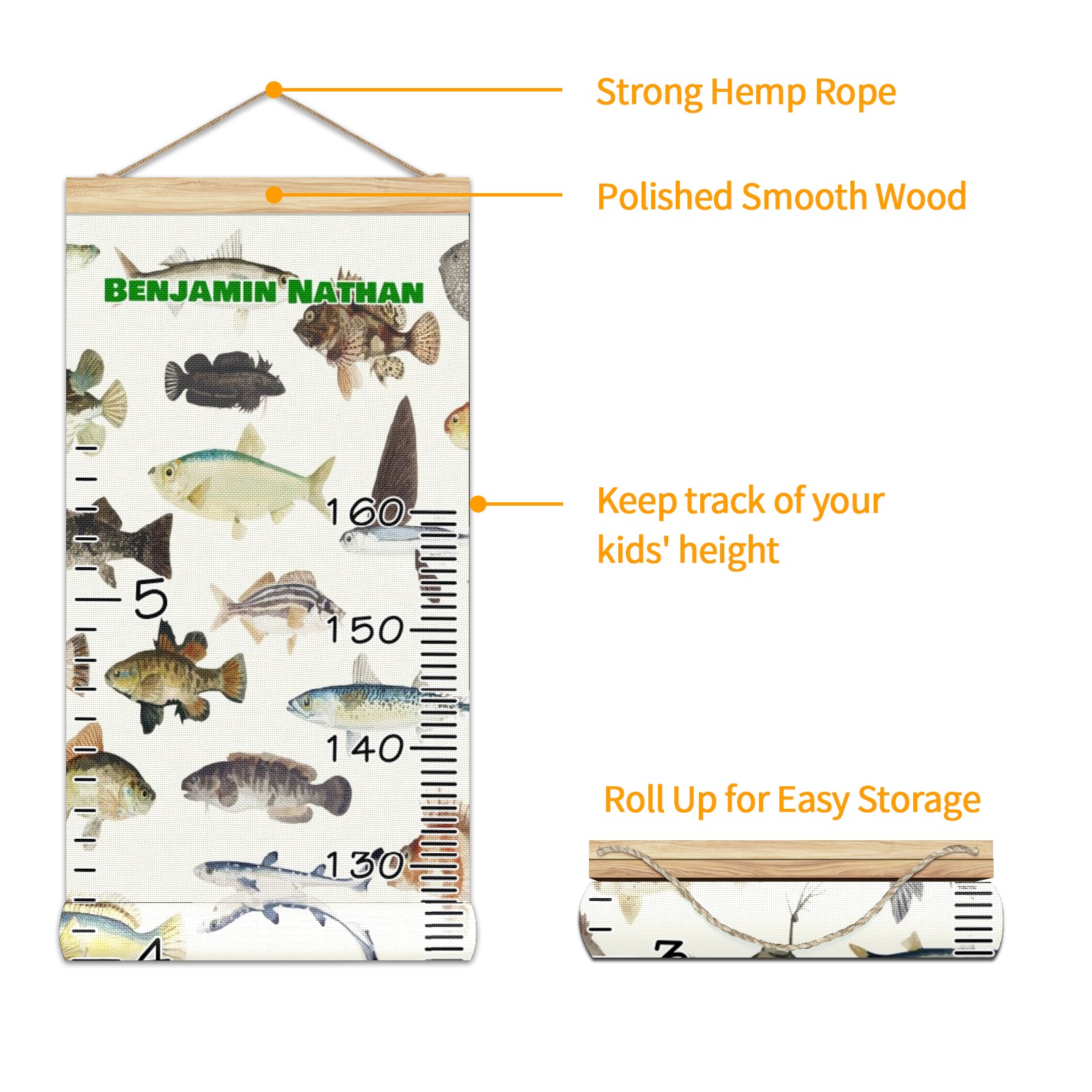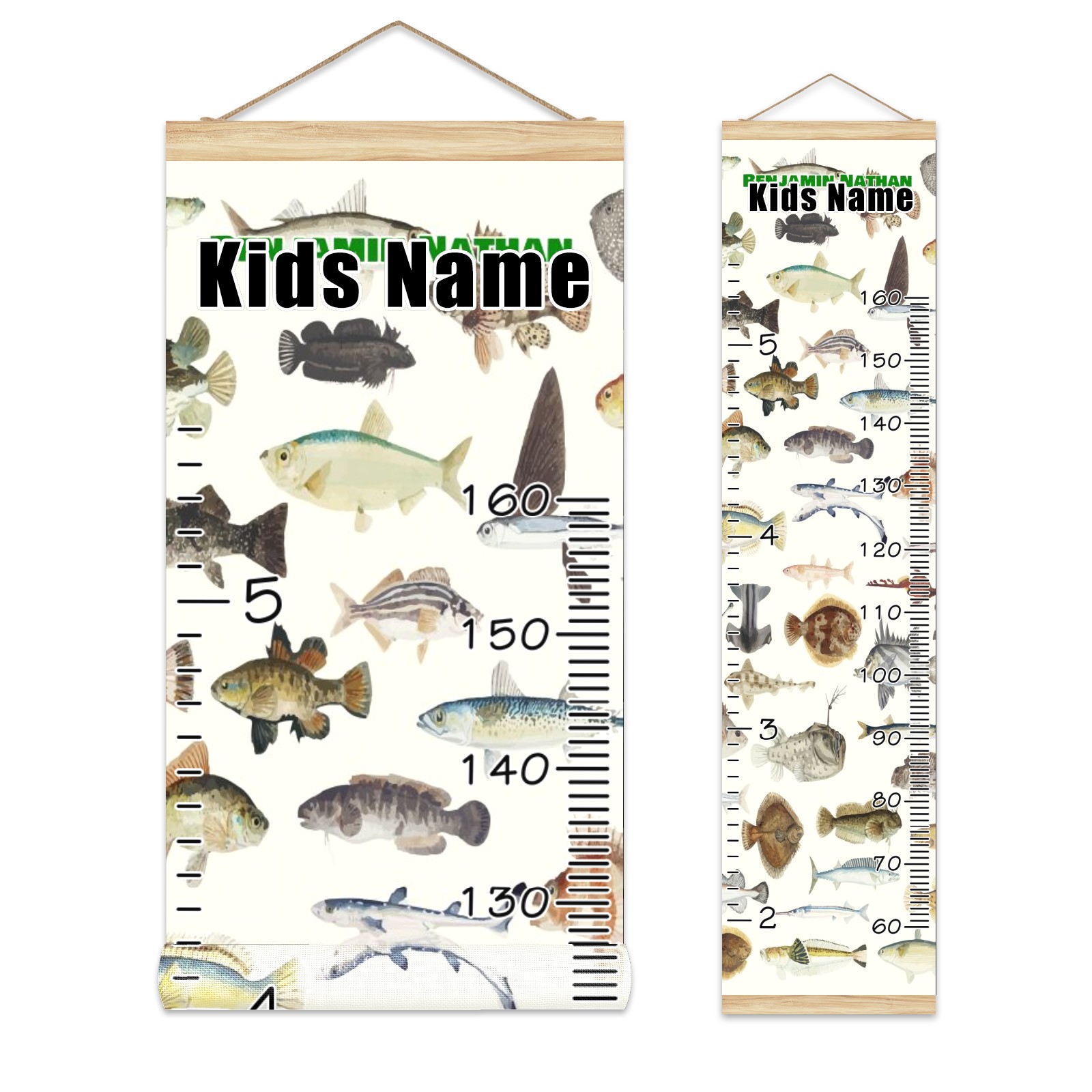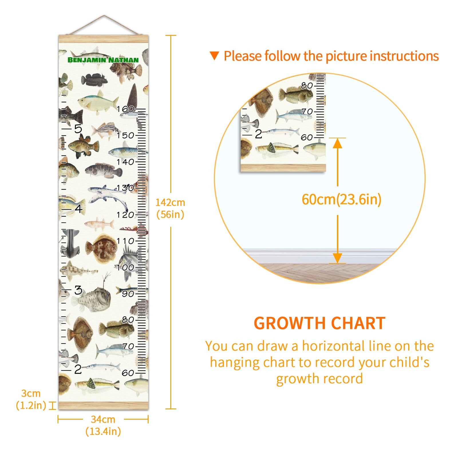 Personalized Kids Name Growth Chart Ruler for Wall Wood Frame Canvas Height Measure Chart 13.4x56 in Hanging Growth Chart Colored Fish Drawing2.13 Boys Girls Room Decor