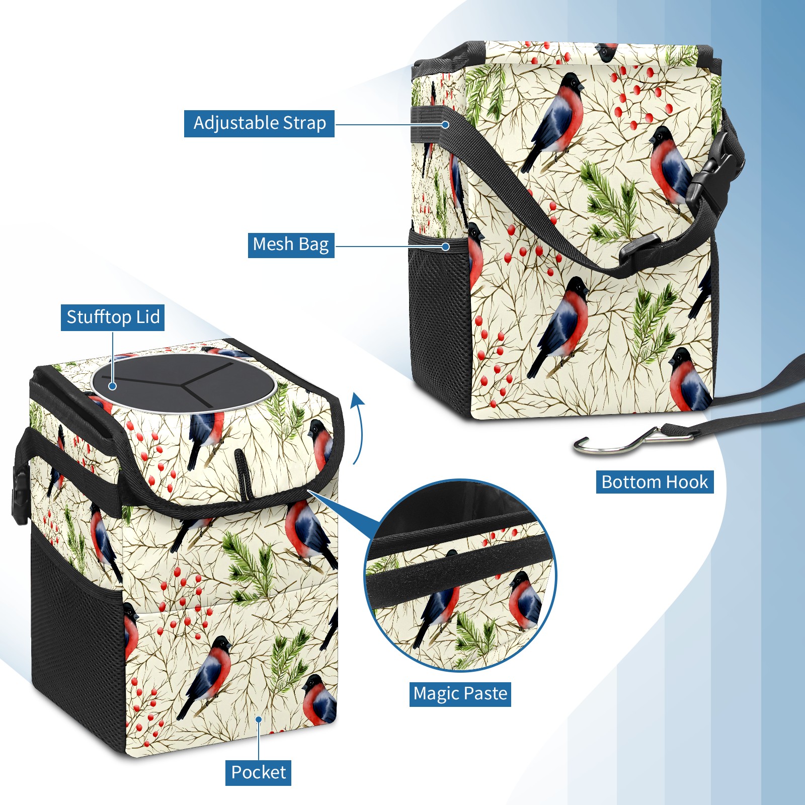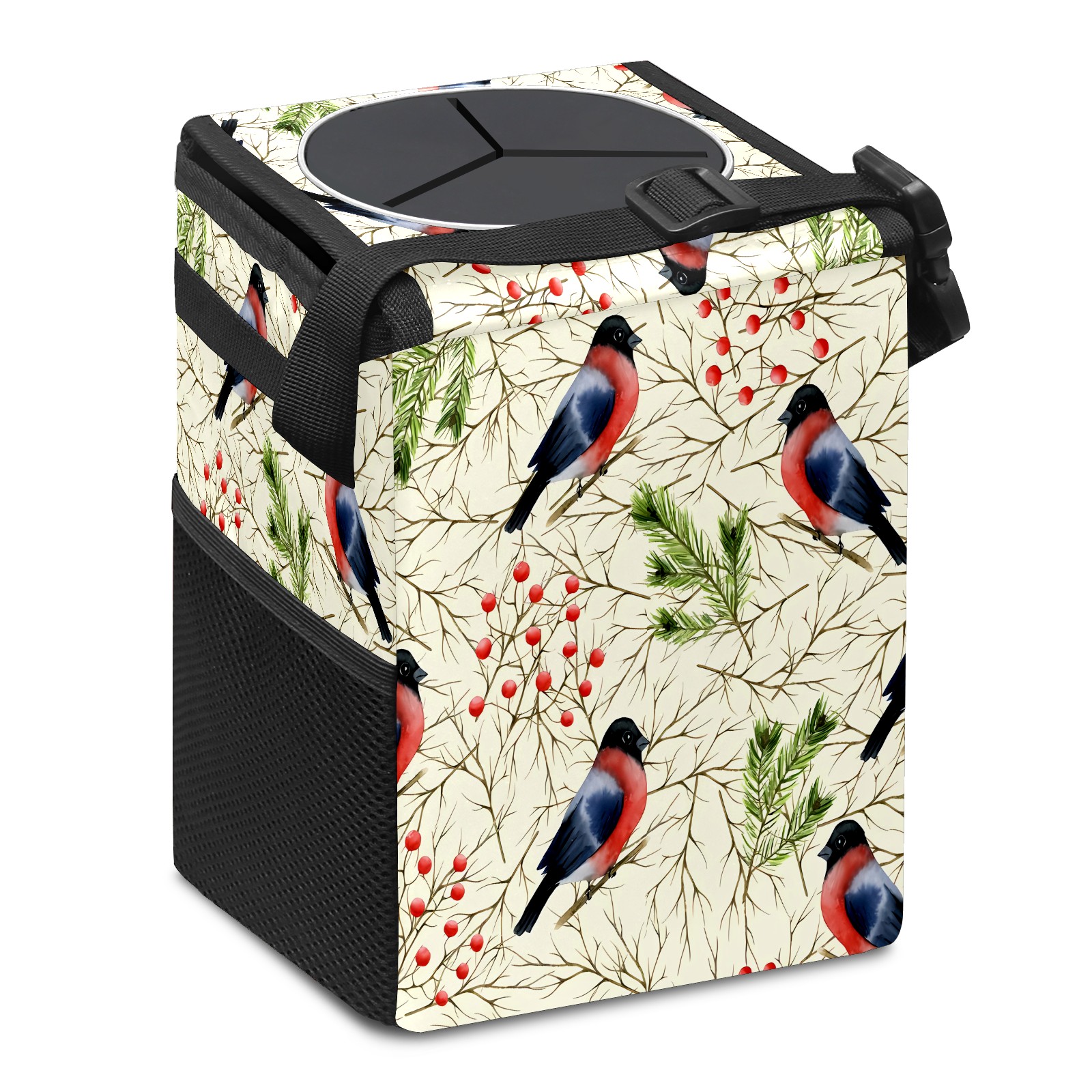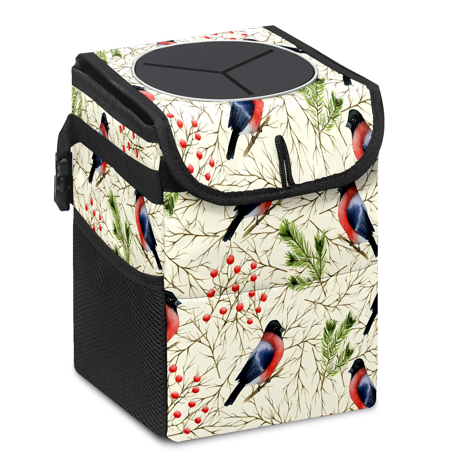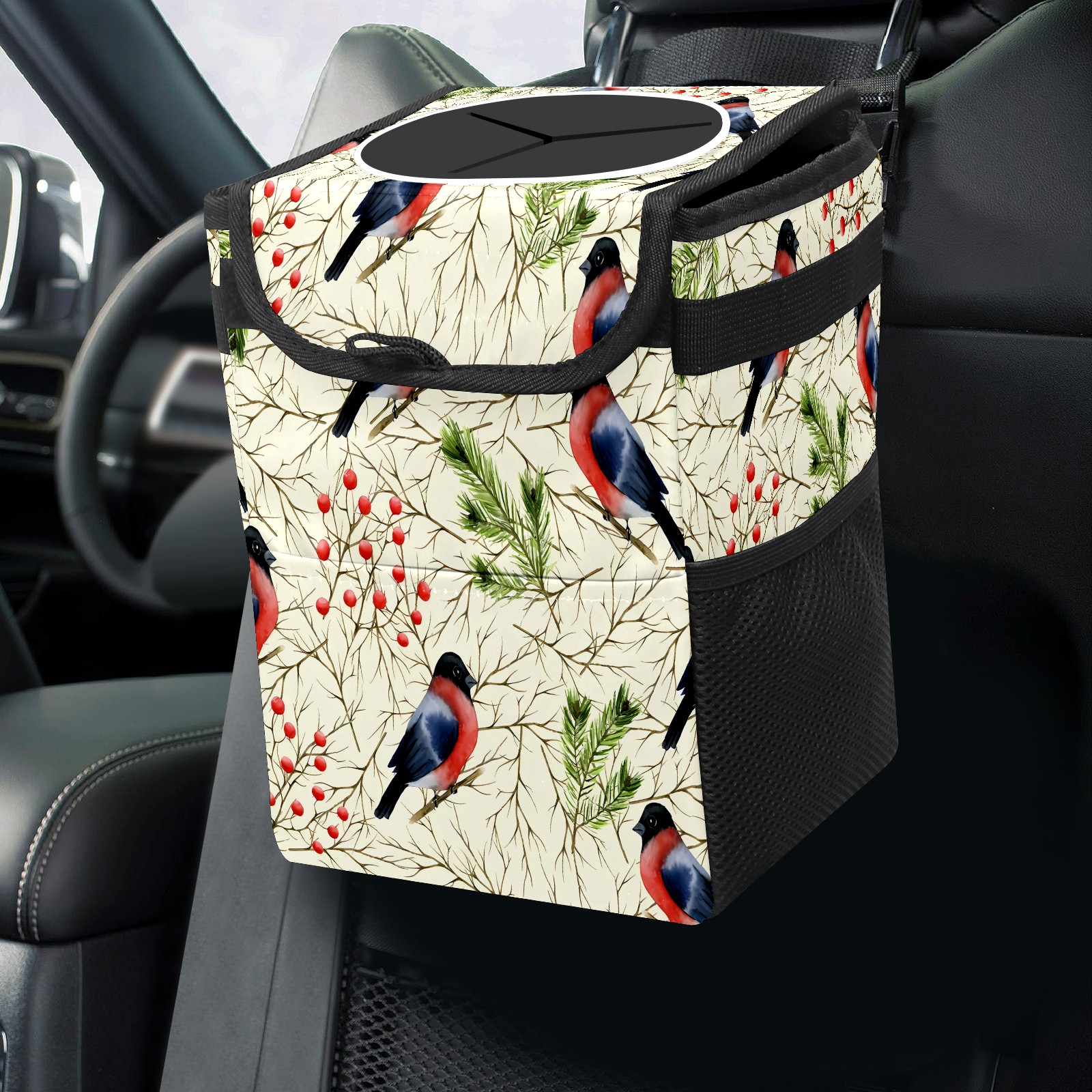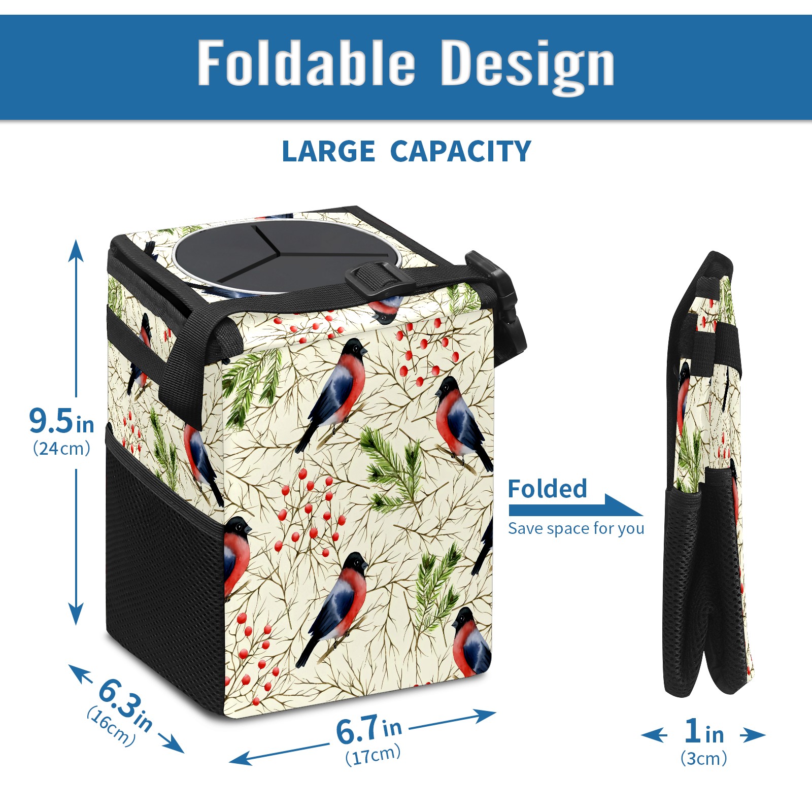 • Эта многофункциональная автомобильная мусорная корзина отличается стильным принтом, сочетающим в себе практичность и эстетику. Изготовленная из высококачественной саржевой ткани с плетеными ремнями, она прочная, долговечная и износостойкая. Размеры корзины составляют 24×17×16 см (9,5×6,7×6,3 дюйма). Верхнее отверстие имеет прорезиненное покрытие для удобной утилизации мусора; боковые сетчатые карманы и передний карман обеспечивают удобное хранение закусок, телефонов и других мелких предметов.