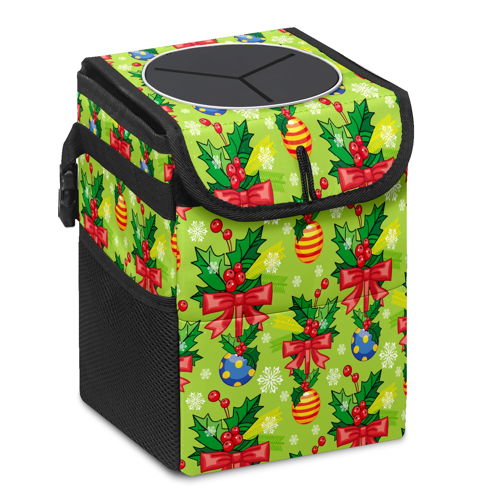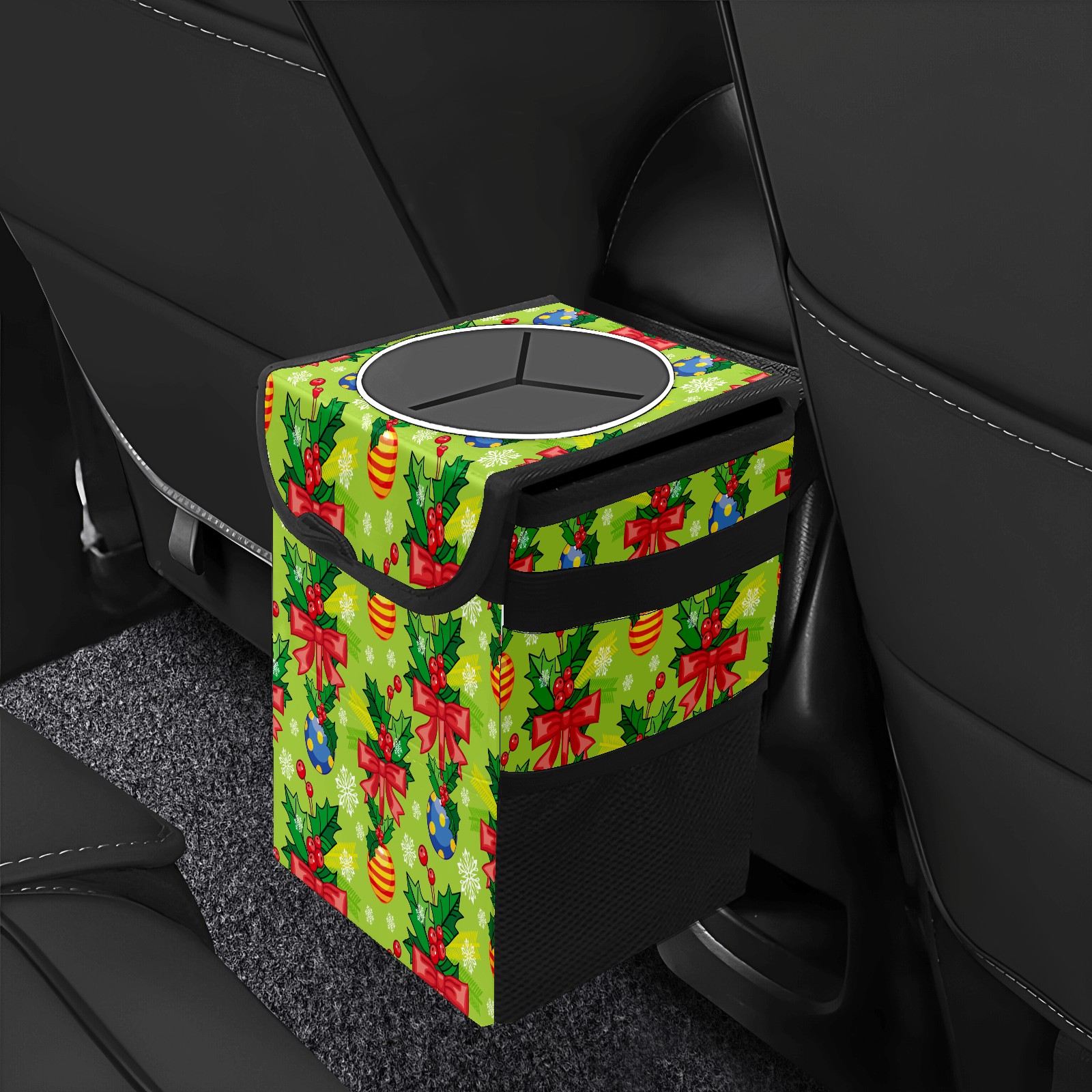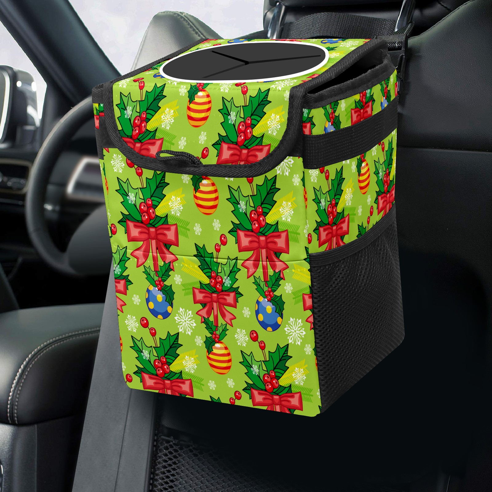 • Эта многофункциональная автомобильная мусорная корзина отличается стильным принтом, сочетающим в себе практичность и эстетику. Изготовленная из высококачественной саржевой ткани с плетеными ремнями, она прочная, долговечная и износостойкая. Размеры корзины составляют 24×17×16 см (9,5×6,7×6,3 дюйма). Верхнее отверстие имеет прорезиненное покрытие для удобной утилизации мусора; боковые сетчатые карманы и передний карман обеспечивают удобное хранение закусок, телефонов и других мелких предметов.
