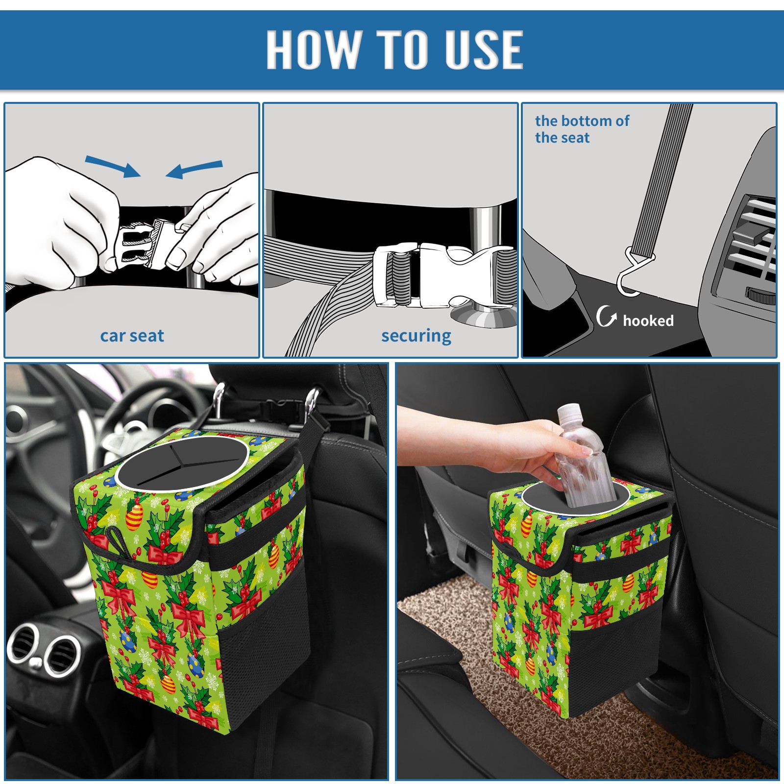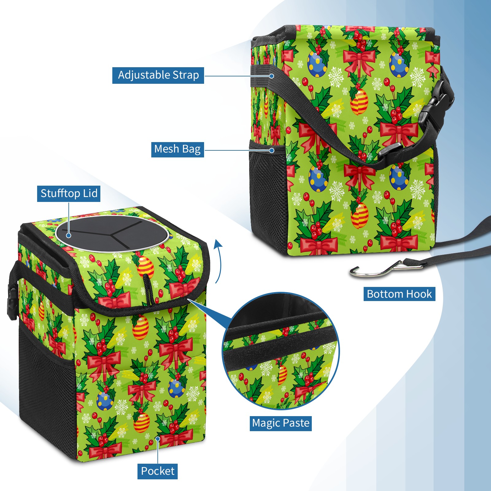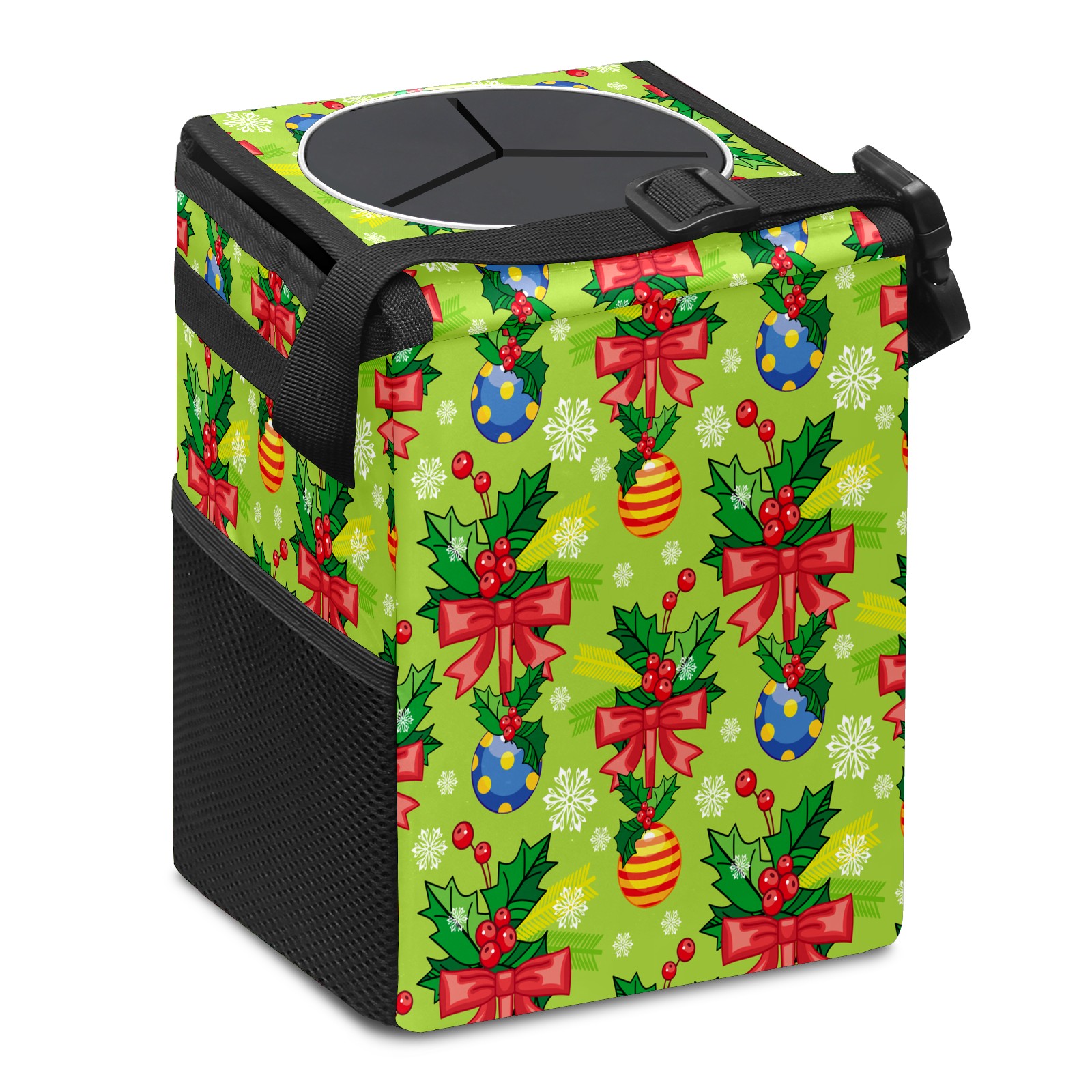 • Эта многофункциональная автомобильная мусорная корзина отличается стильным принтом, сочетающим в себе практичность и эстетику. Изготовленная из высококачественной саржевой ткани с плетеными ремнями, она прочная, долговечная и износостойкая. Размеры корзины составляют 24×17×16 см (9,5×6,7×6,3 дюйма). Верхнее отверстие имеет прорезиненное покрытие для удобной утилизации мусора; боковые сетчатые карманы и передний карман обеспечивают удобное хранение закусок, телефонов и других мелких предметов.
