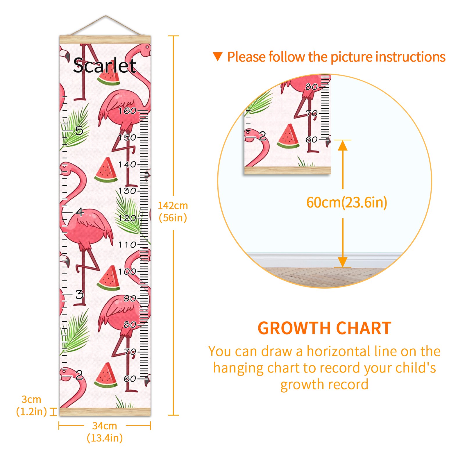 <p><b>Features:</b></p> <p>Rope for Hanging</p> <p>Material: Linen + Wood</p> <p>Dimensions: 13.4x56 inches</p> <p>Package Included: 1 * Baby Growth Chart</p> <p><b>Baby height growth chart can be used anywhere</b></p> <p>Ideal for kids nursery decoration, kids bedroom, interior walls or windows, playroom, living room, homedecoration.Add name and make the growth chart special!</p> <p><b>Easy to fold and carry</b></p> <p>With rope at the top of the growth chart, it is easy to install and remove.You can fold it and unfold any time any where.</p> <p><b>Perfect Gift Idea for Kids</b></p> <p>Environmental and non-toxic for kids use, it must be a perfect gift for baby, kids, girls, and boys.This is a best choice for your friend who have kids or baby as a popular gift.</p> <p><b>Easy to read</b></p> <p>Measurement accrate with 2 scales, Centimeters and feet. The letters are big enough, very easy to read.</p> <p><b>60cm(23.6inch) Over Ground Design</b></p> <p>Not only can protect from dust and other damage, but also will not interfere in floor cleaning.</p>