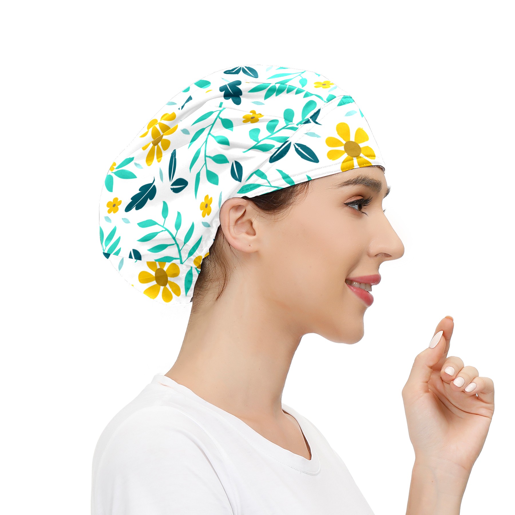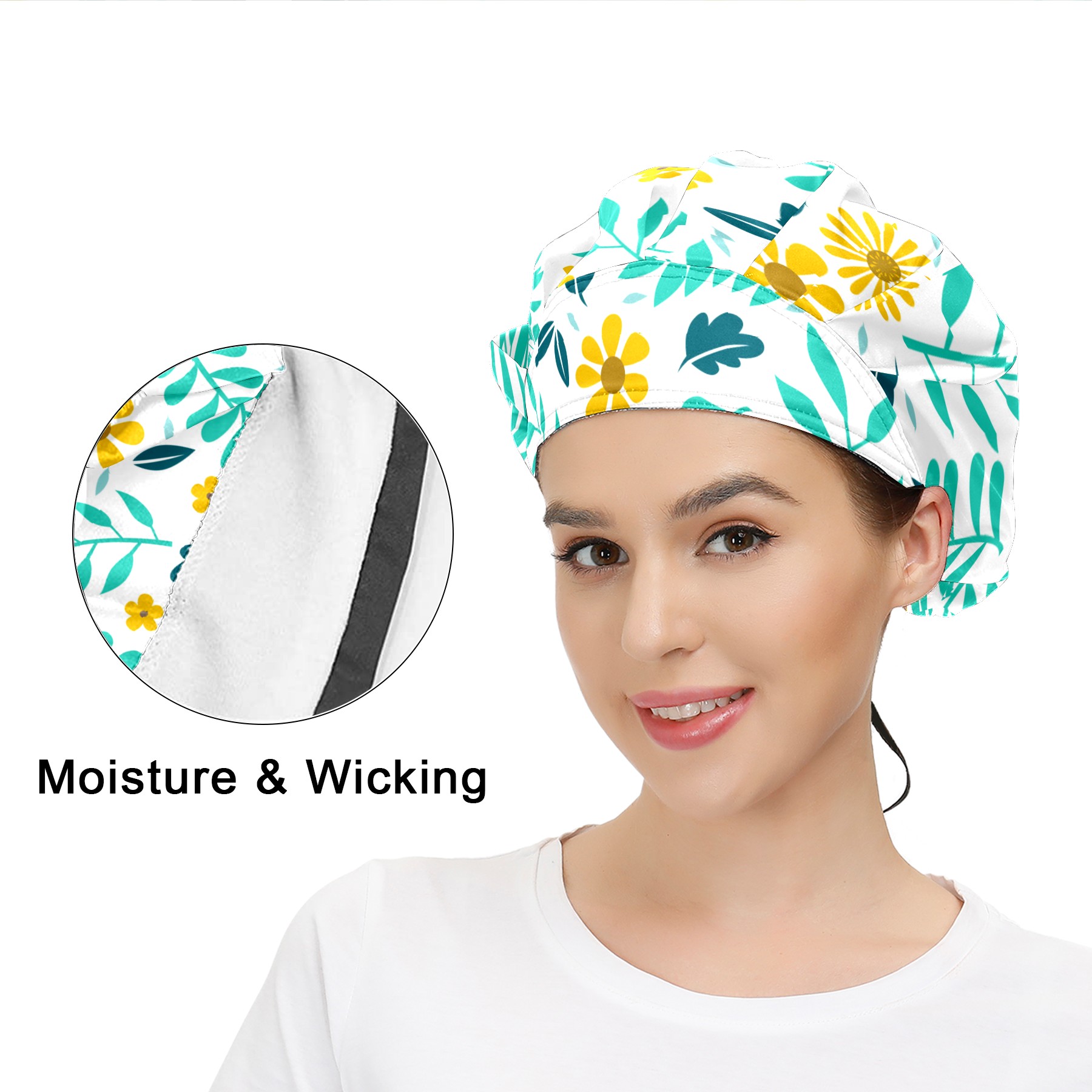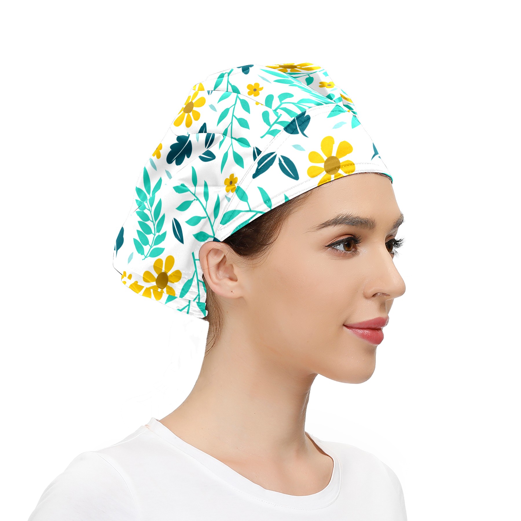 Yellow Floral Pattern Bouffant Scrub Cap Tie Back Nurse Caps Scrub Hats for Women Men Adjustable Working Cap Hat with Cotton Sweatband
