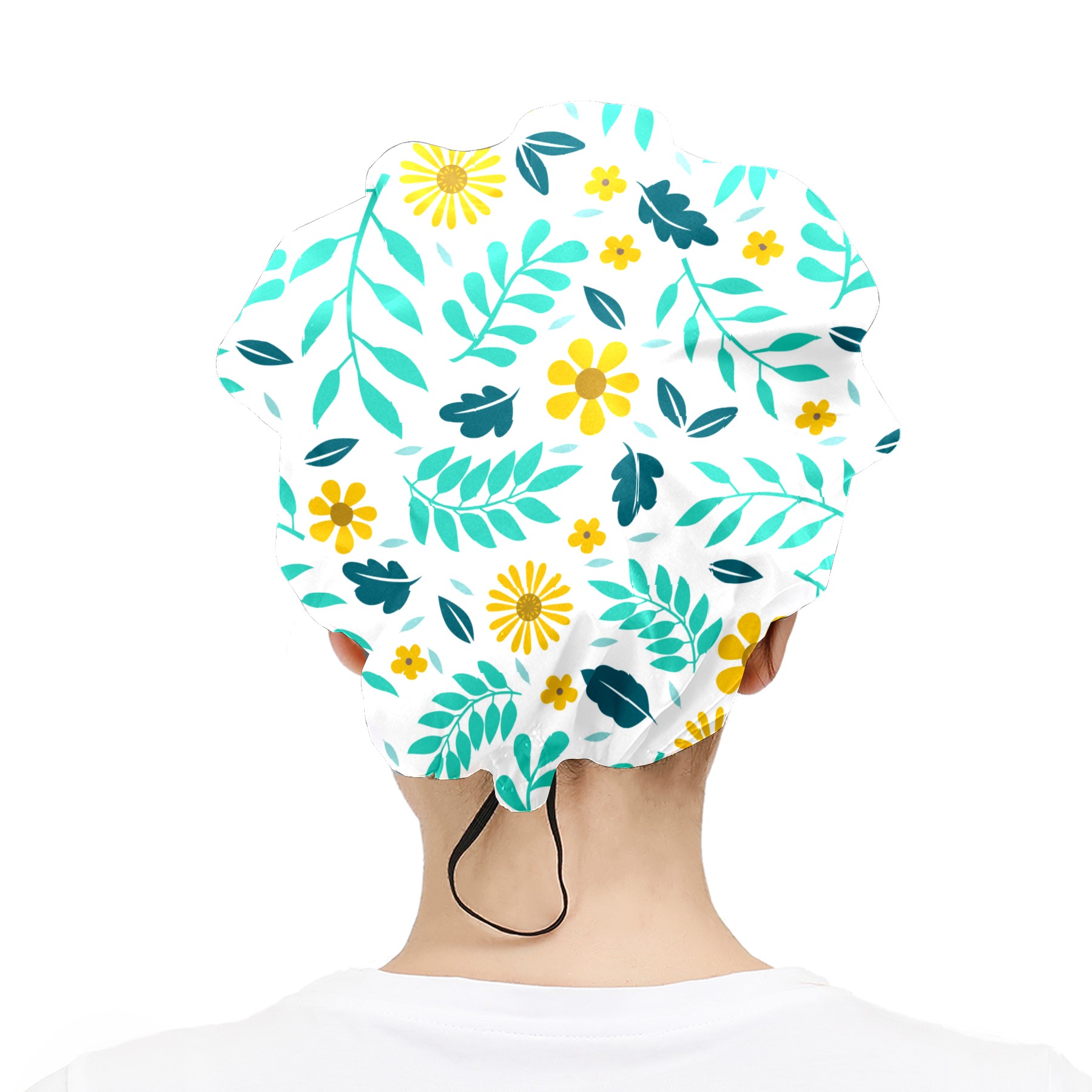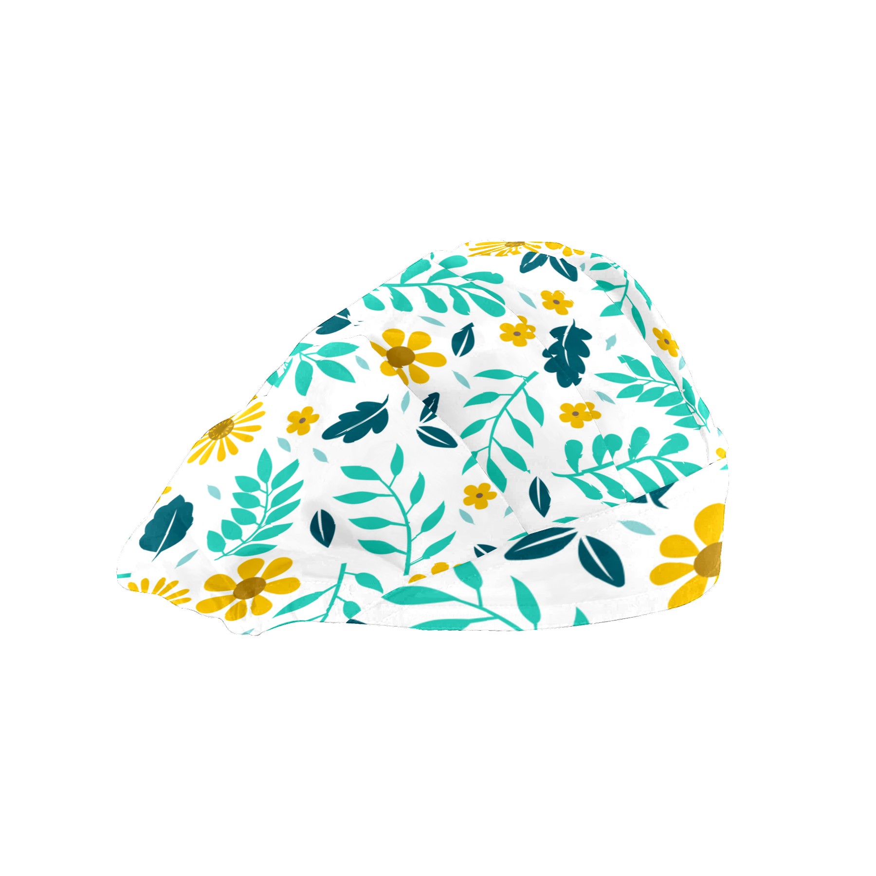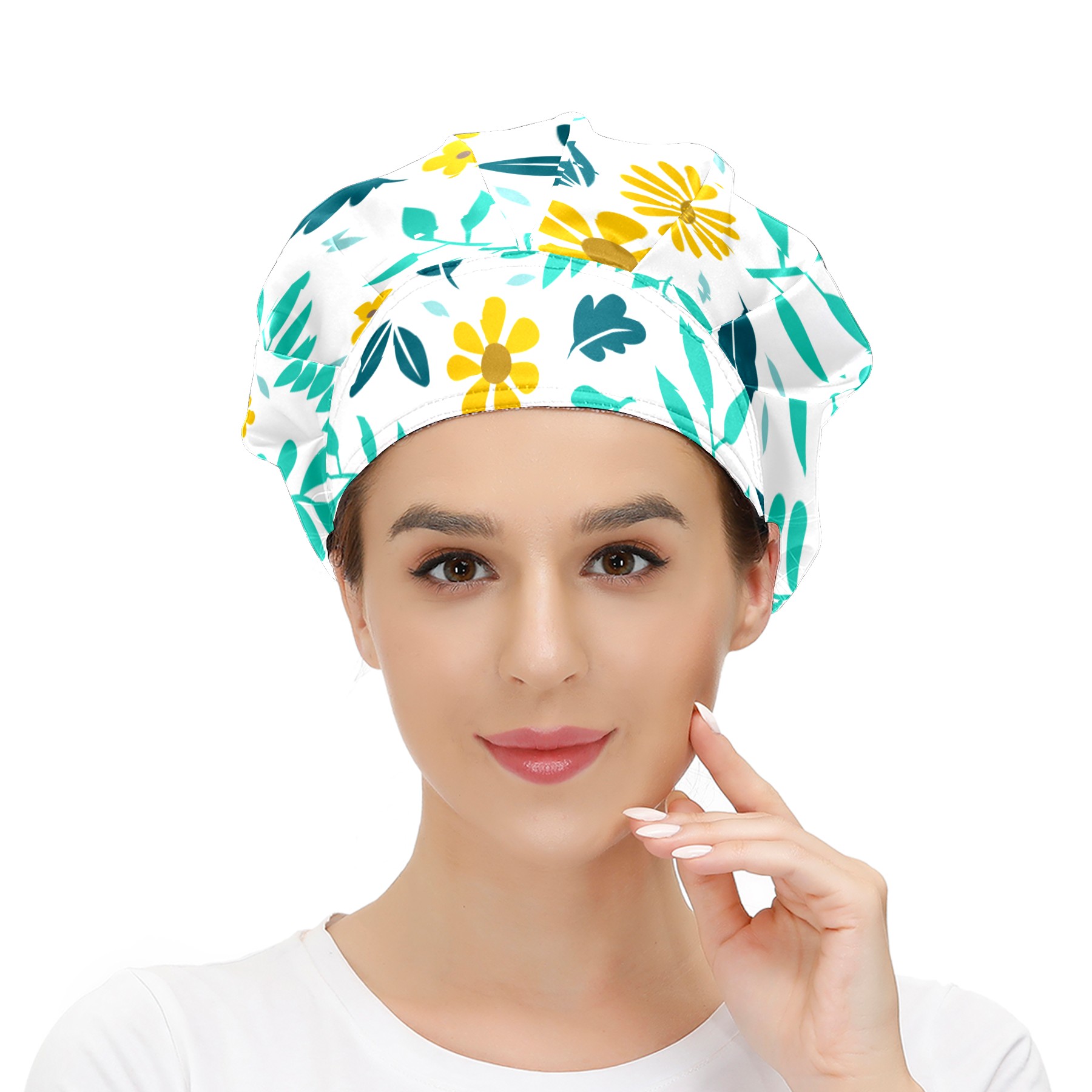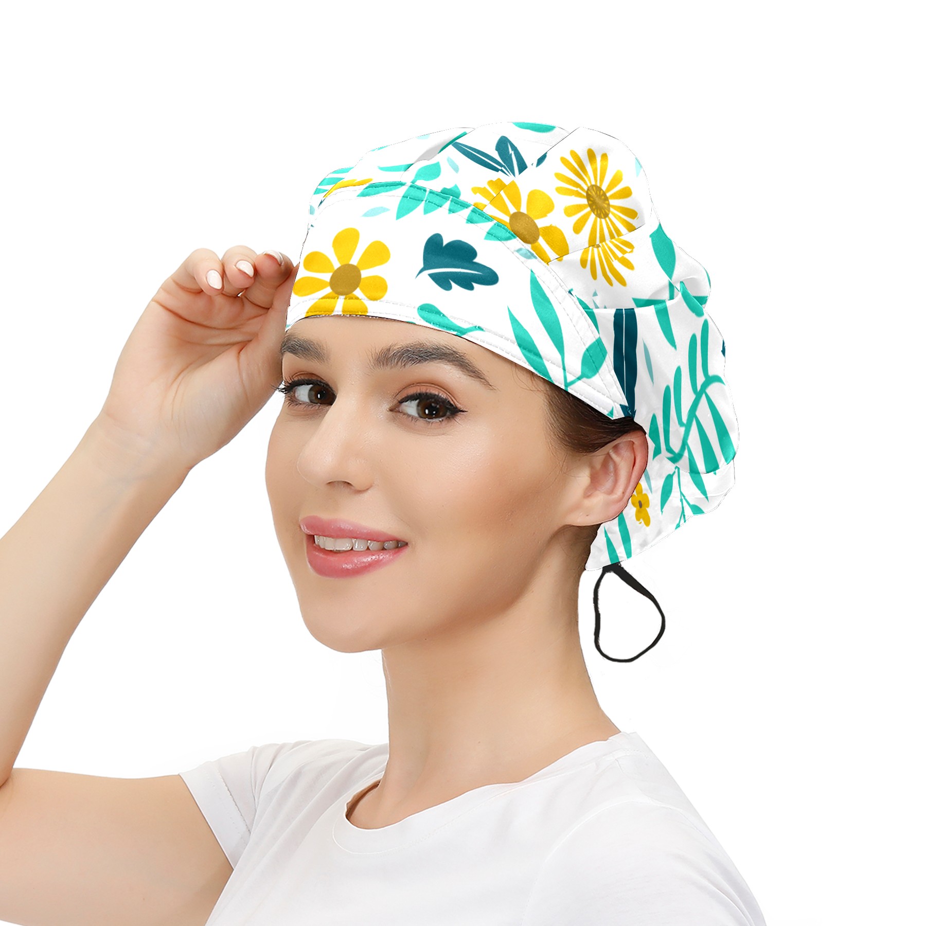 Yellow Floral Pattern Bouffant Scrub Cap Tie Back Nurse Caps Scrub Hats for Women Men Adjustable Working Cap Hat with Cotton Sweatband