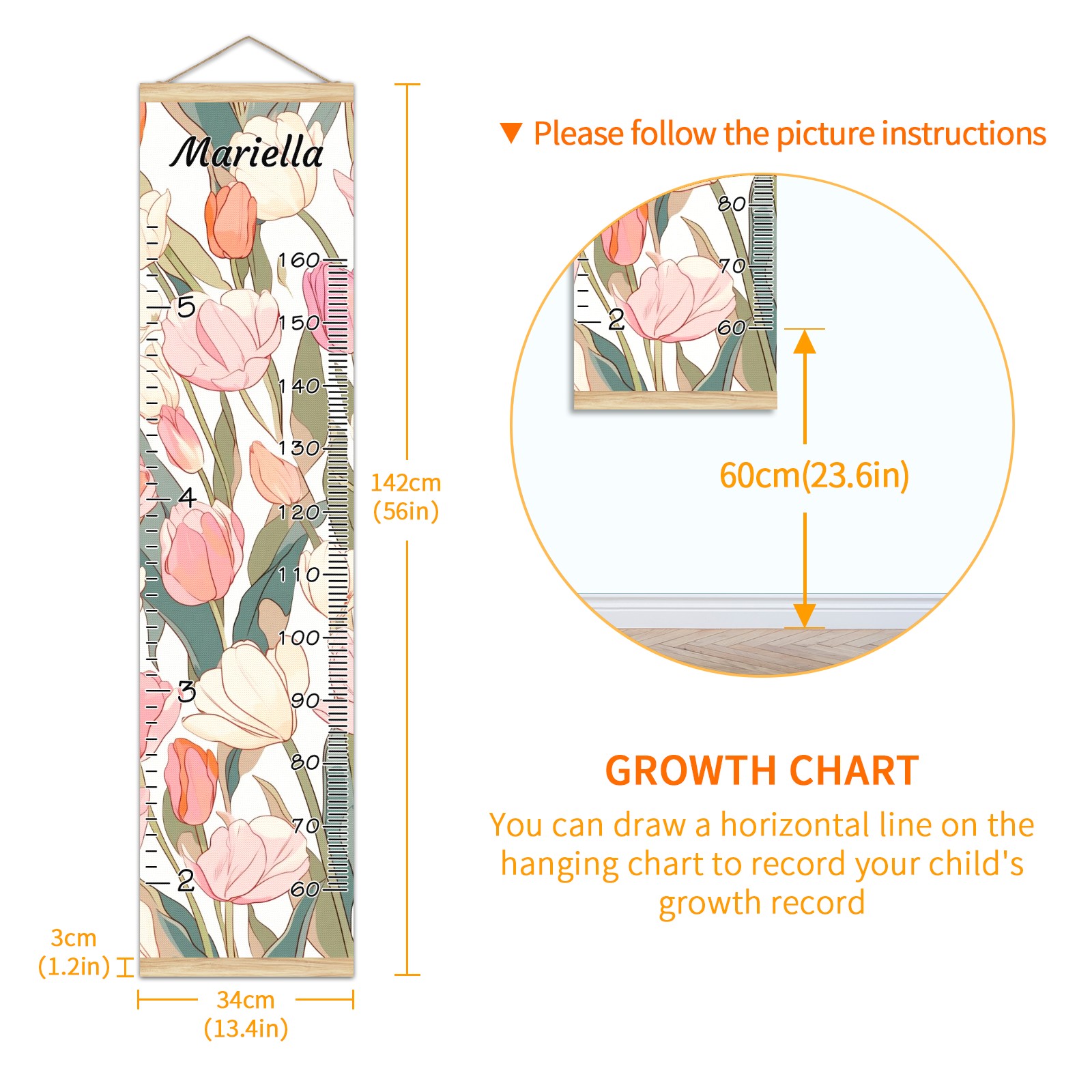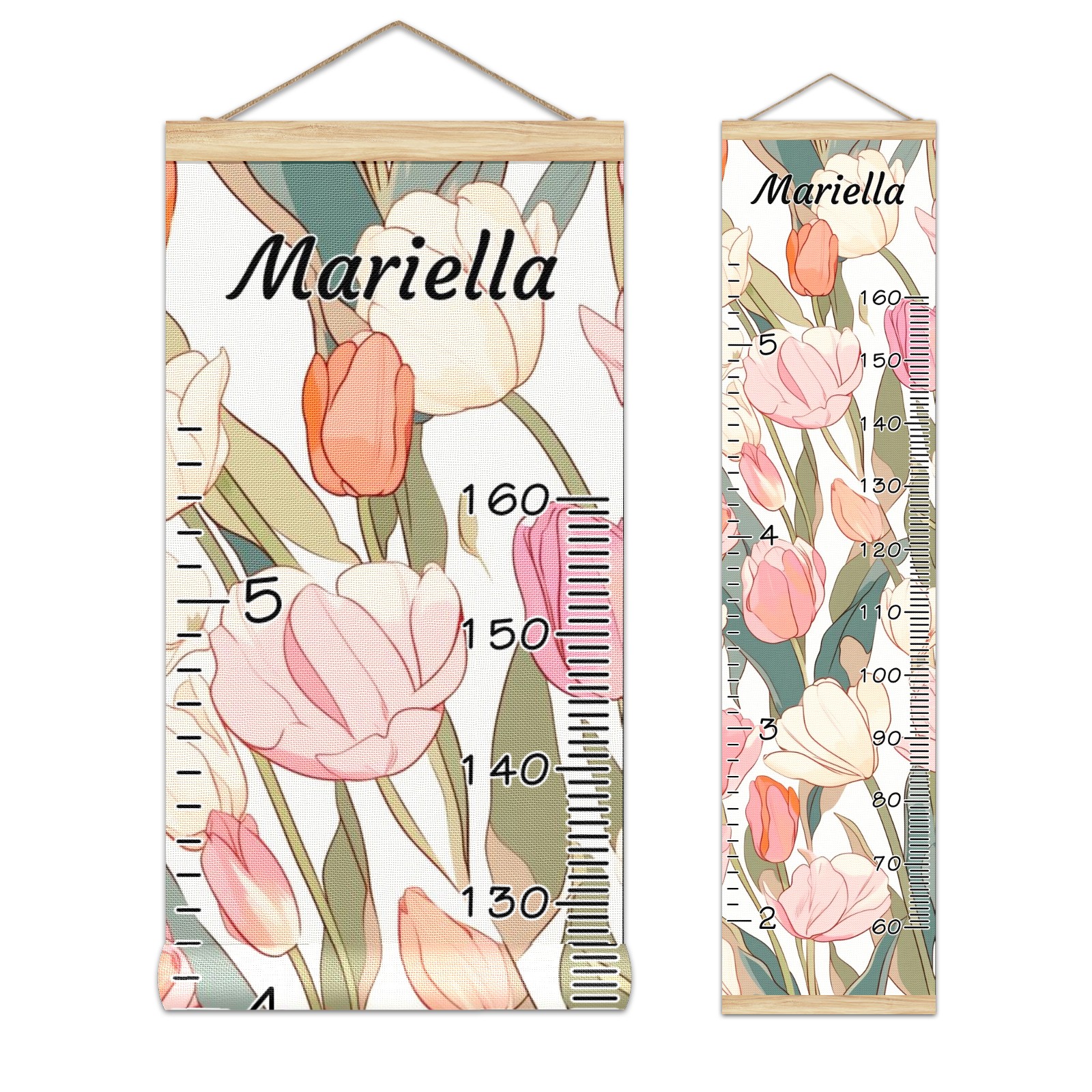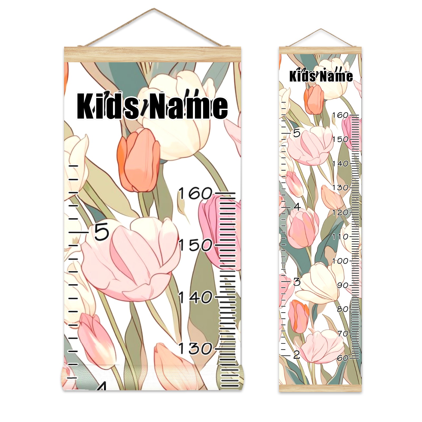 Personalized Kids Name Growth Chart Ruler for Wall Wood Frame Canvas Height Measure Chart 13.4x56 in Hanging Growth Chart Tulips3.3 Boys Girls Room Decor