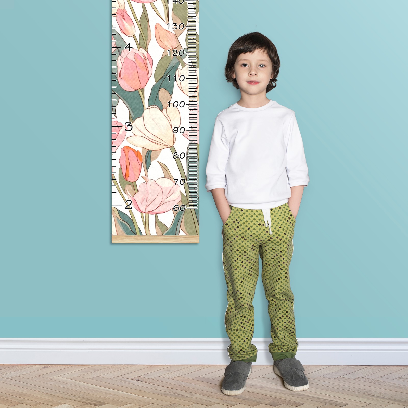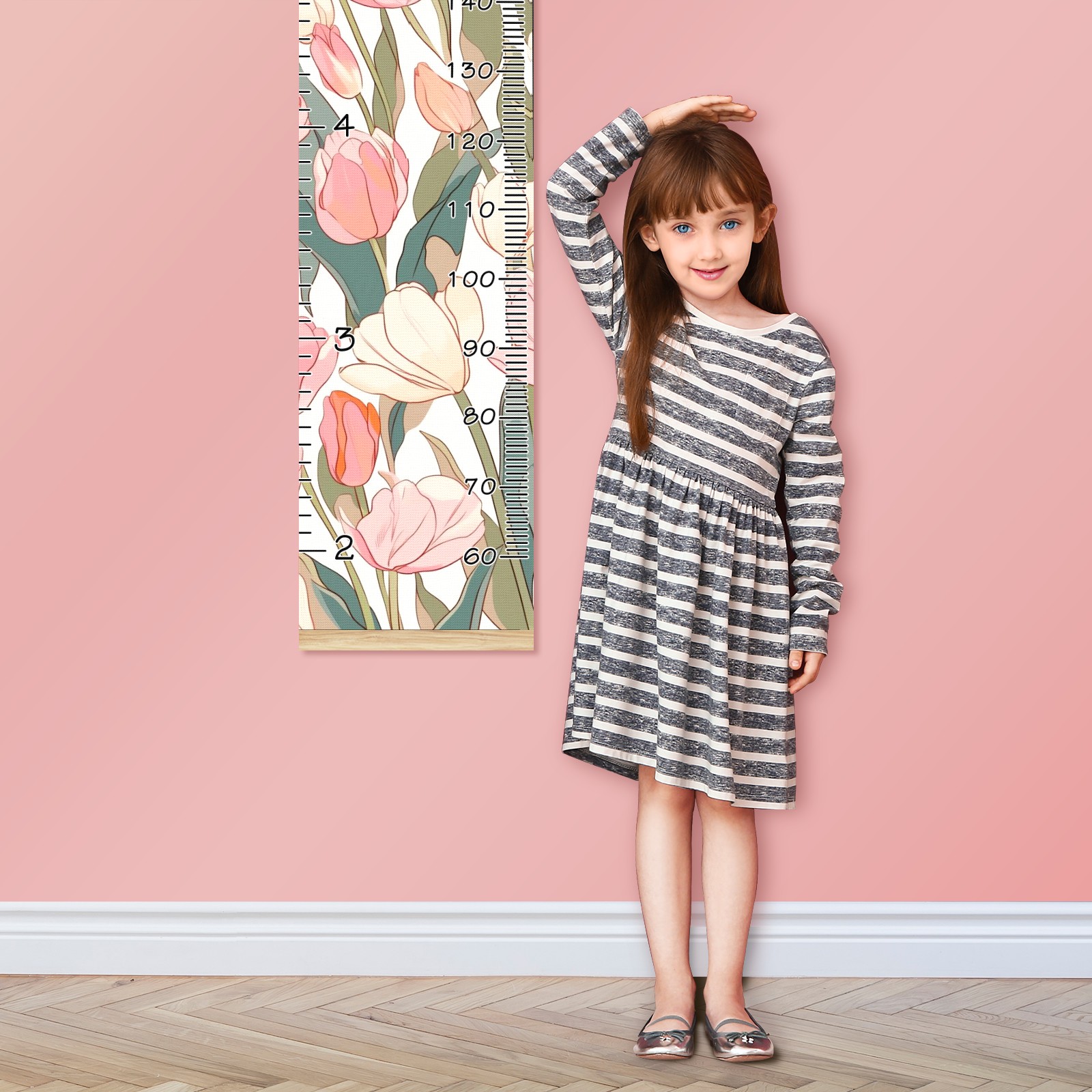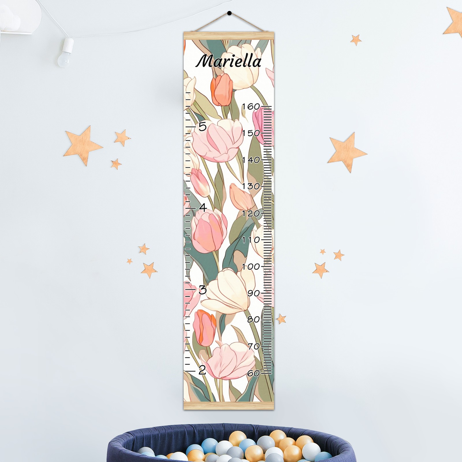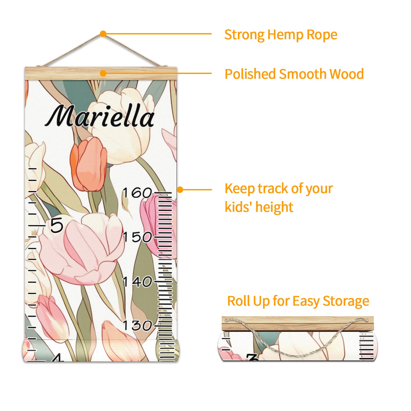 Personalized Kids Name Growth Chart Ruler for Wall Wood Frame Canvas Height Measure Chart 13.4x56 in Hanging Growth Chart Tulips3.3 Boys Girls Room Decor