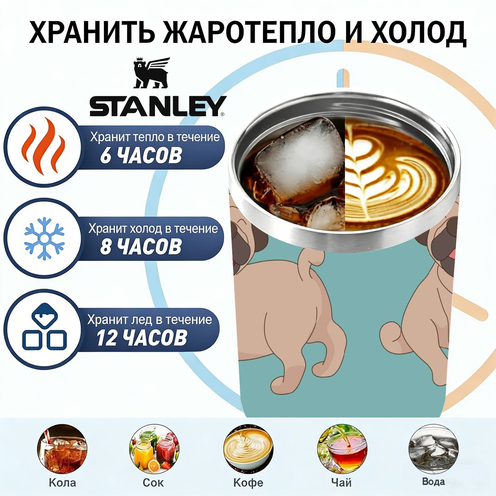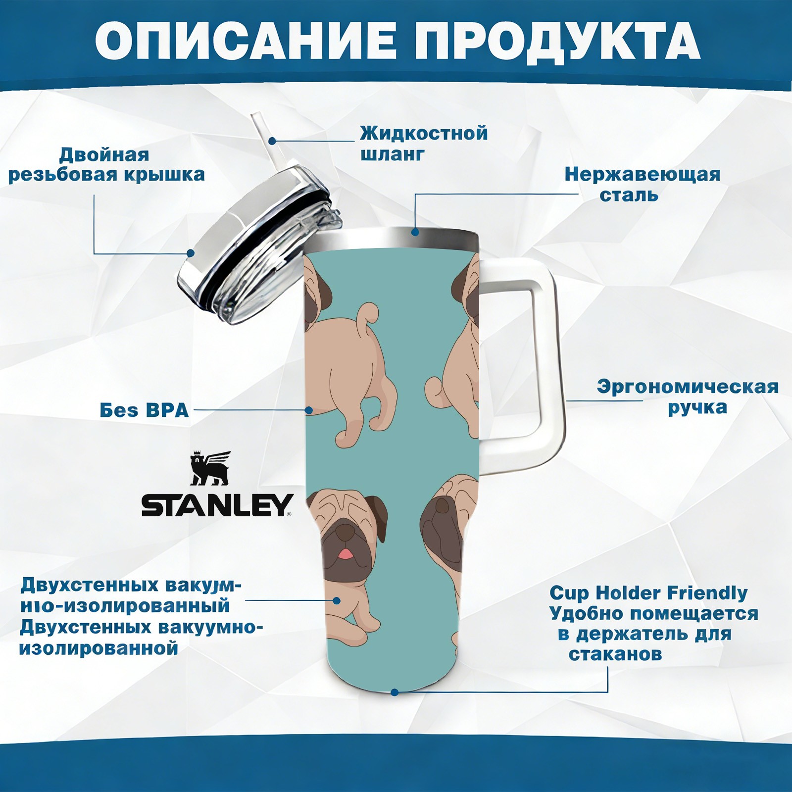 Автомобильная чашка Stanley на 40 унций с полной цветной печатью. Внутренний слой изготовлен из пищевой нержавеющей стали 304, внешний слой — из стали 201. Безопасная, прочная и устойчивая к деформации. На корпусе использована УФ-печать по всей поверхности: рисунок четкий, яркий, устойчивый к истиранию и не выцветает. Большой объем 40 унций удовлетворяет потребность в воде во время ежедневных поездок и длительных путешествий. Чашка подходит под большинство подстаканников в автомобилях, устойчиво размещается. Подходит для использования в автомобиле, в офисе, на открытом воздухе, а также является практичным подарком.