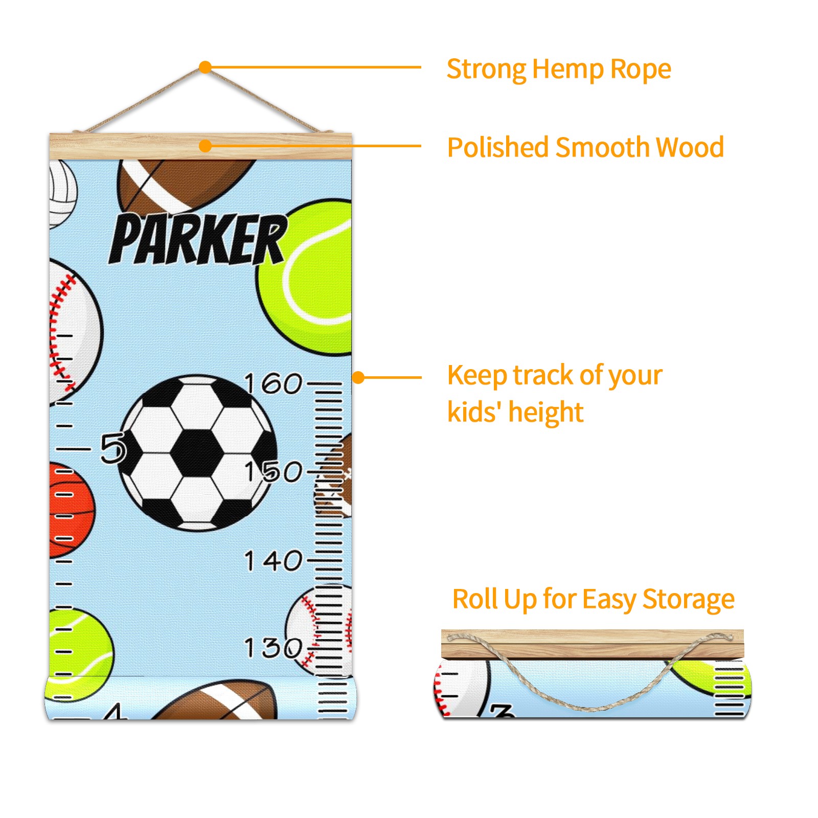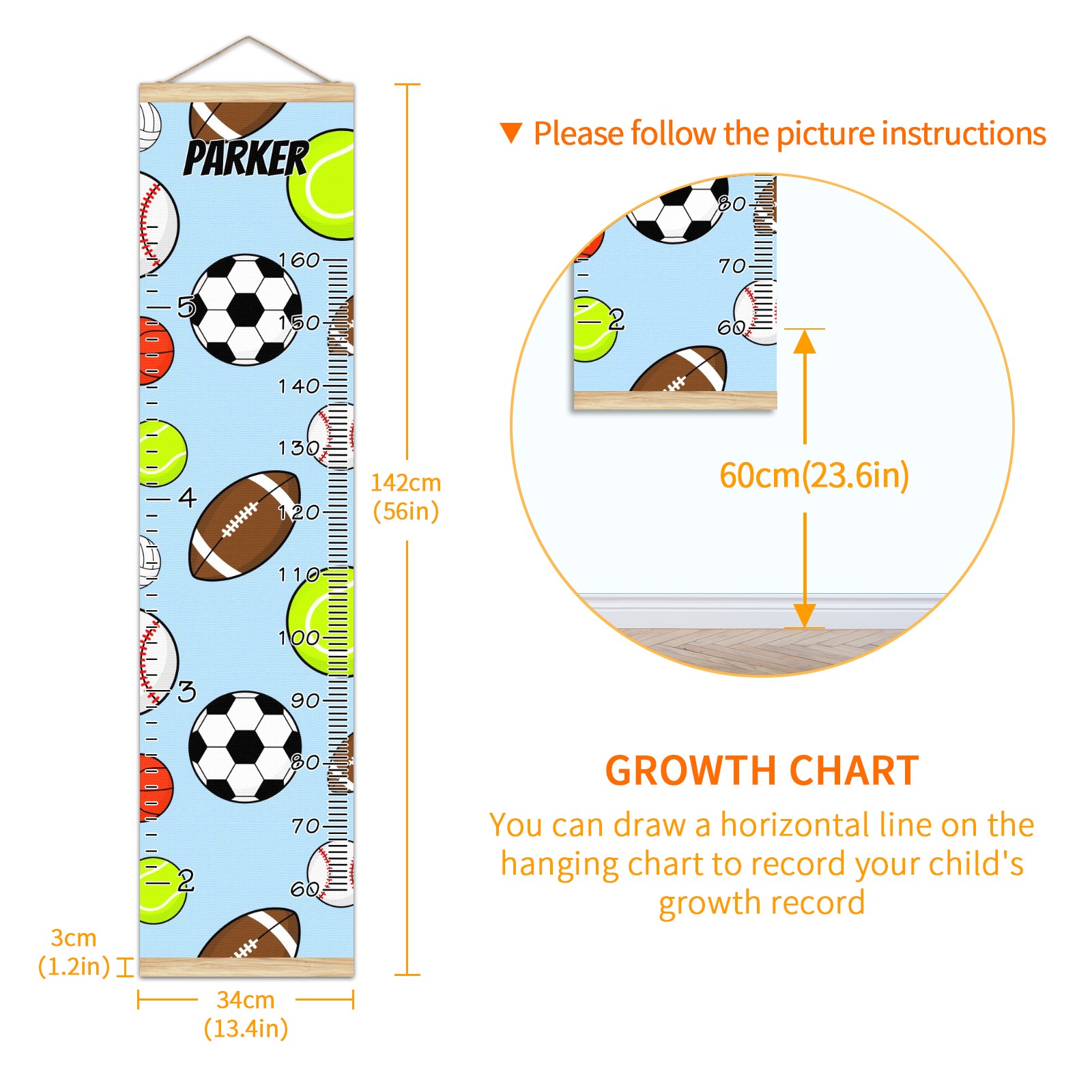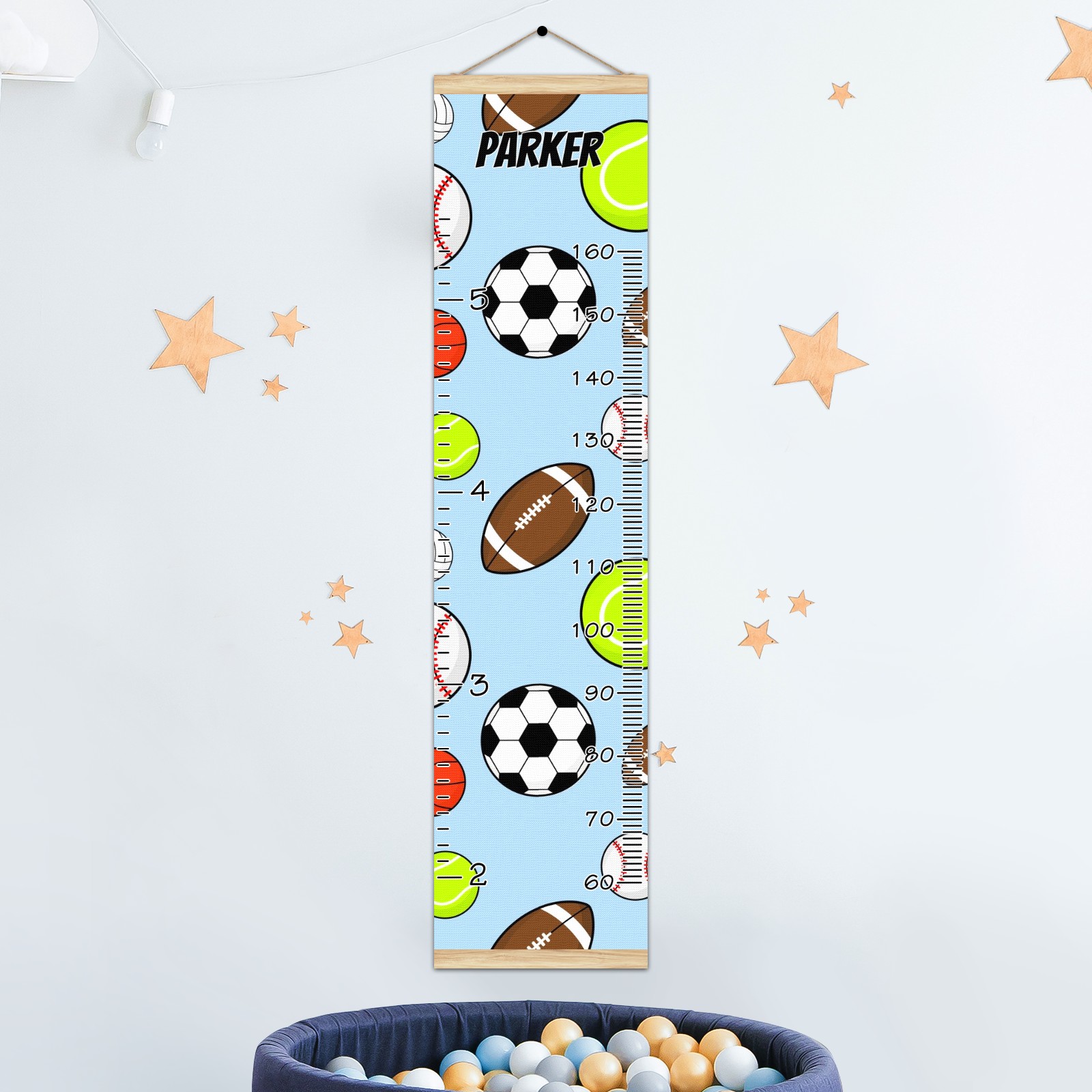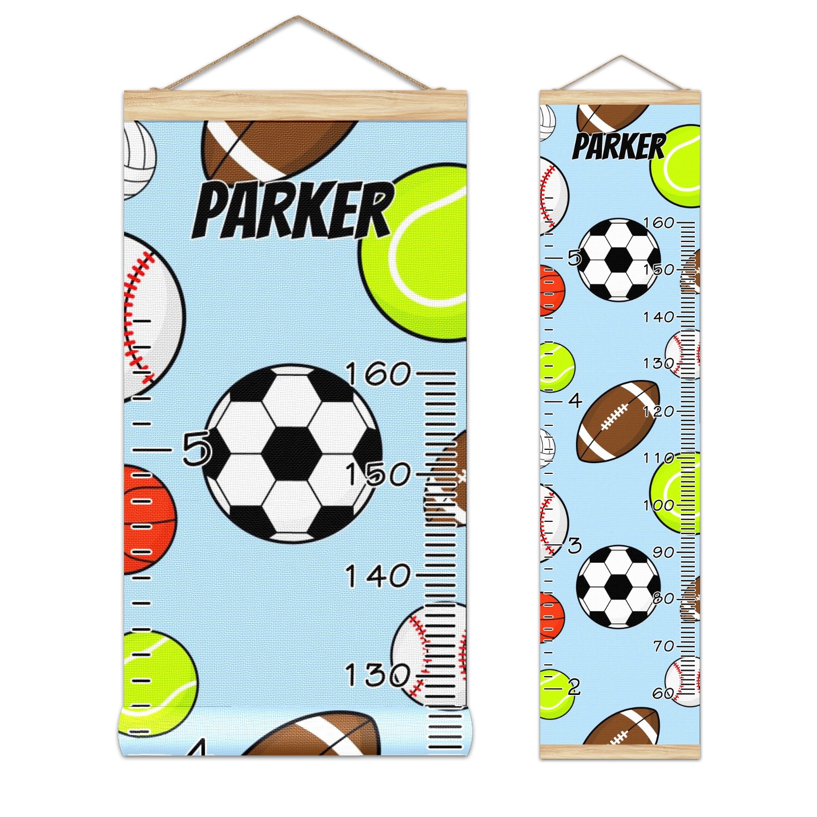 Personalized Kids Name Growth Chart Ruler for Wall Wood Frame Canvas Height Measure Chart 13.4x56 in Hanging Growth Chart Colorful Sport Balls3.6 Boys Girls Room Decor