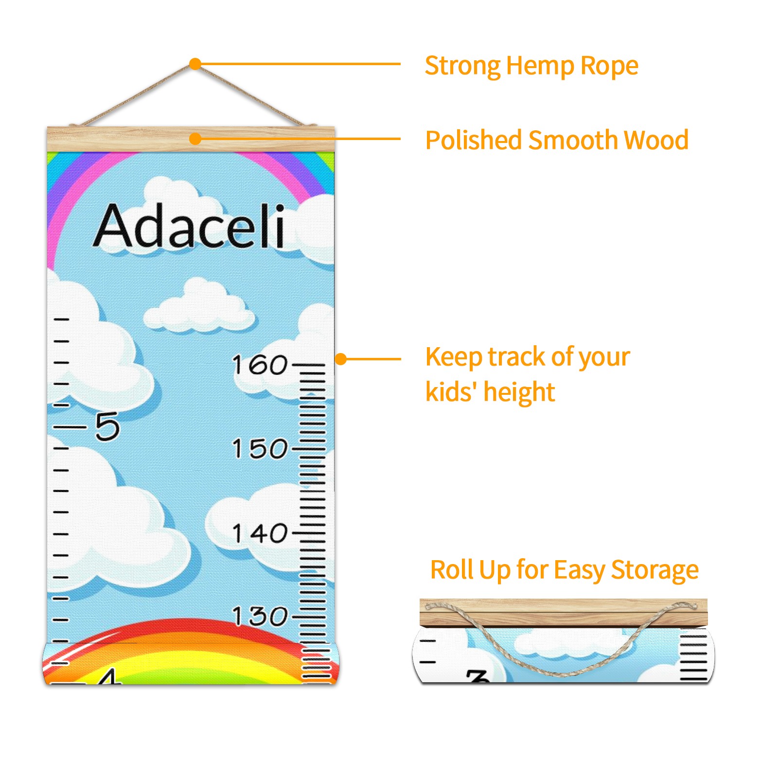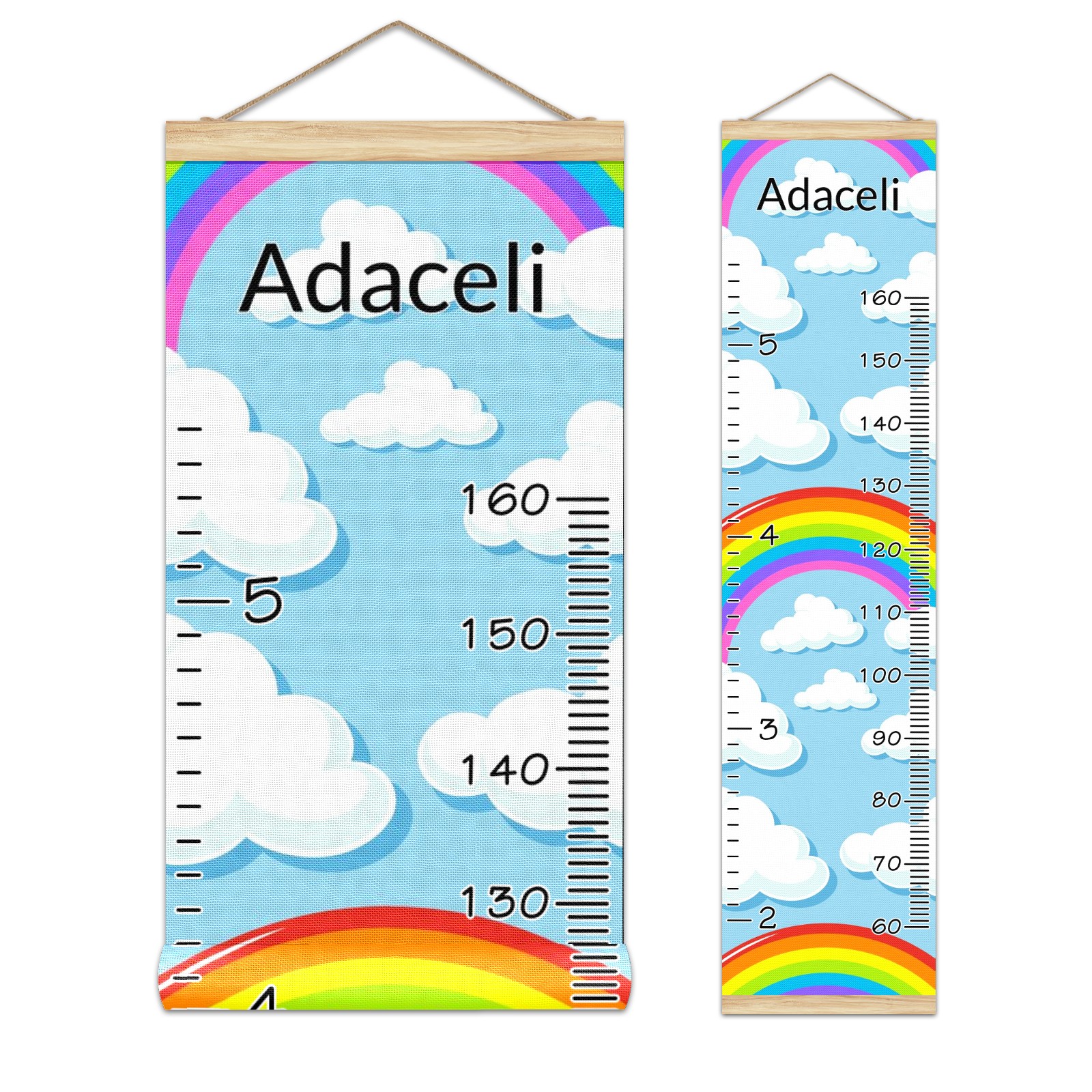 Personalized Kids Name Growth Chart Ruler for Wall Wood Frame Canvas Height Measure Chart 13.4x56 in Hanging Growth Chart Colorful Rainbow Clouds Pattern3.6 Boys Girls Room Decor