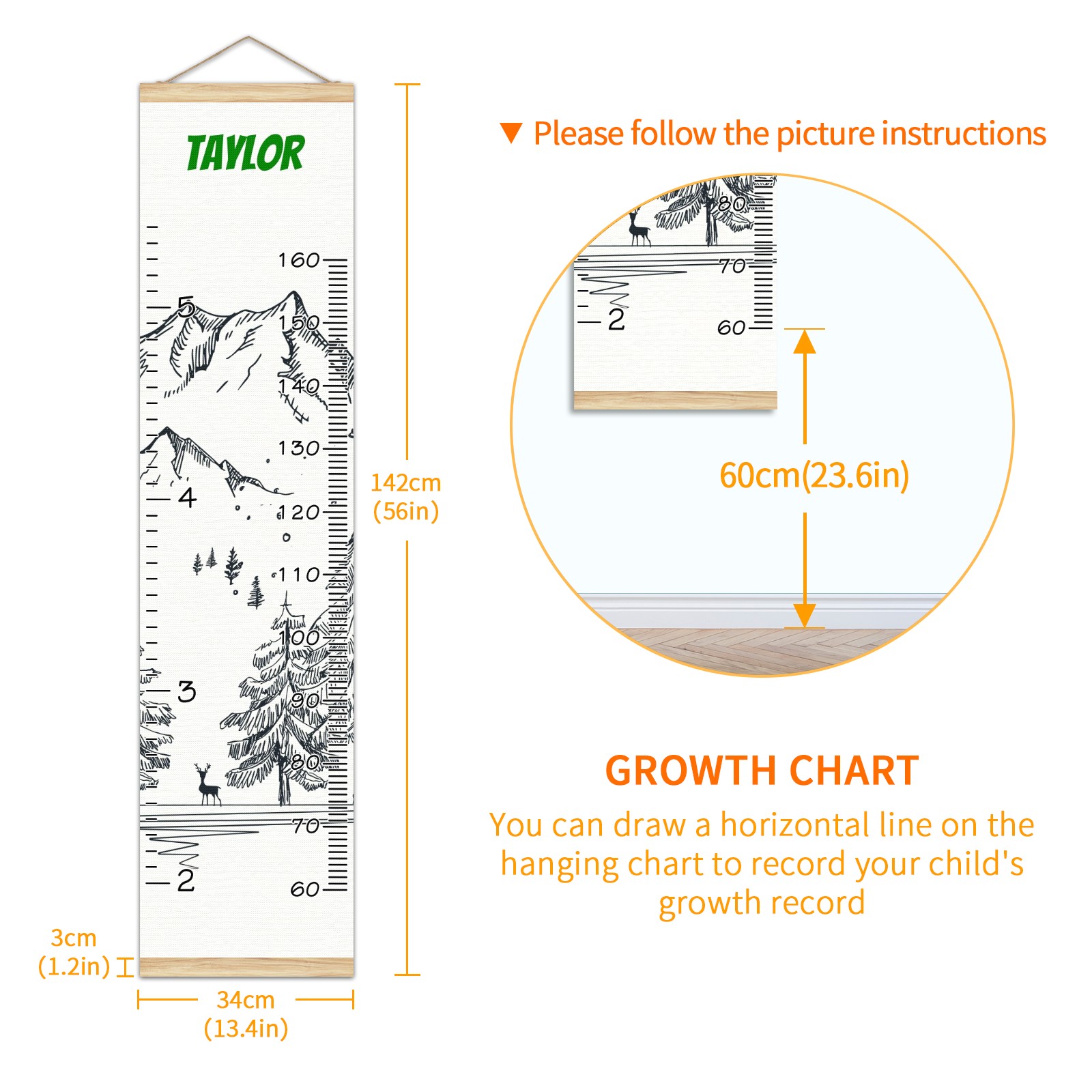 <p><b>Features:</b></p> <p>Rope for Hanging</p> <p>Material: Linen + Wood</p> <p>Dimensions: 13.4x56 inches</p> <p>Package Included: 1 * Baby Growth Chart</p> <p><b>Baby height growth chart can be used anywhere</b></p> <p>Ideal for kids nursery decoration, kids bedroom, interior walls or windows, playroom, living room, homedecoration.Add name and make the growth chart special!</p> <p><b>Easy to fold and carry</b></p> <p>With rope at the top of the growth chart, it is easy to install and remove.You can fold it and unfold any time any where.</p> <p><b>Perfect Gift Idea for Kids</b></p> <p>Environmental and non-toxic for kids use, it must be a perfect gift for baby, kids, girls, and boys.This is a best choice for your friend who have kids or baby as a popular gift.</p> <p><b>Easy to read</b></p> <p>Measurement accrate with 2 scales, Centimeters and feet. The letters are big enough, very easy to read.</p> <p><b>60cm(23.6inch) Over Ground Design</b></p> <p>Not only can protect from dust and other damage, but also will not interfere in floor cleaning.</p>