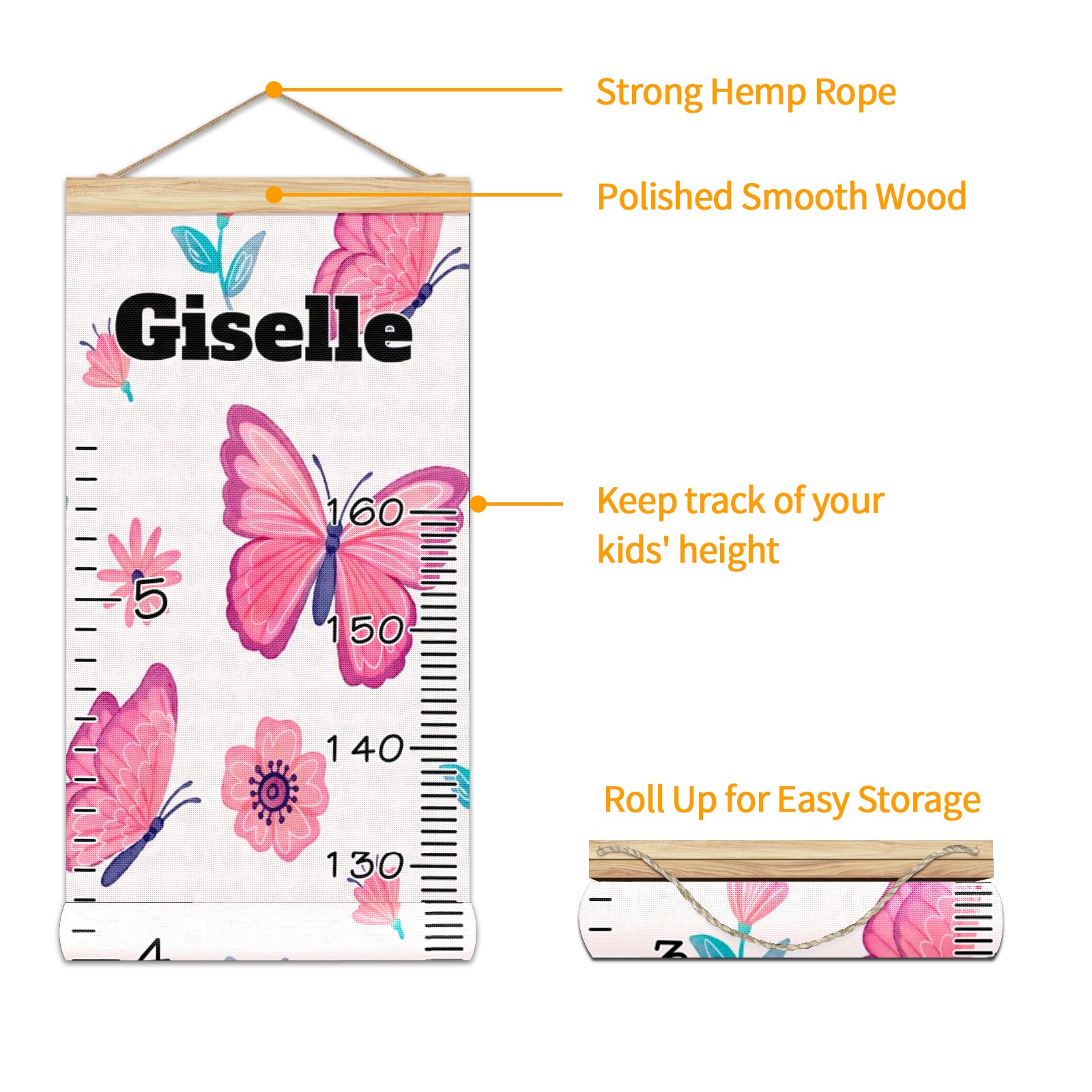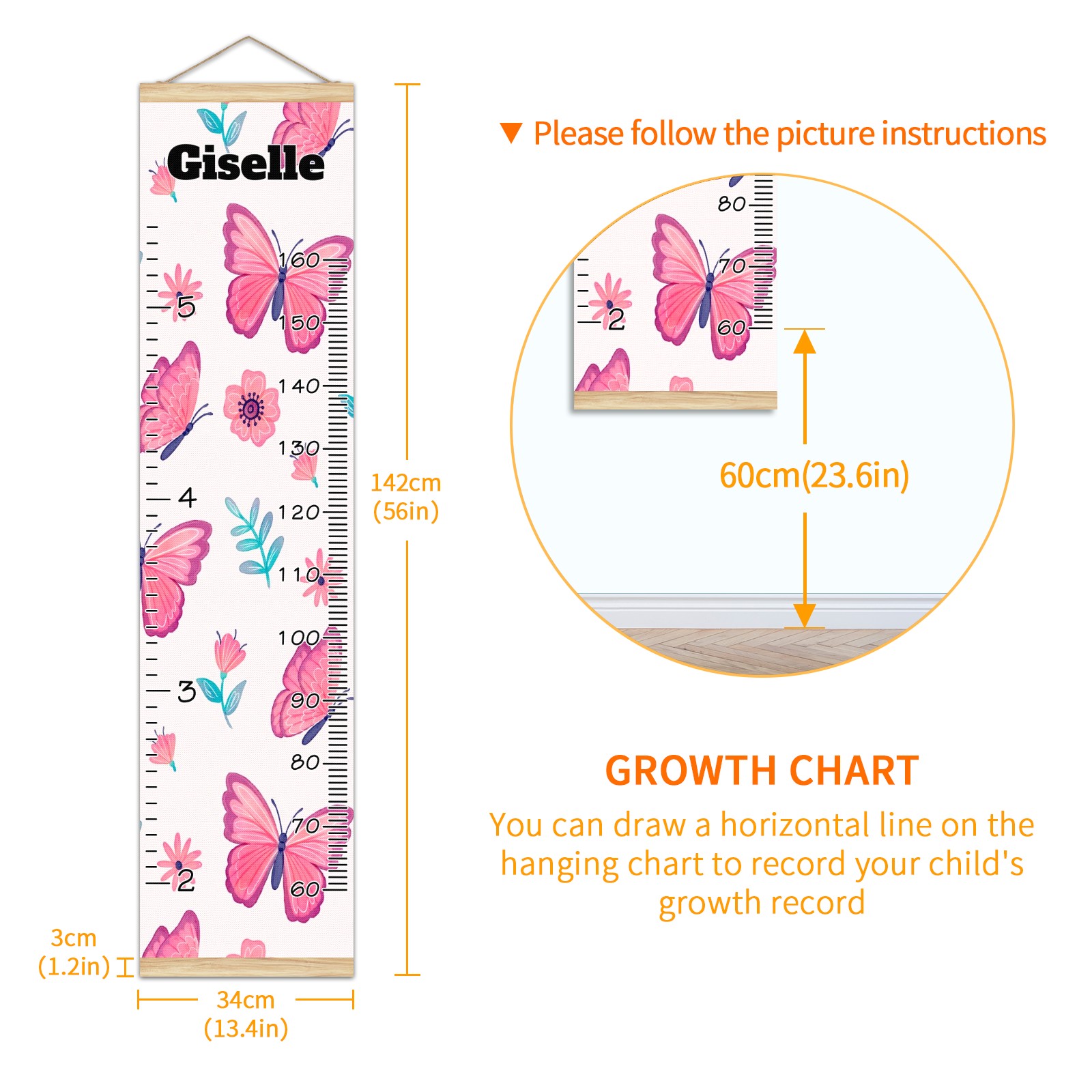 <p><b>Features:</b></p> <p>Rope for Hanging</p> <p>Material: Linen + Wood</p> <p>Dimensions: 13.4x56 inches</p> <p>Package Included: 1 * Baby Growth Chart</p> <p><b>Baby height growth chart can be used anywhere</b></p> <p>Ideal for kids nursery decoration, kids bedroom, interior walls or windows, playroom, living room, homedecoration.Add name and make the growth chart special!</p> <p><b>Easy to fold and carry</b></p> <p>With rope at the top of the growth chart, it is easy to install and remove.You can fold it and unfold any time any where.</p> <p><b>Perfect Gift Idea for Kids</b></p> <p>Environmental and non-toxic for kids use, it must be a perfect gift for baby, kids, girls, and boys.This is a best choice for your friend who have kids or baby as a popular gift.</p> <p><b>Easy to read</b></p> <p>Measurement accrate with 2 scales, Centimeters and feet. The letters are big enough, very easy to read.</p> <p><b>60cm(23.6inch) Over Ground Design</b></p> <p>Not only can protect from dust and other damage, but also will not interfere in floor cleaning.</p>