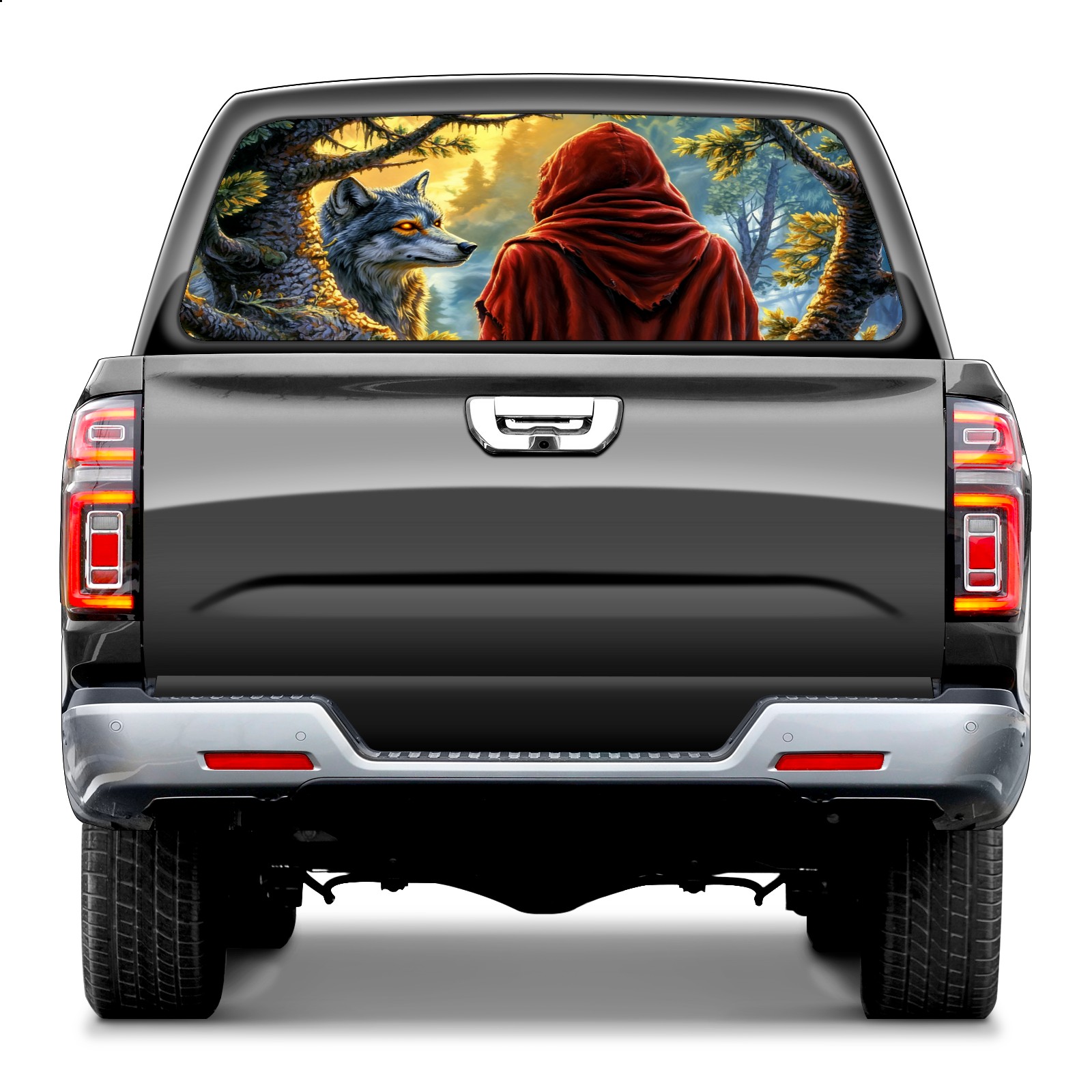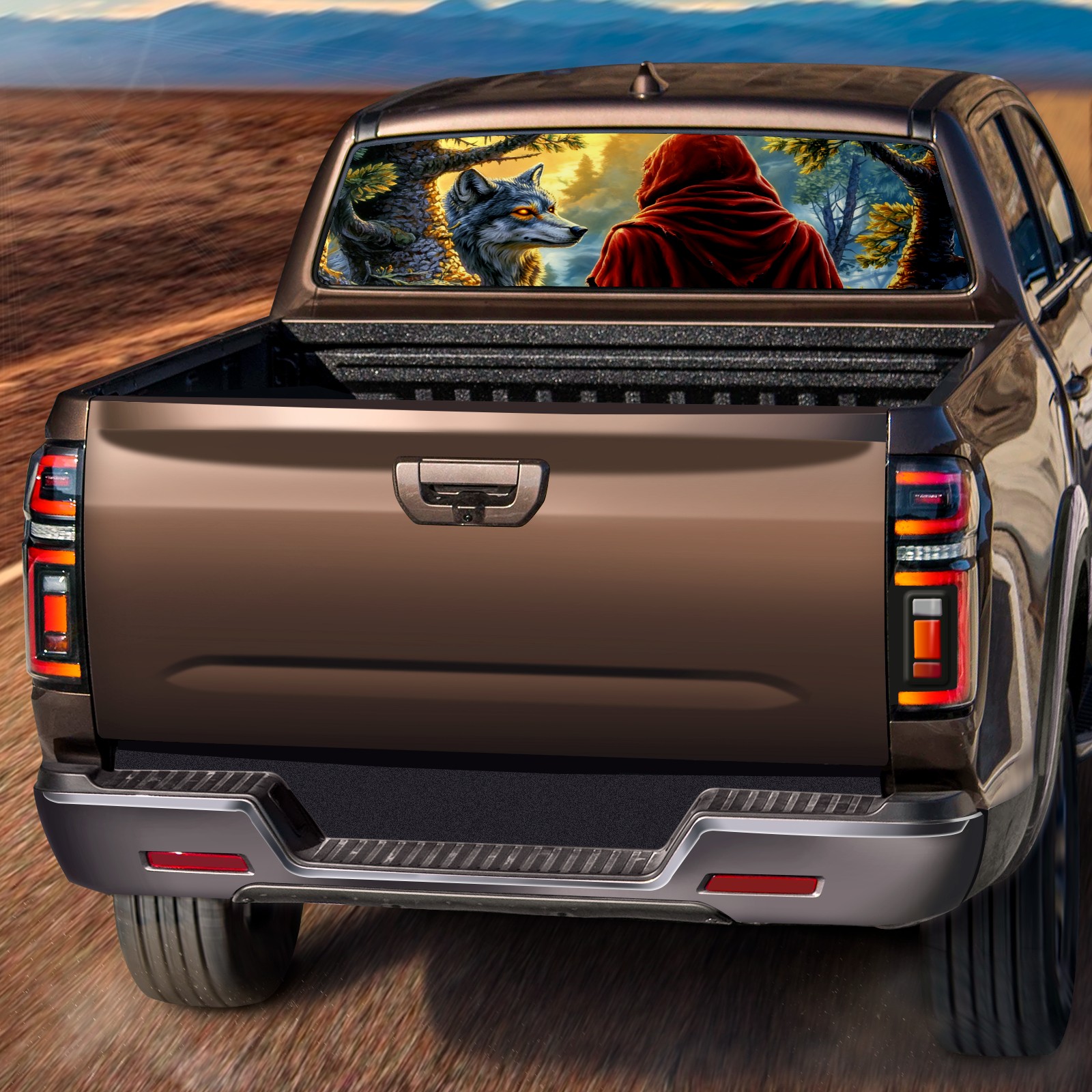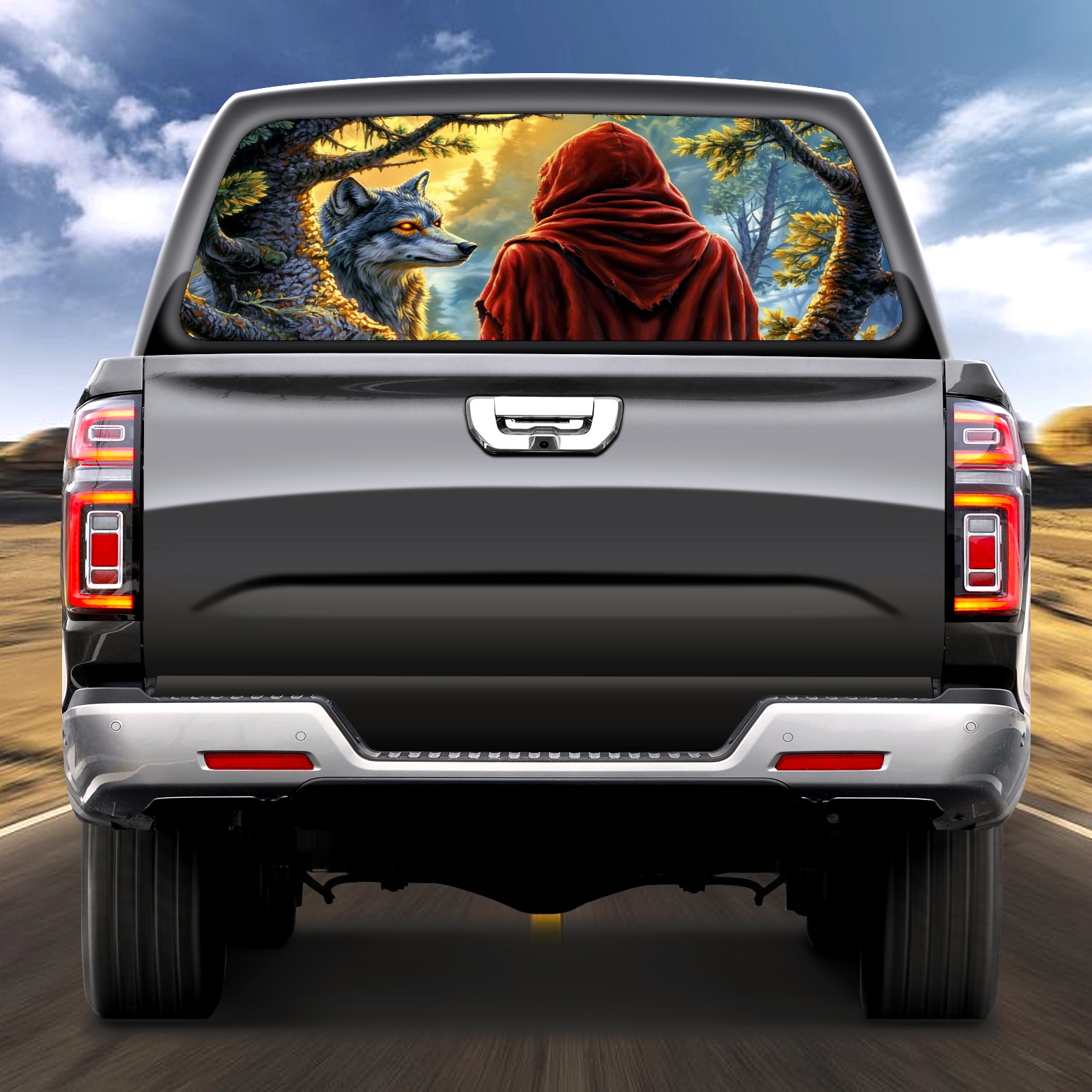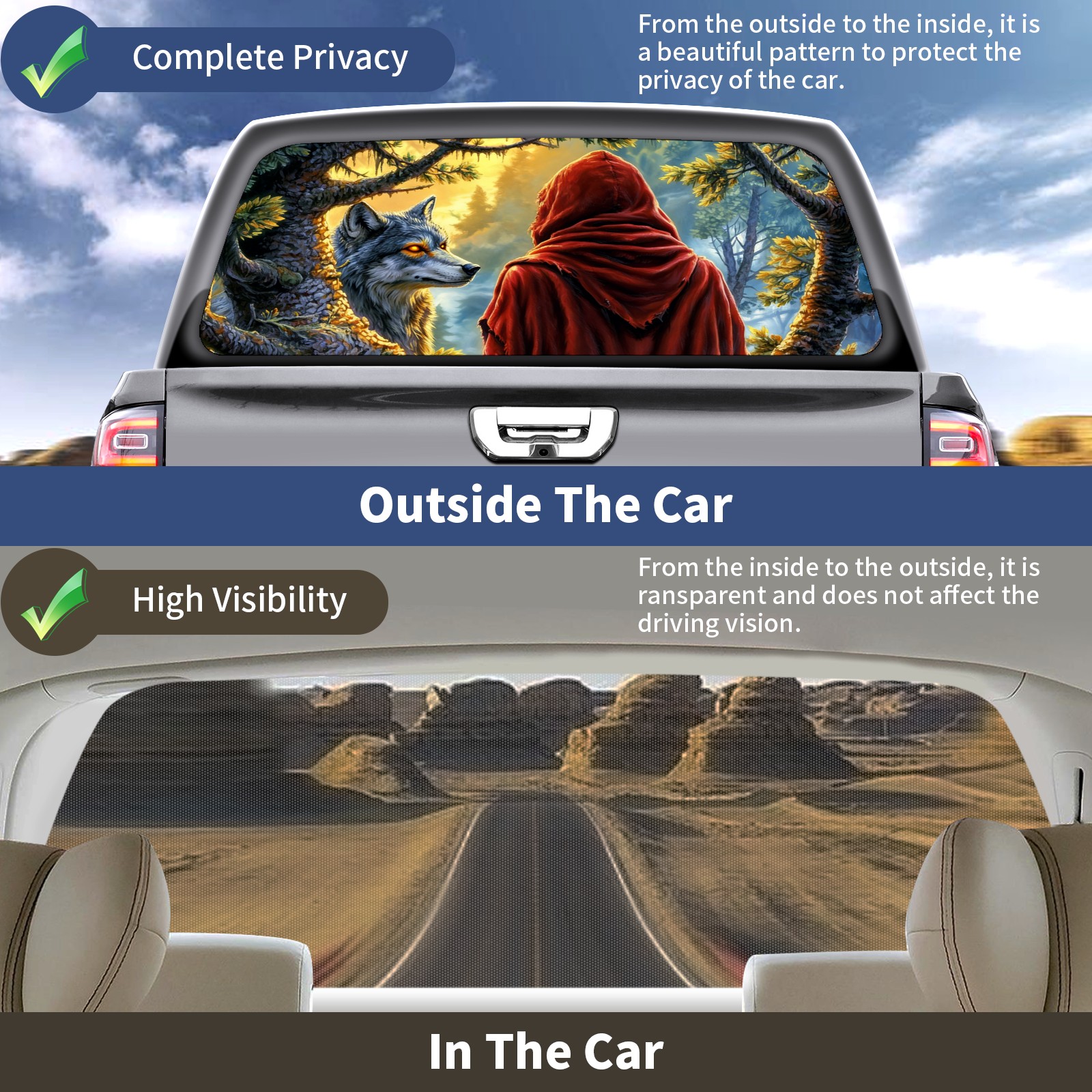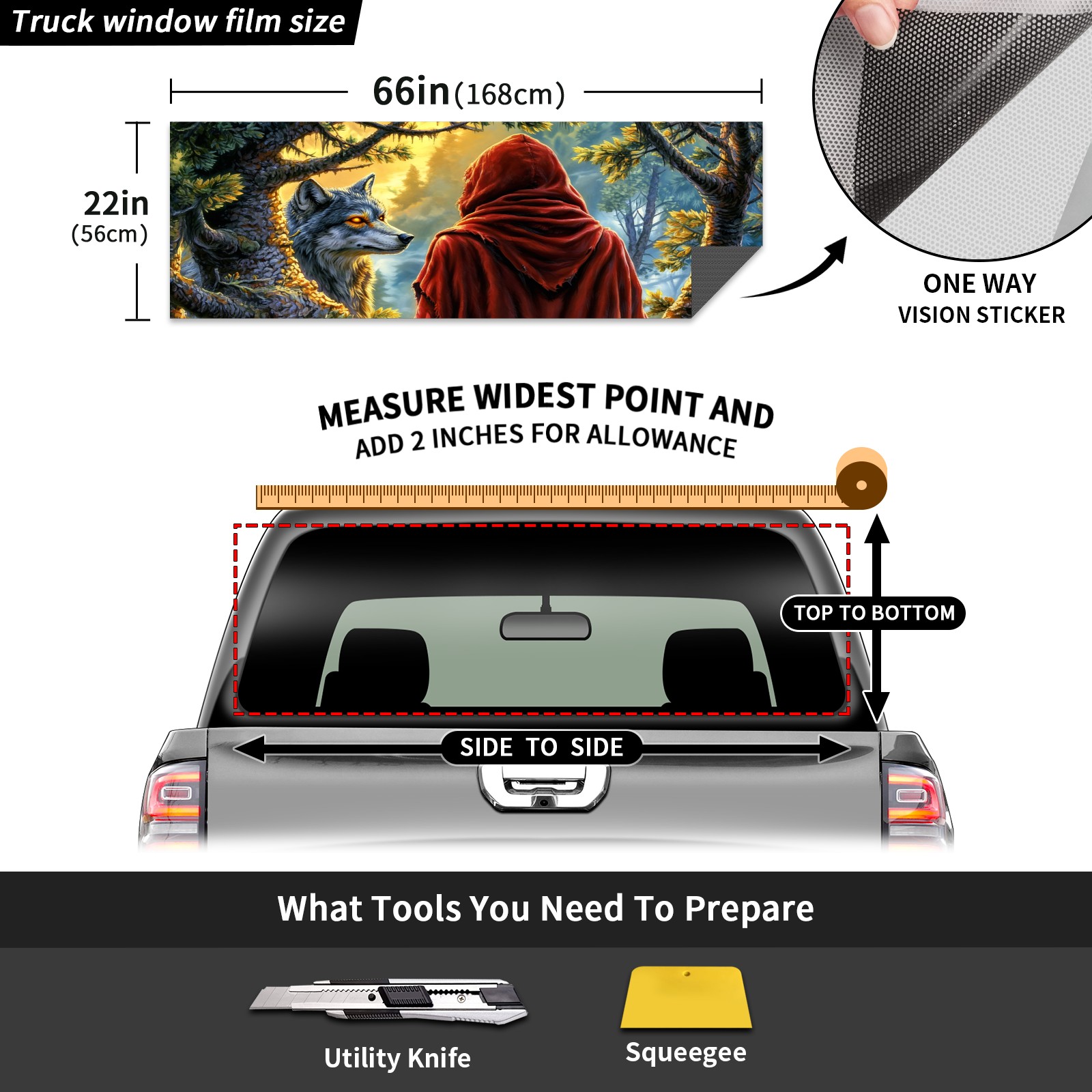 Truck Rear Window Graphic Decals Wolf Red Hooded Back Window Perforated Vinyl Decal for Truck Car Pickup Back Window Sticker Film 66" x 22"