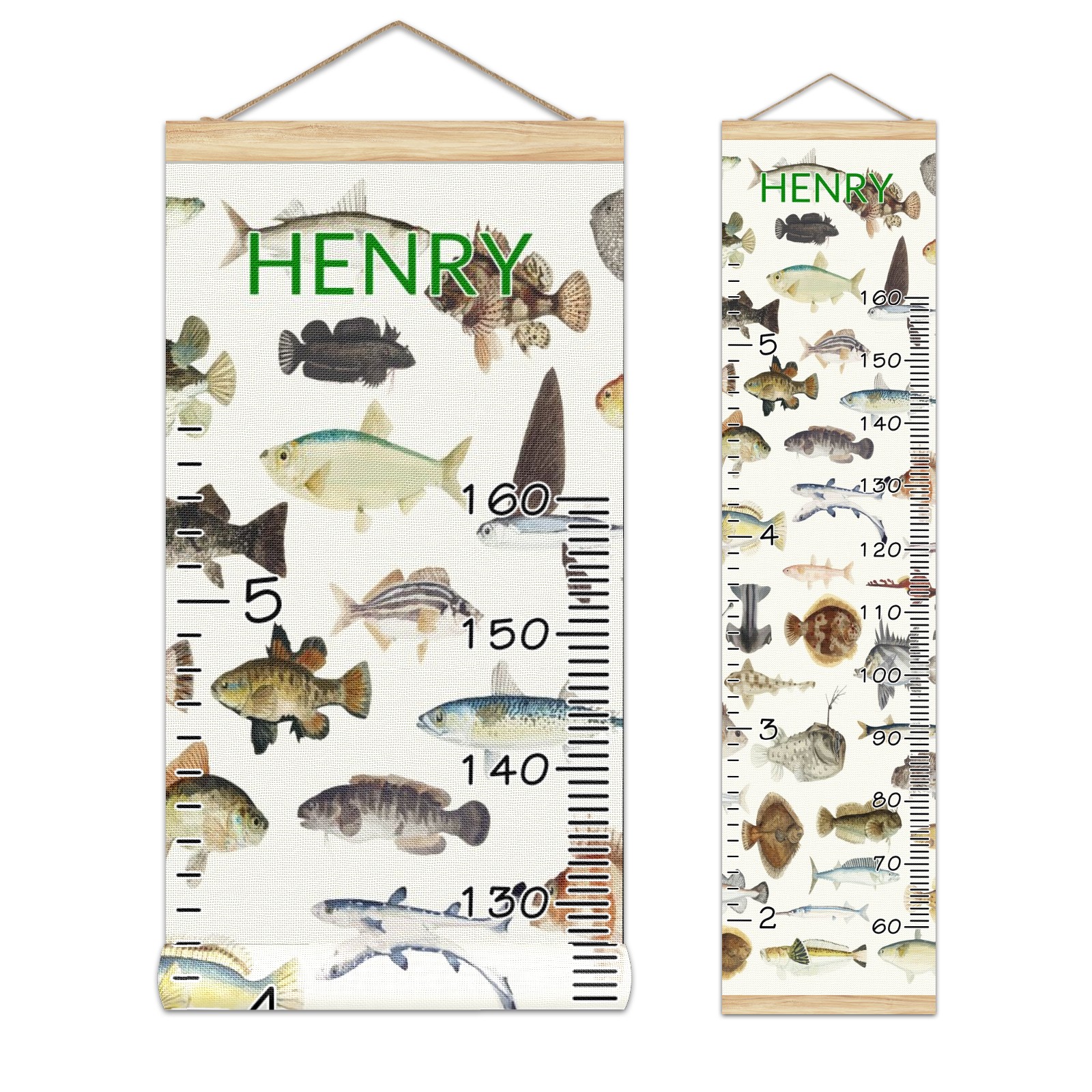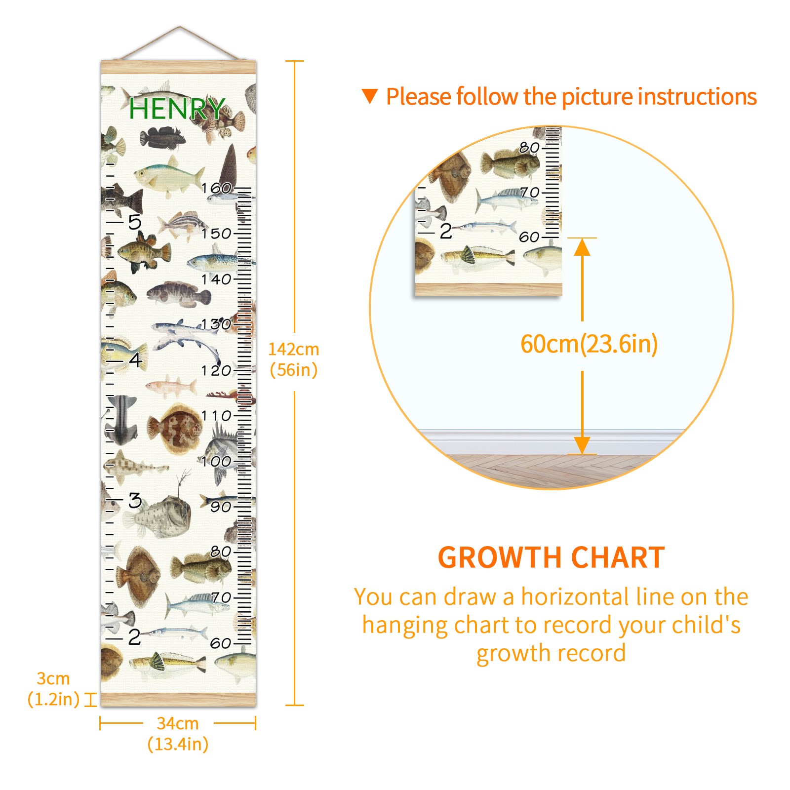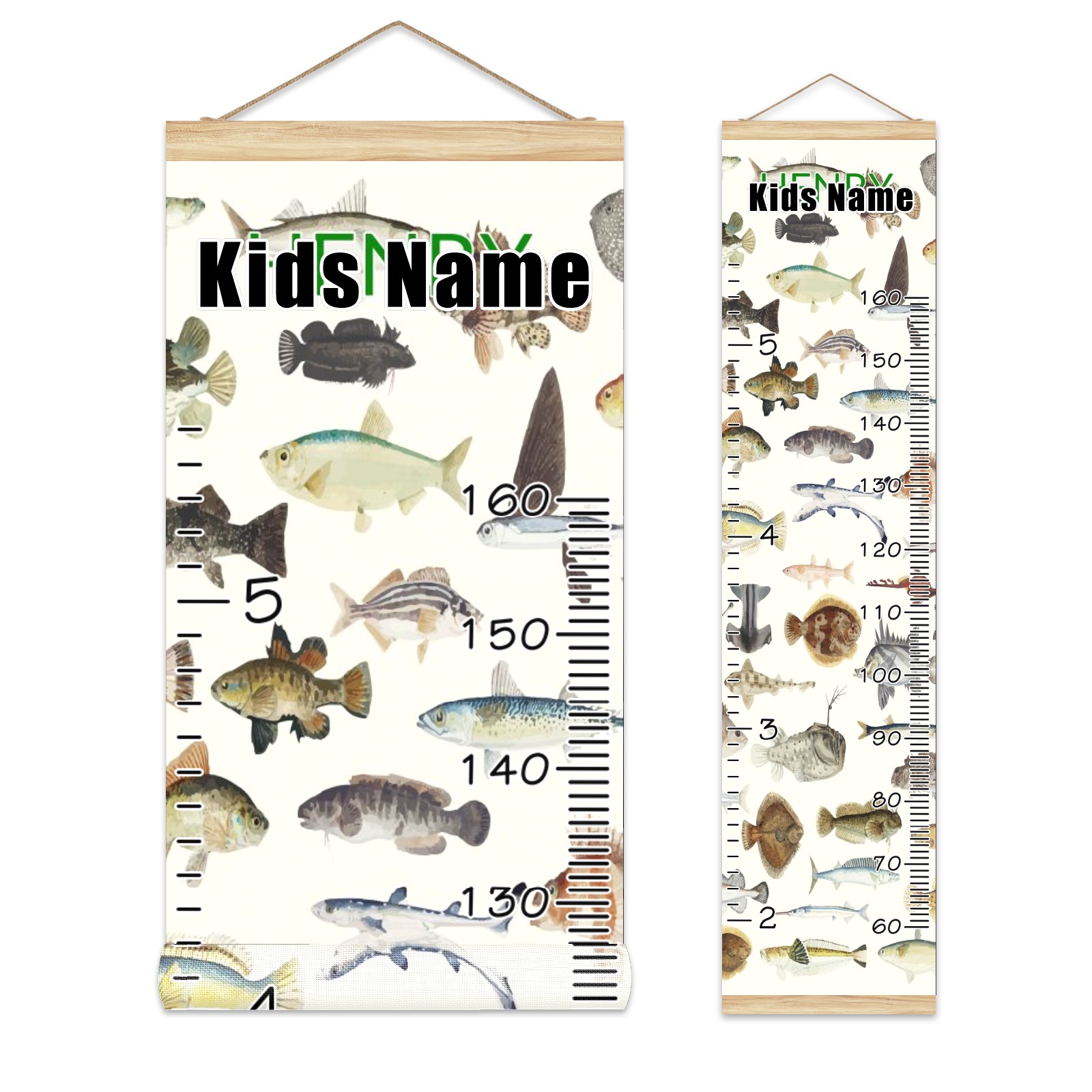 Personalized Kids Name Growth Chart Ruler for Wall Wood Frame Canvas Height Measure Chart 13.4x56 in Hanging Growth Chart Colored Fish Drawing3.23 Boys Girls Room Decor