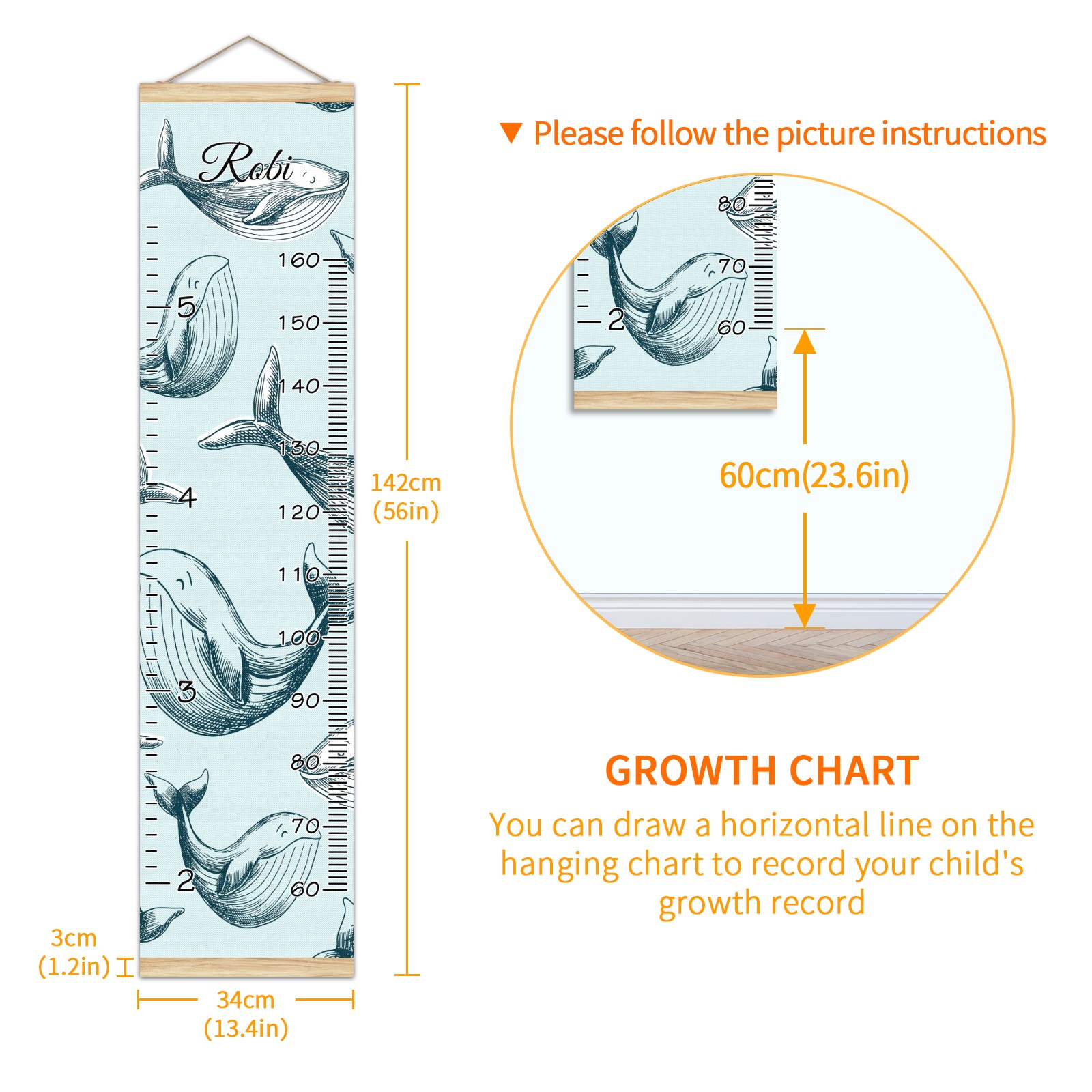 • <p><b>Features:</b></p> <p>Rope for Hanging</p> <p>Material: Linen + Wood</p> <p>Dimensions: 13.4x56 inches</p> <p>Package Included: 1 * Baby Growth Chart</p> <p><b>Baby height growth chart can be used anywhere</b></p> <p>Ideal for kids nursery decoration, kids bedroom, interior walls or windows, playroom, living room, homedecoration.Add name and make the growth chart special!</p> <p><b>Easy to fold and carry</b></p> <p>With rope at the top of the growth chart, it is easy to install and remove.You can fold it and unfold any time any where.</p> <p><b>Perfect Gift Idea for Kids</b></p> <p>Environmental and non-toxic for kids use, it must be a perfect gift for baby, kids, girls, and boys.This is a best choice for your friend who have kids or baby as a popular gift.</p> <p><b>Easy to read</b></p> <p>Measurement accrate with 2 scales, Centimeters and feet. The letters are big enough, very easy to read.</p> <p><b>60cm(23.6inch) Over Ground Design</b></p> <p>Not only can protect from dust and other damage, but also will not interfere in floor cleaning.</p>