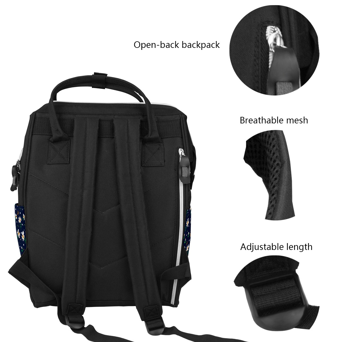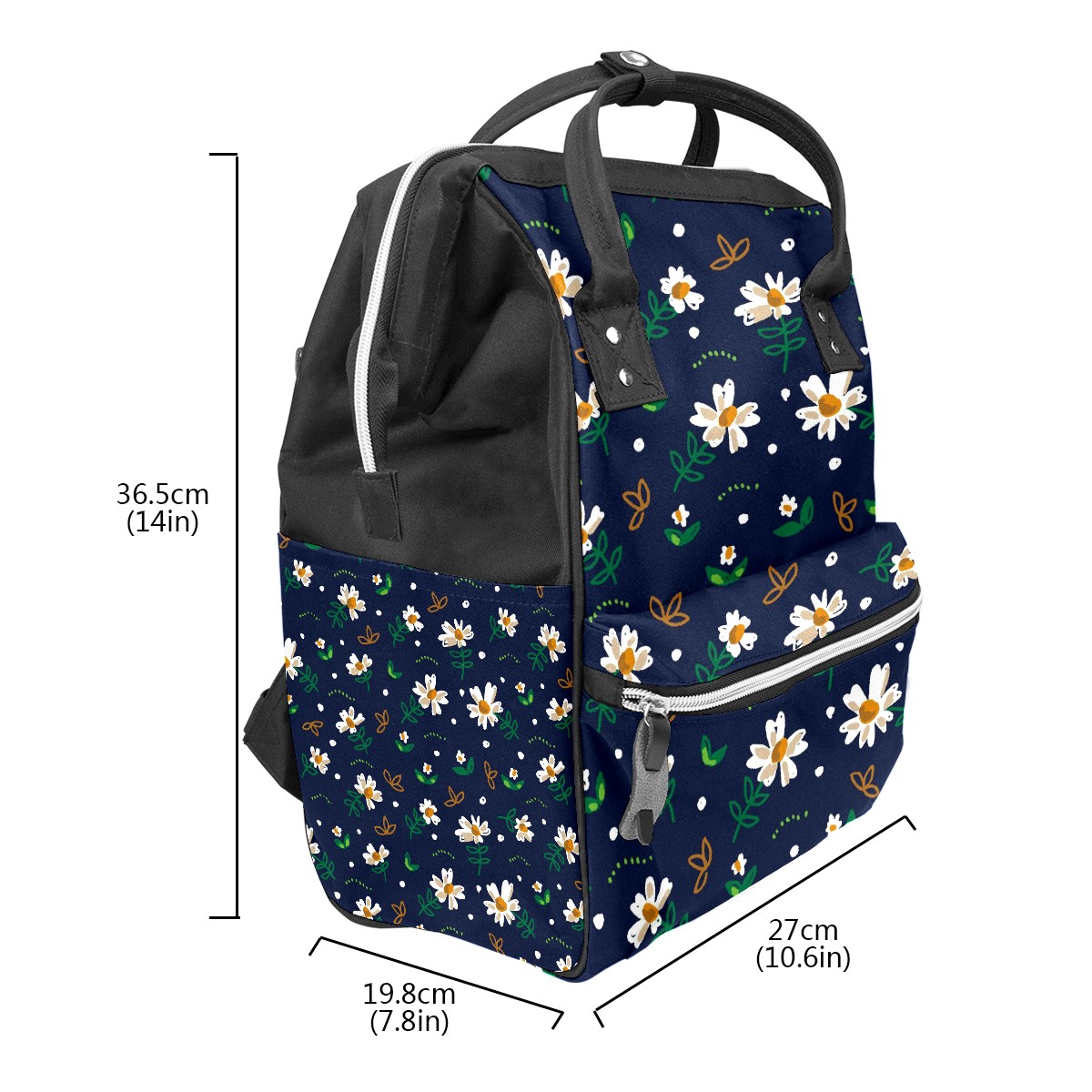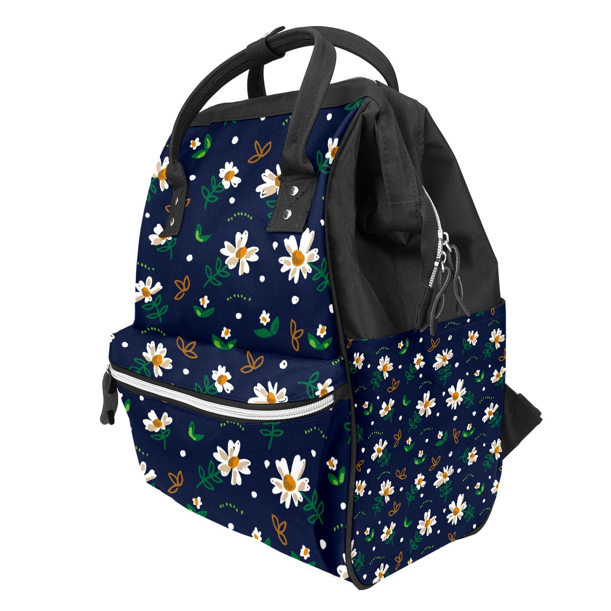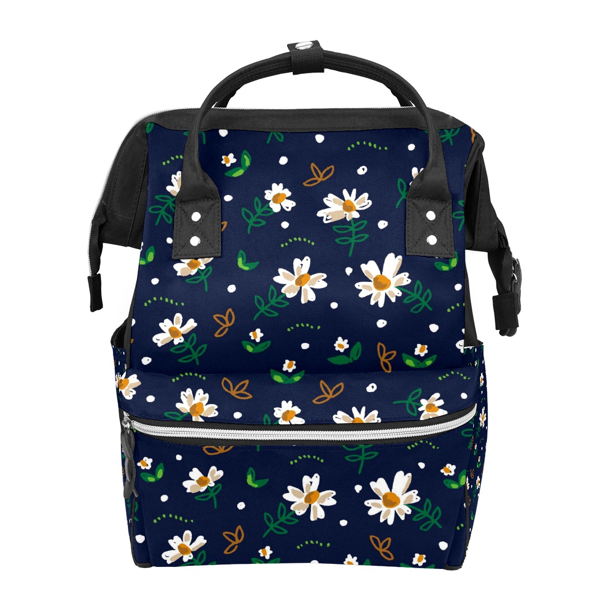Backpack White Daisy Green Leaves Dark Blue Large Capacity Diaper Bag Travel Daypack