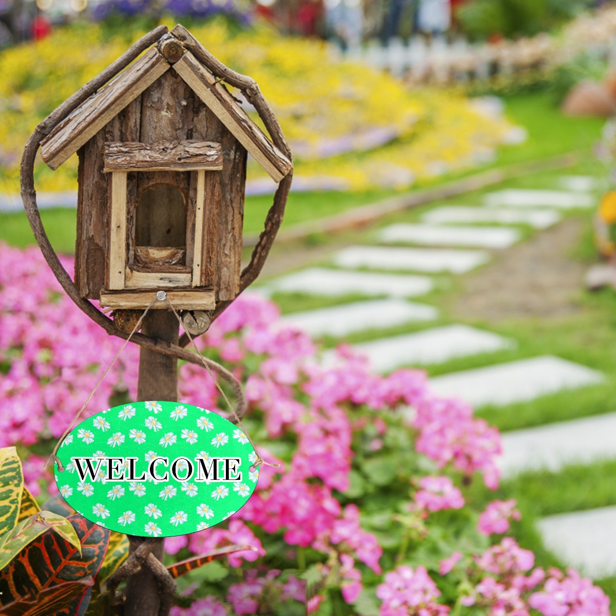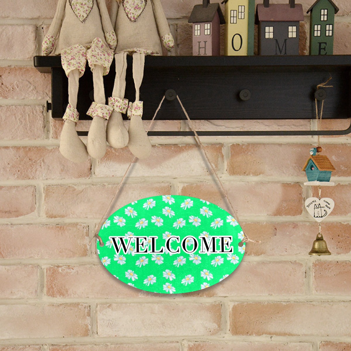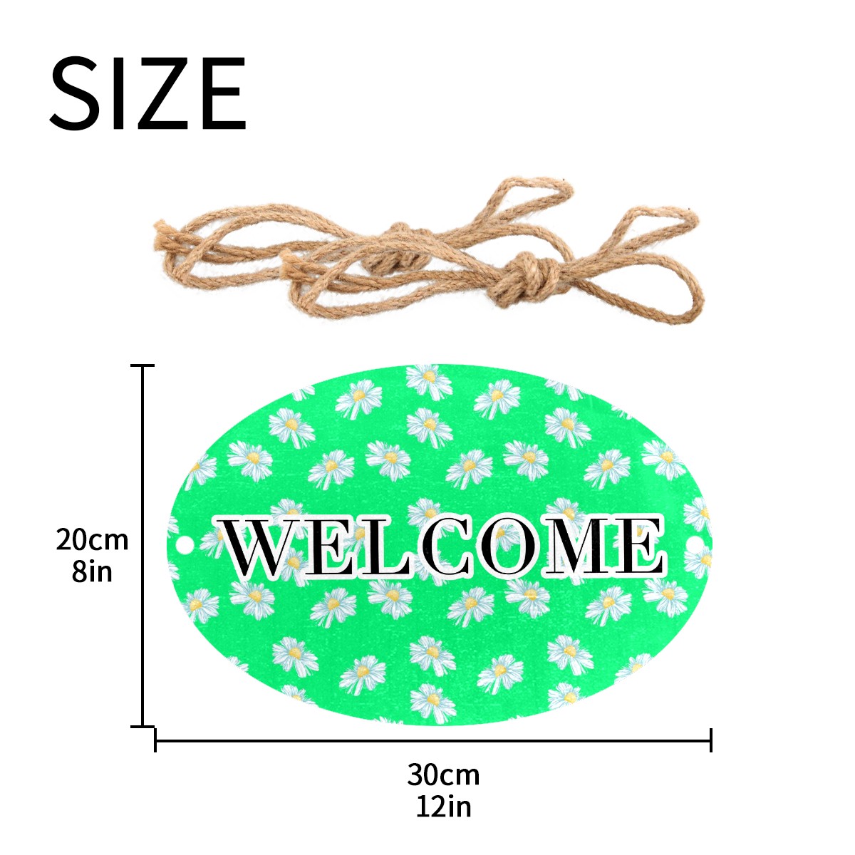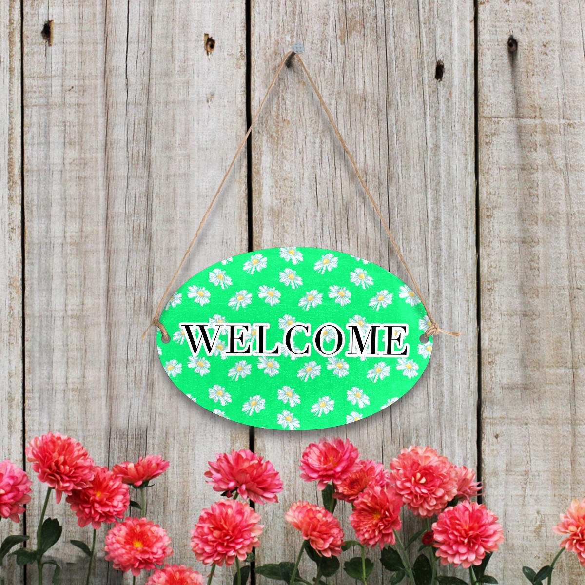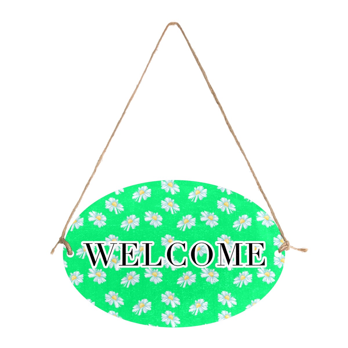 Welcome Sign White Little Daisy Pattern Green Oval Wood Printed Door Plate Plaque Wall Hanging Front Door Decor Porch Garden Decorations Home Office Yard Room 12x8in with Hang Rope