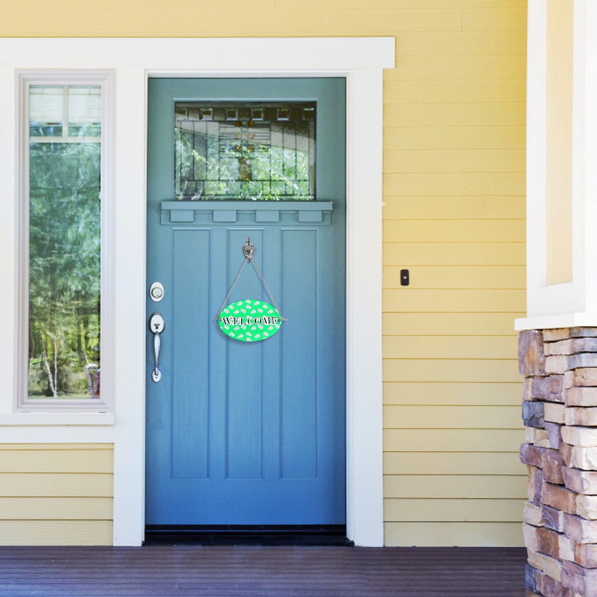 <b>FCZ Customized Welcome Sign Hanging Pendant Front Door Decor Door Hanging Sign Decorative Plaque Cafe Shop<br> Material:Environmental-friendly Fiber Wood PVC.Waterproof.Easy to clean,durable.<br> Print:One side Printed.We support customized picture,you can send us the picture or the sign on the board,we can produce it for you,customize your own welcome sign.The word "WELCOME"can be removed if you don't want it,just email us.<br> Size:12"(L) x 8"(W) x 0.2"(H).Rope Length:31.5in(80cm).Weight:170g.Porper welcome sign size for your home door,office,shop and garden.<br> Design:Two holes on the plaque for easy installation,includes two attached strong ropes to hang on your entryway<br> Perfect for home,indoor.outdoor,office,yard,garden,cafe shop,farmhouse,kitchen or any place.<br> Occasions:Suit for festival,Halloween,Christmas,Easter,Valentines,birthday party,anniversary party,wedding,New Year and etc.</b>