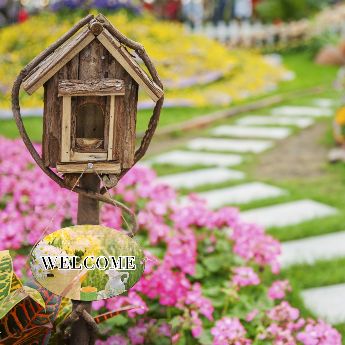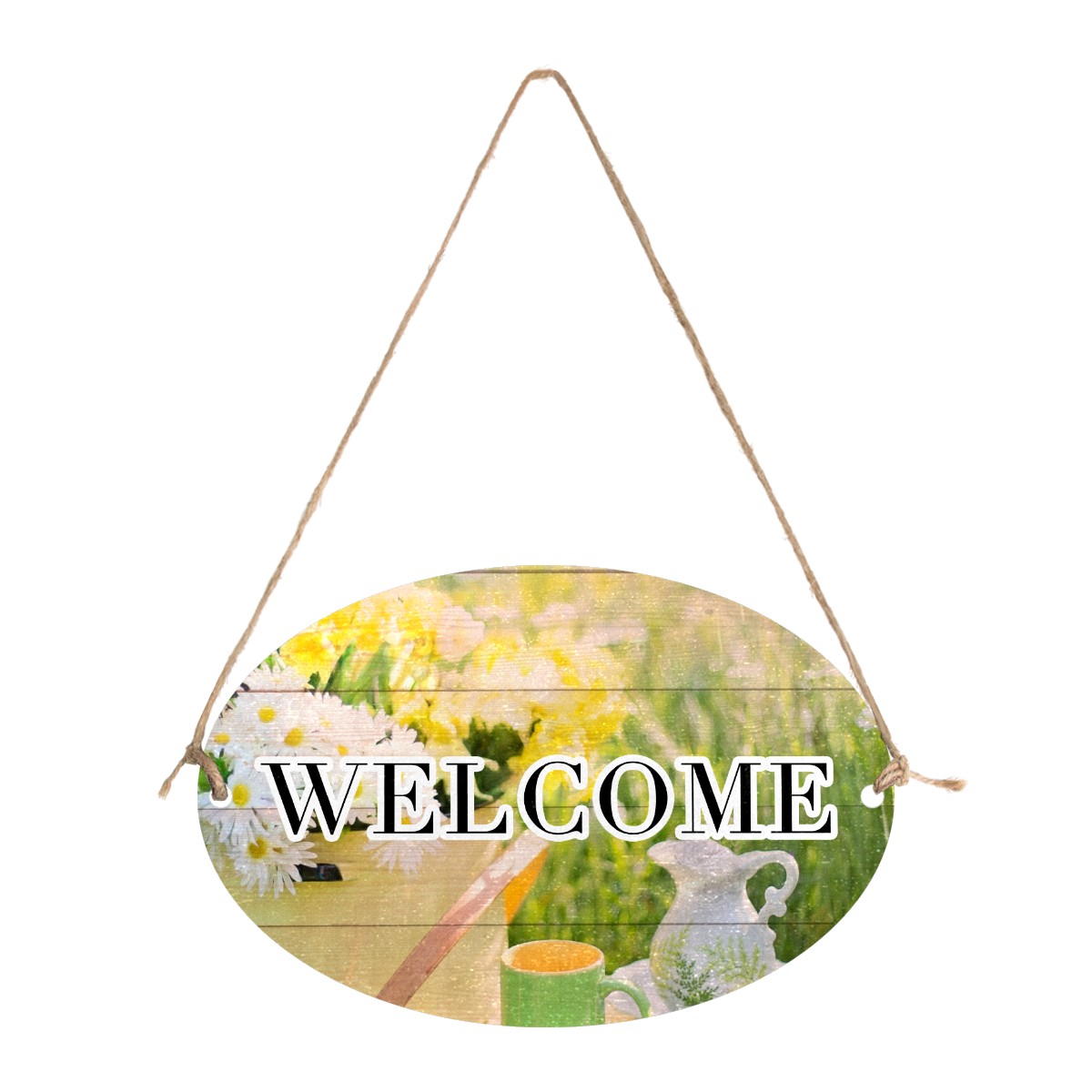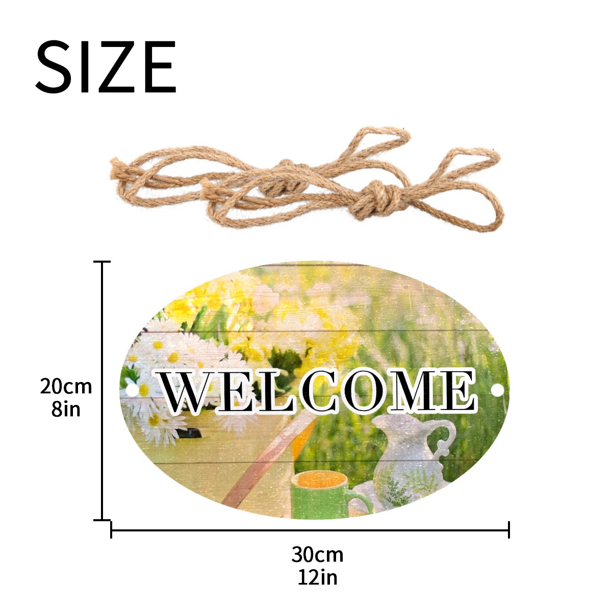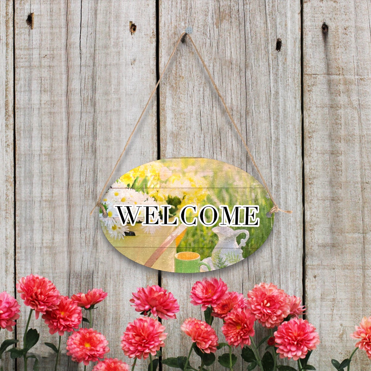 Welcome Sign Wooden Floral Tea Picnic Afternoon Oval Wood Printed Door Plate Plaque Wall Hanging Front Door Decor Porch Garden Decorations Home Office Yard Room 12x8in with Hang Rope