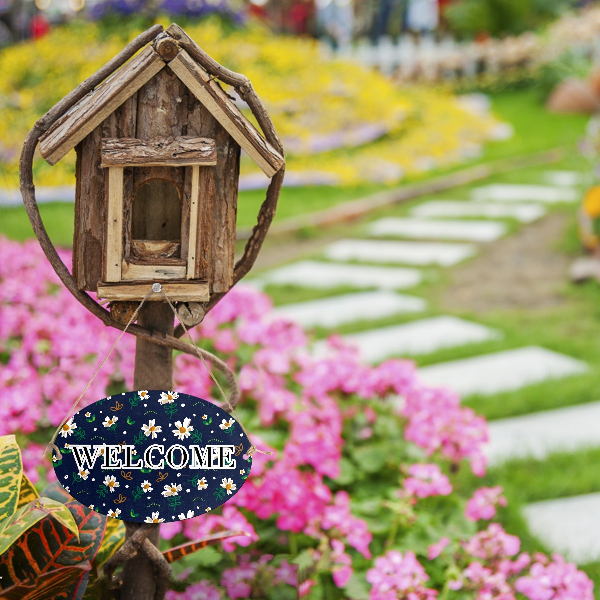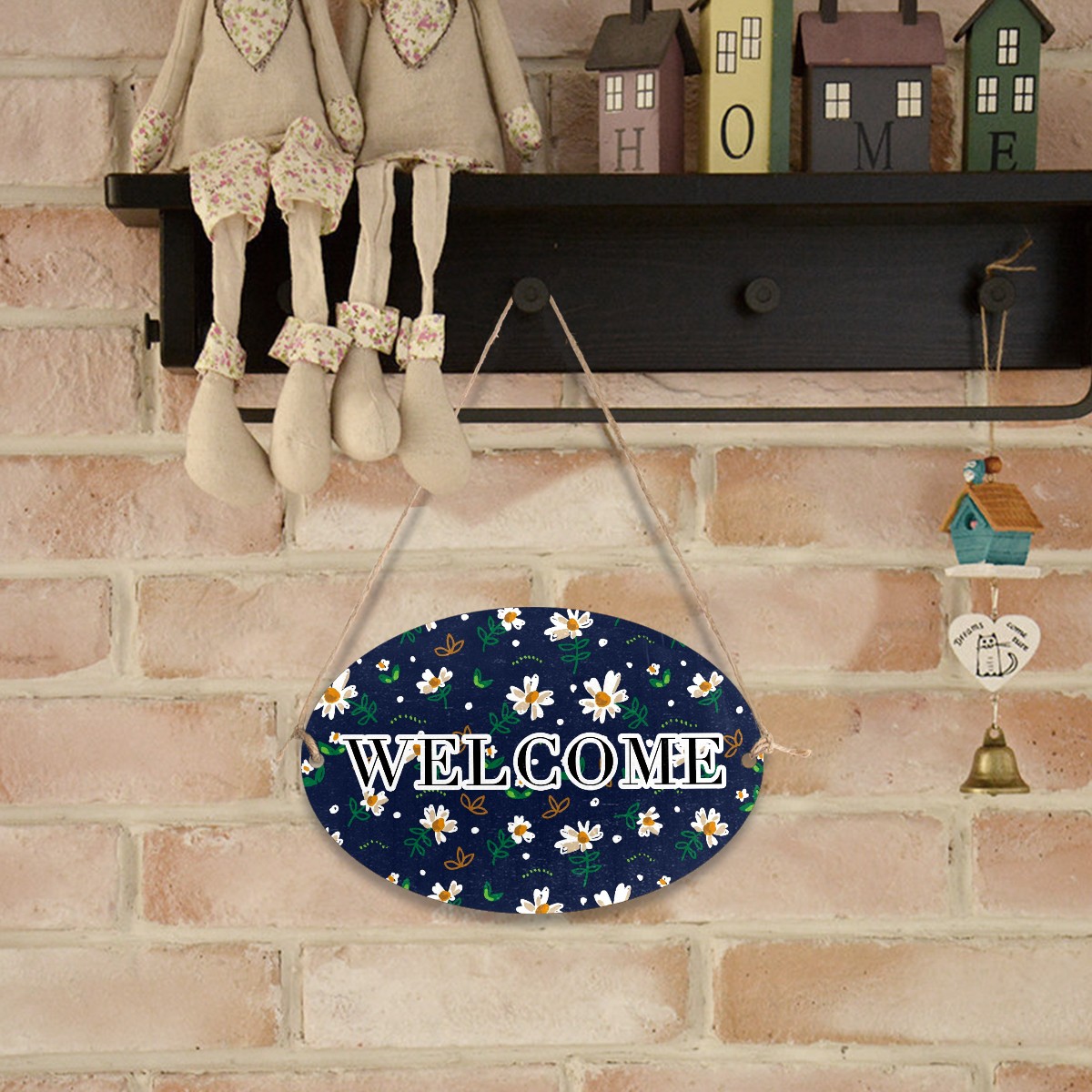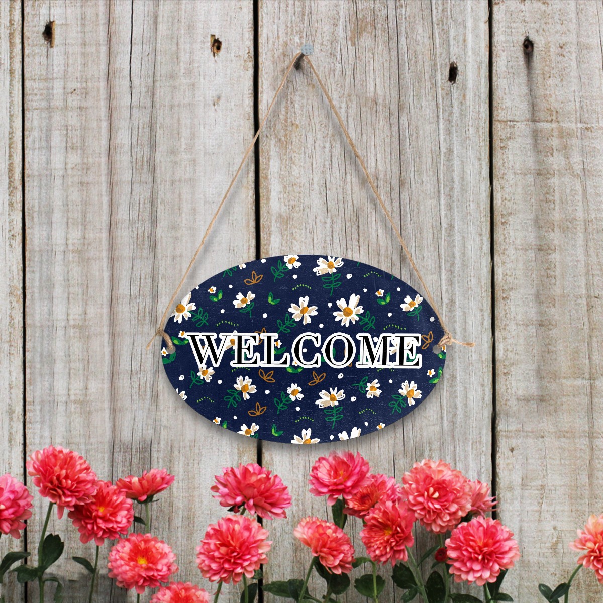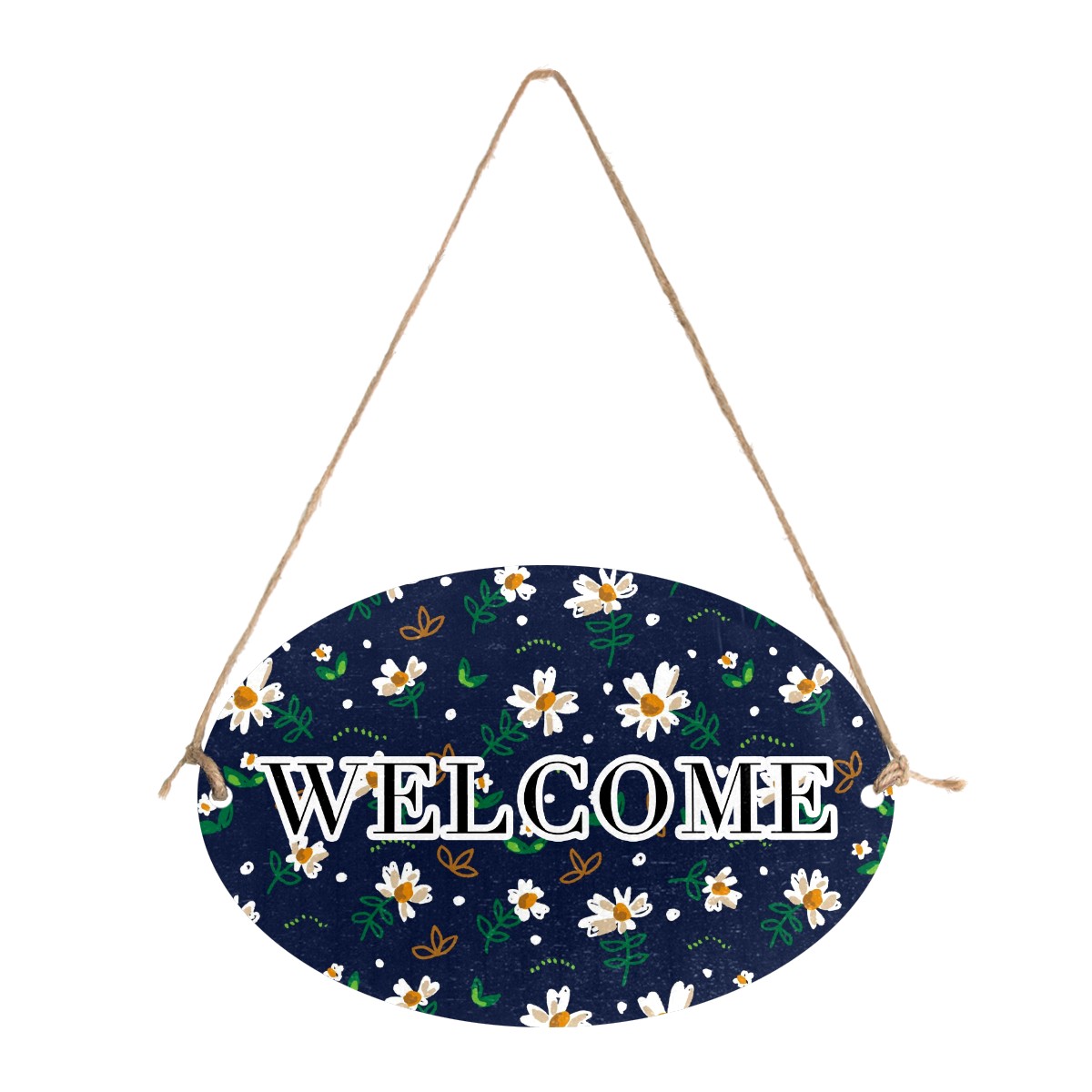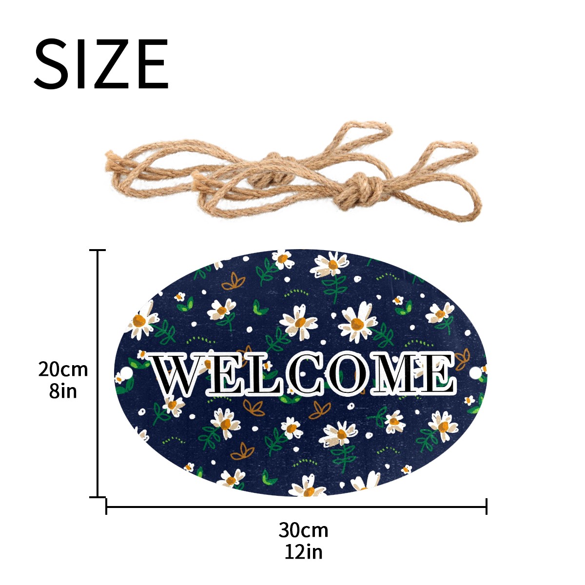 Welcome Sign White Daisy Green Leaves Dark Blue Oval Wood Printed Door Plate Plaque Wall Hanging Front Door Decor Porch Garden Decorations Home Office Yard Room 12x8in with Hang Rope