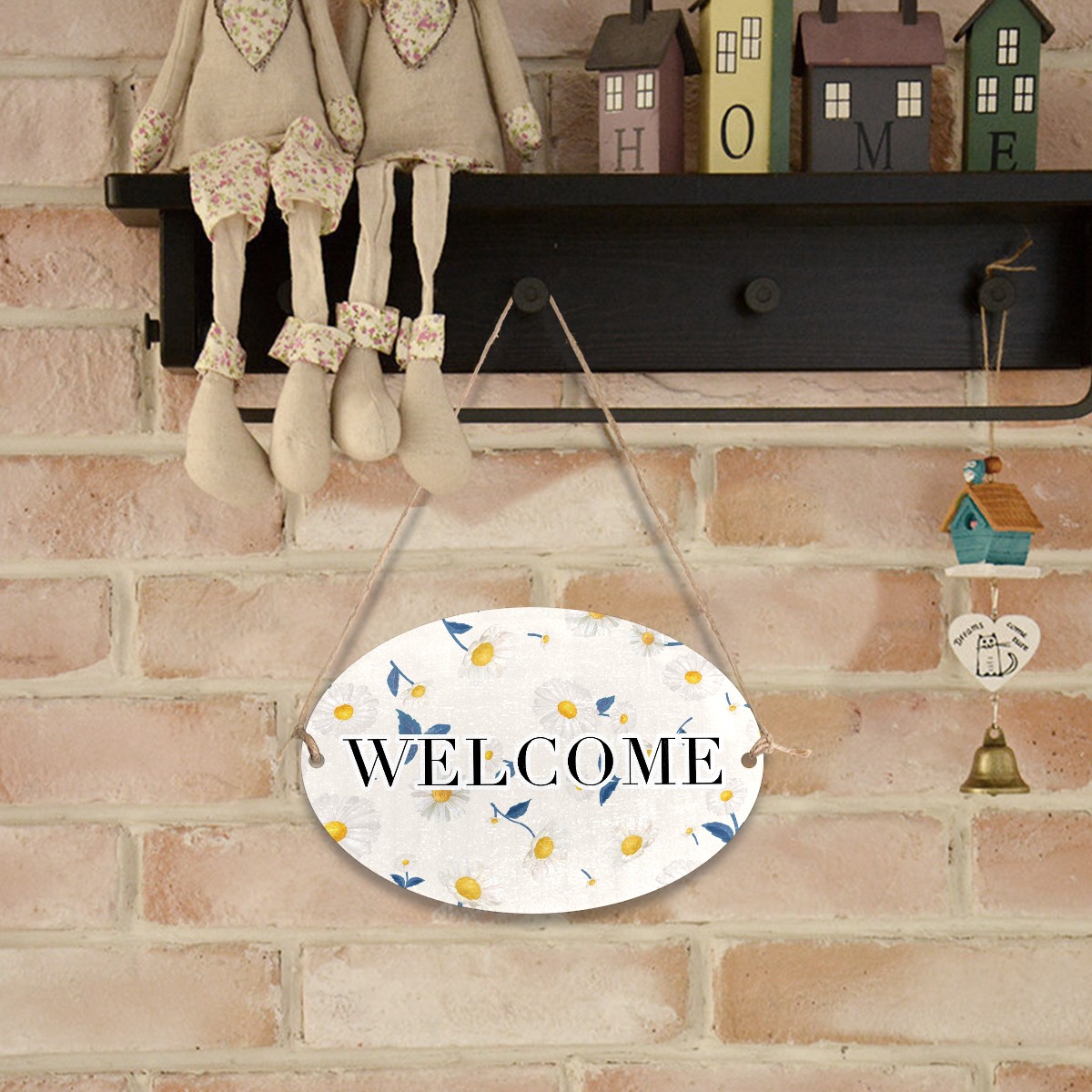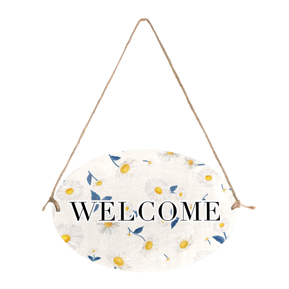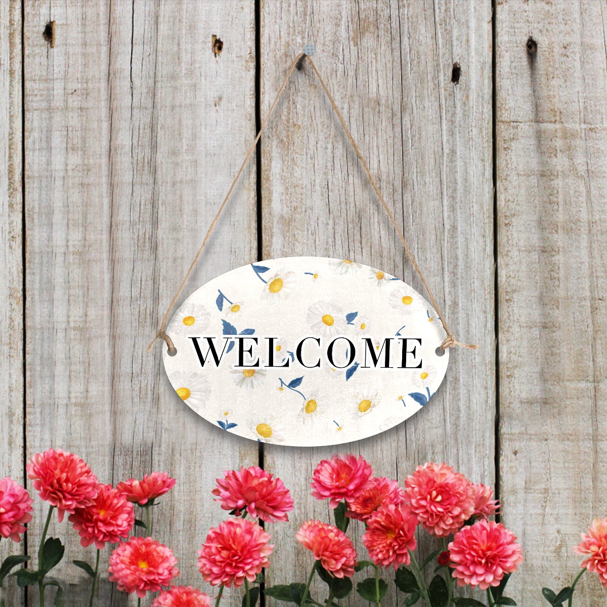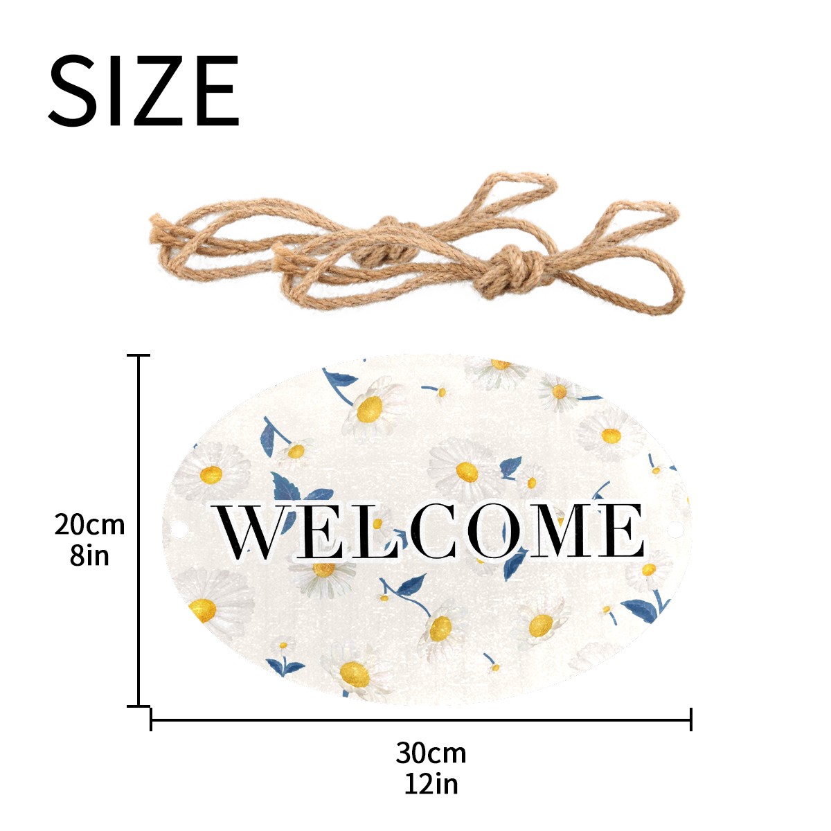 Welcome Sign White Daisy Flower Plant Pattern Oval Wood Printed Door Plate Plaque Wall Hanging Front Door Decor Porch Garden Decorations Home Office Yard Room 12x8in with Hang Rope