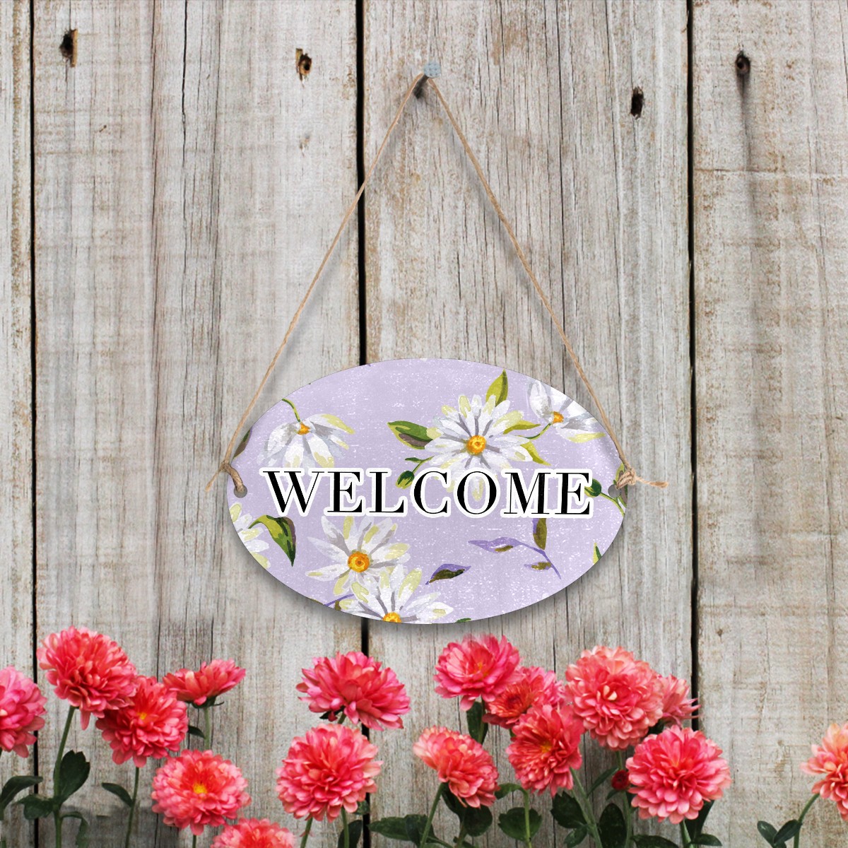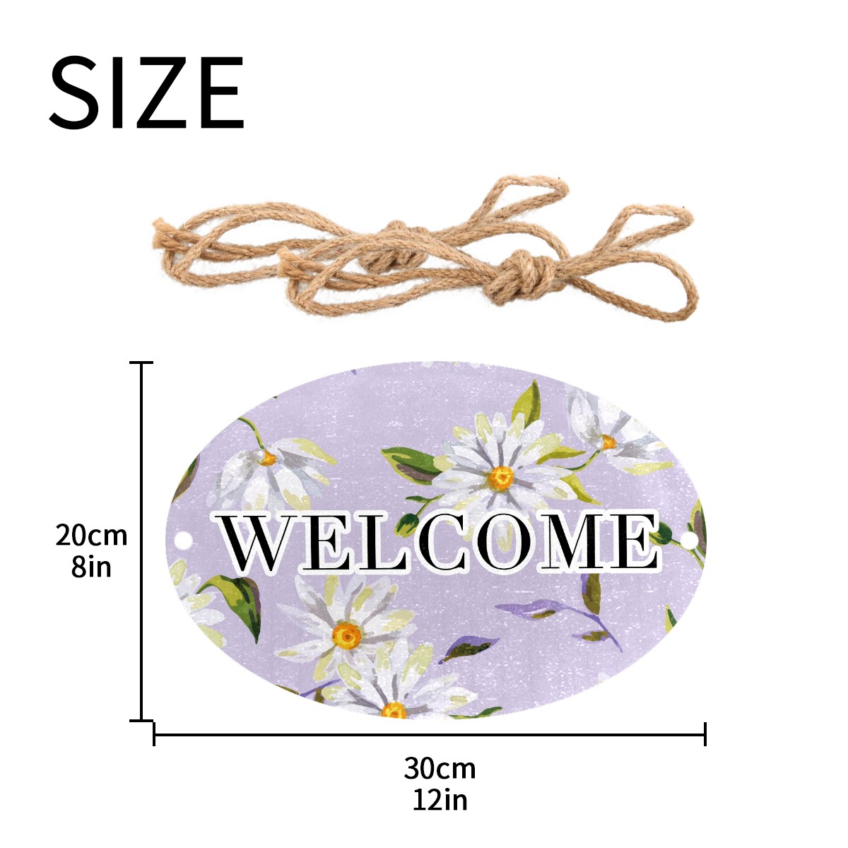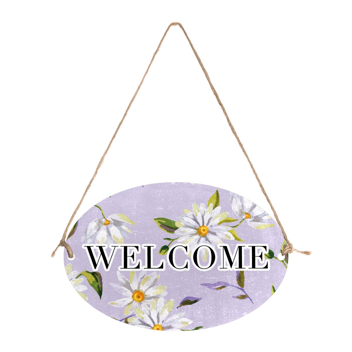Welcome Sign Watercolor White Daisy PurpleBackground Oval Wood Printed Door Plate Plaque Wall Hanging Front Door Decor Porch Garden Decorations Home Office Yard Room 12x8in with Hang Rope