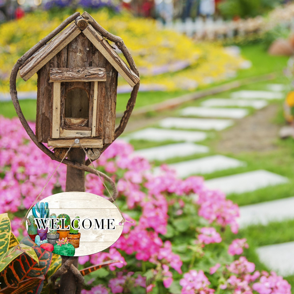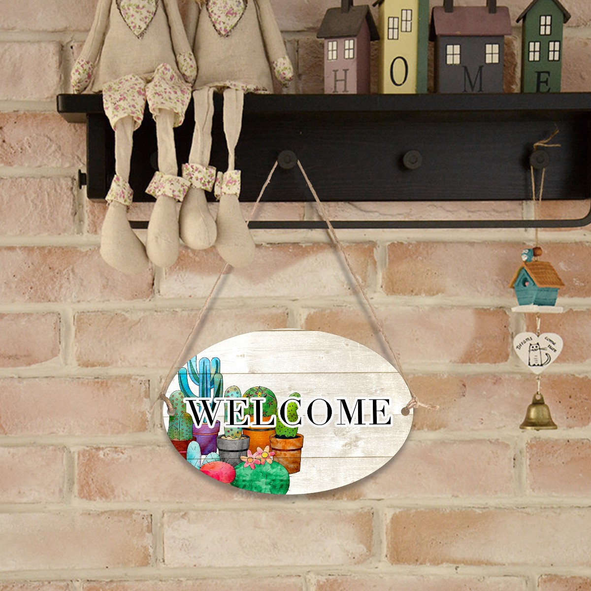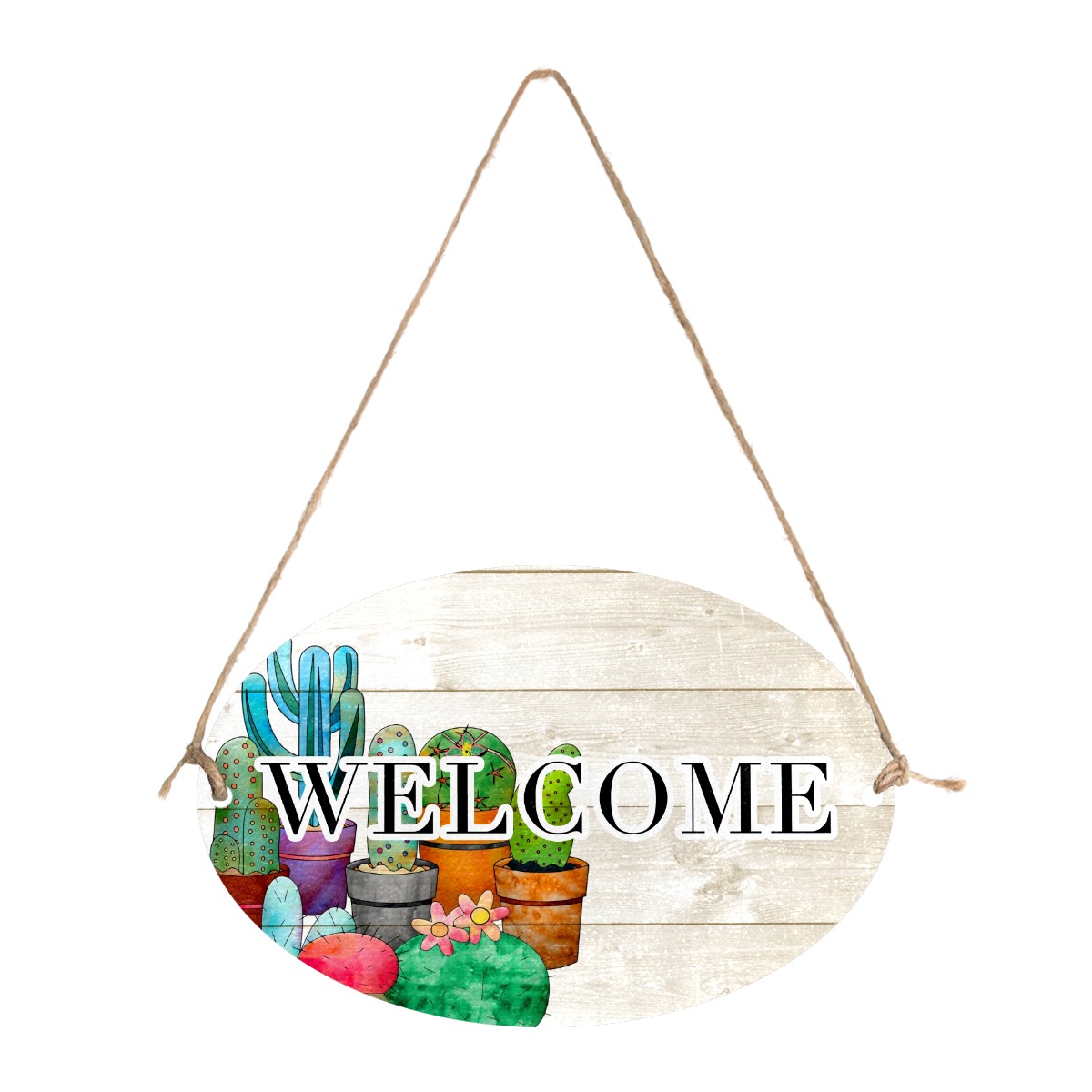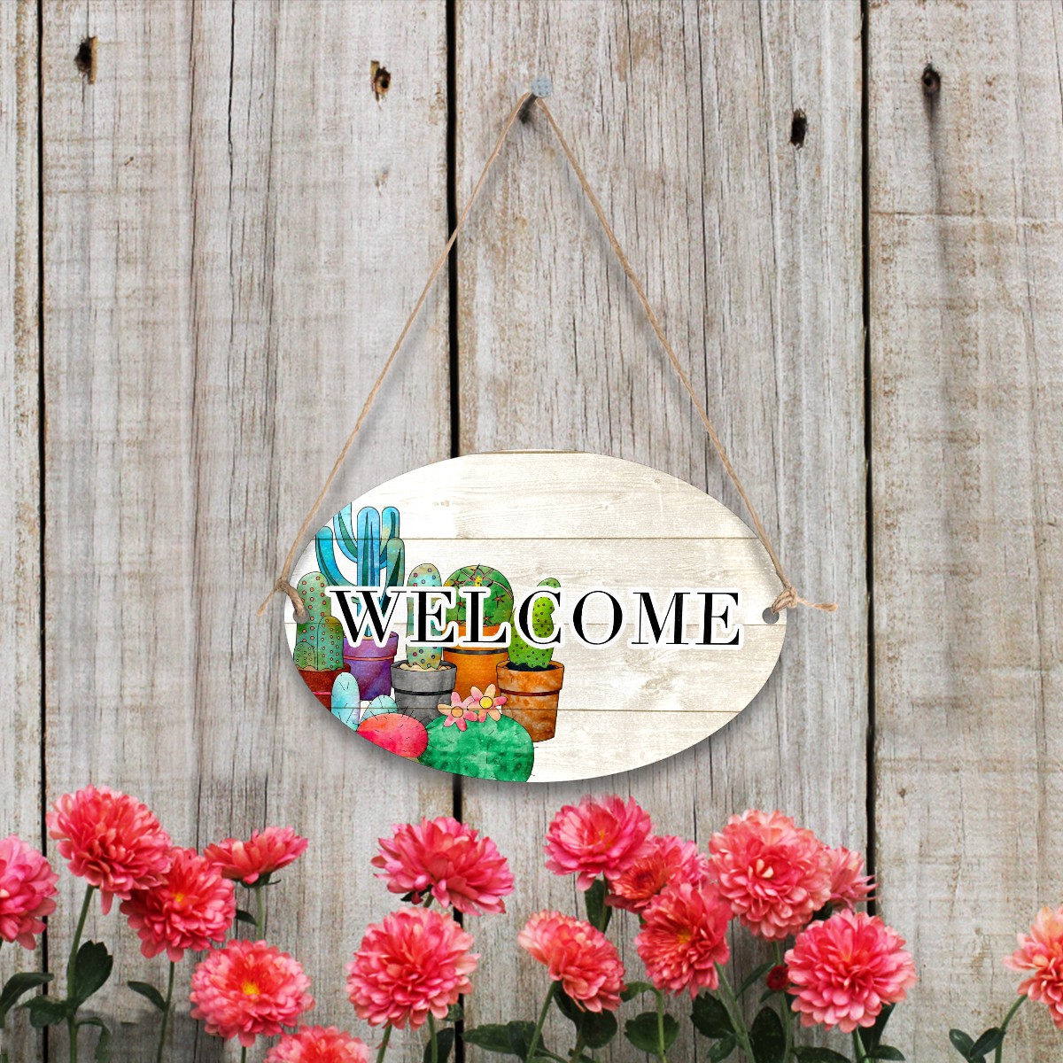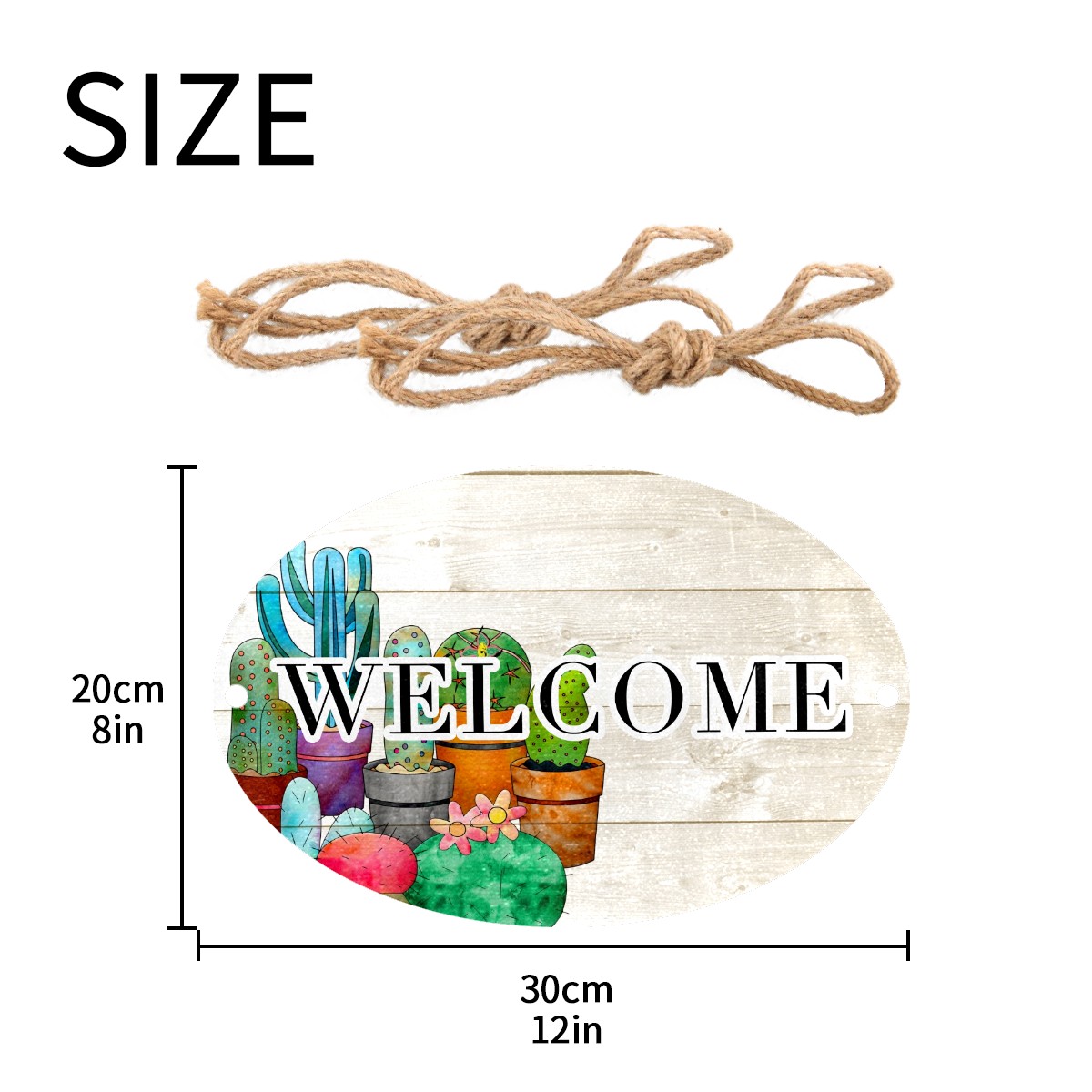 Welcome Sign Potted Cactus Plant Gray Wood Board Oval Wood Printed Door Plate Plaque Wall Hanging Front Door Decor Porch Garden Decorations Home Office Yard Room 12x8in with Hang Rope