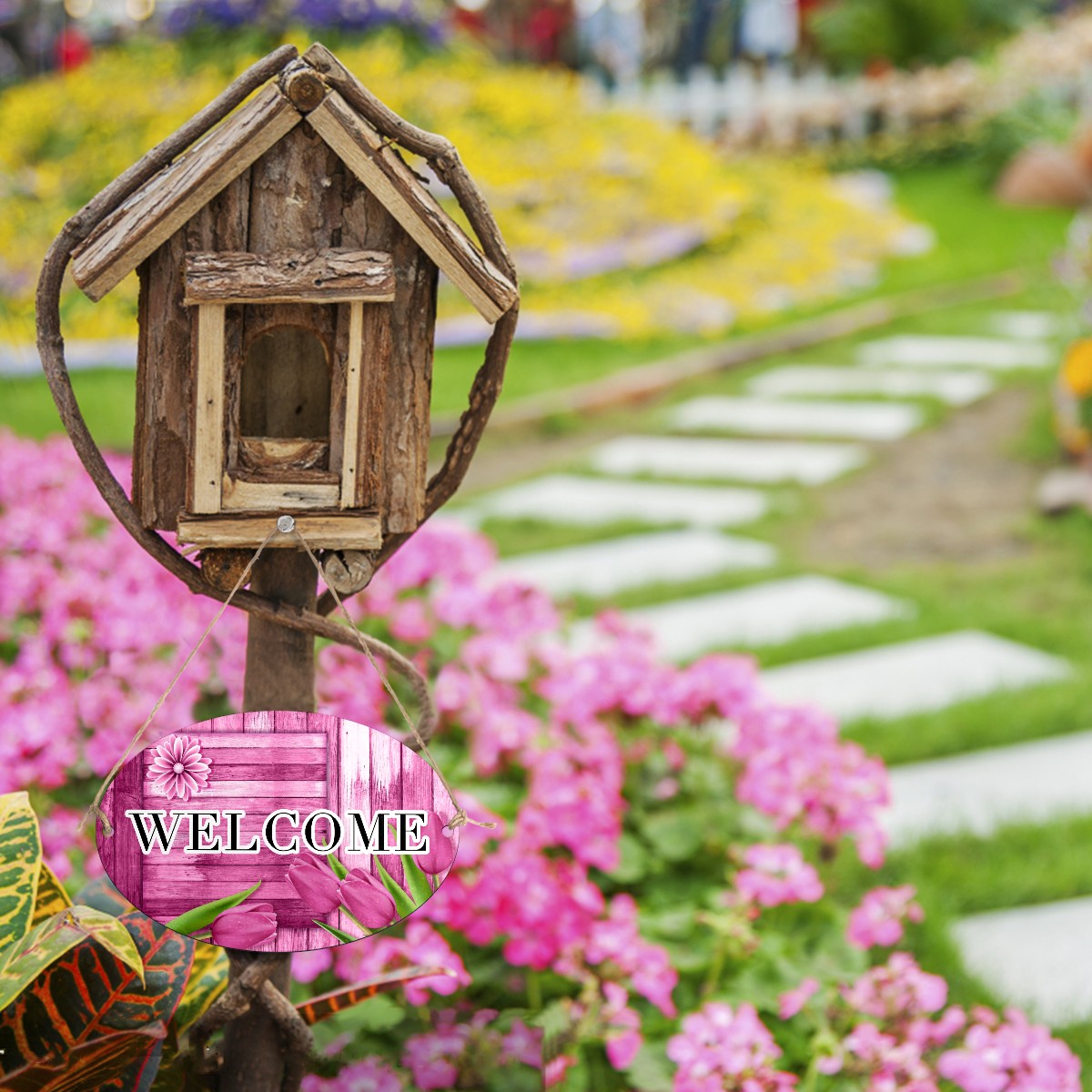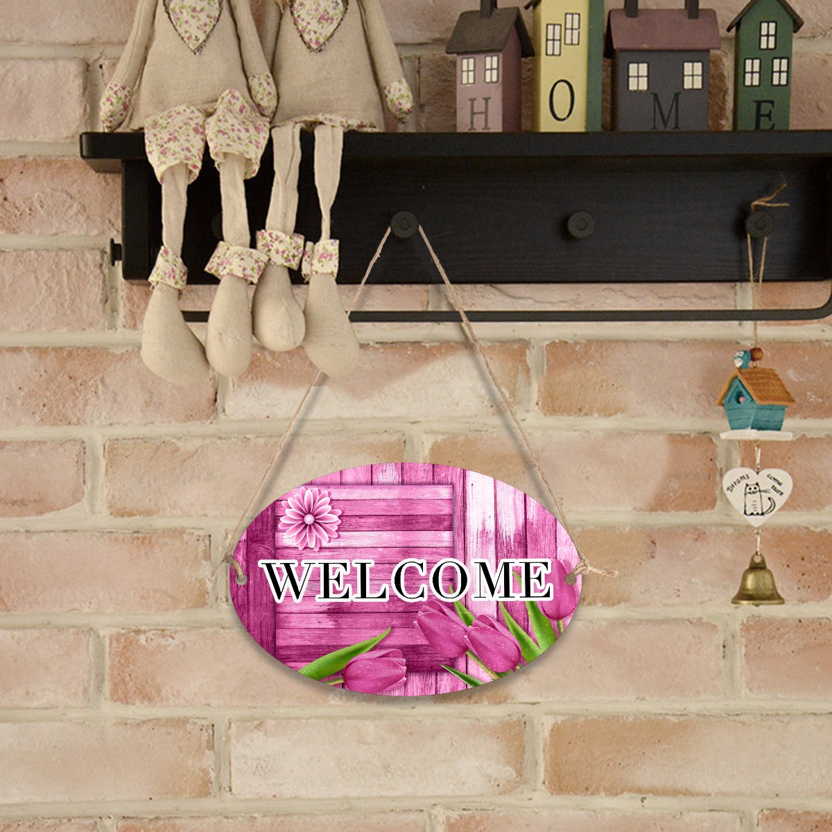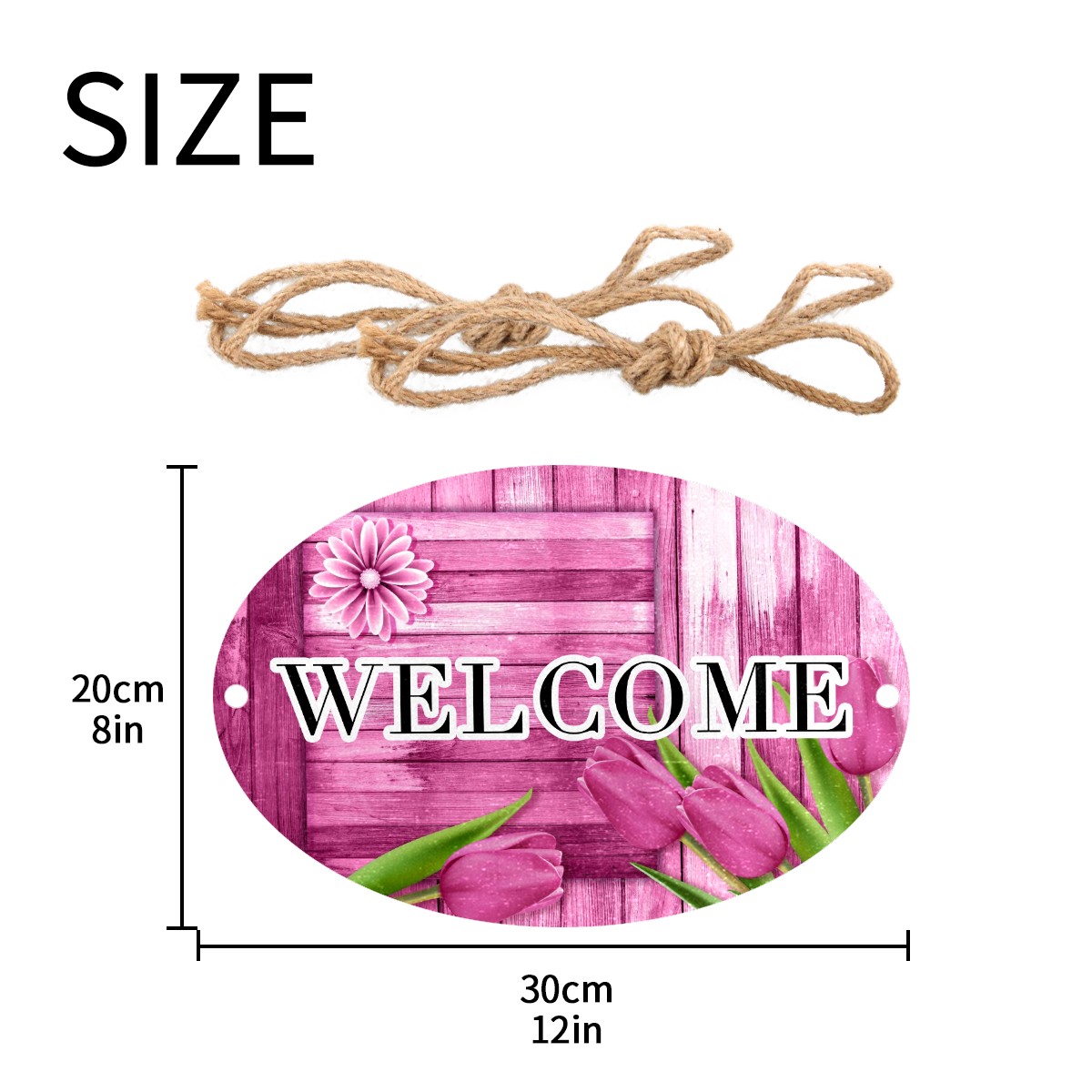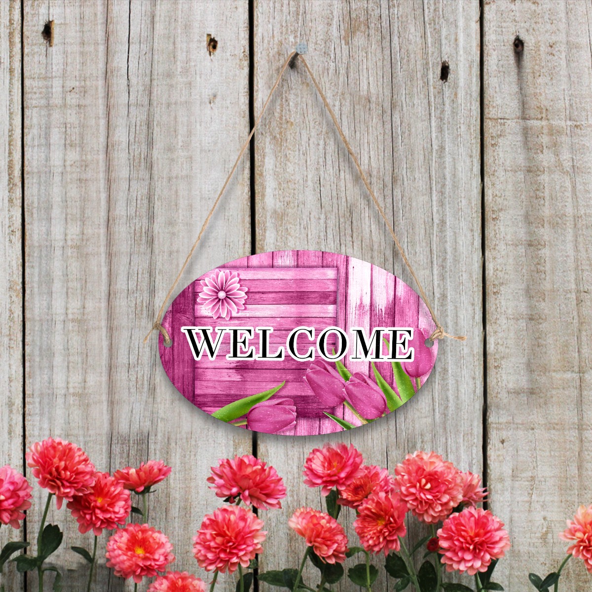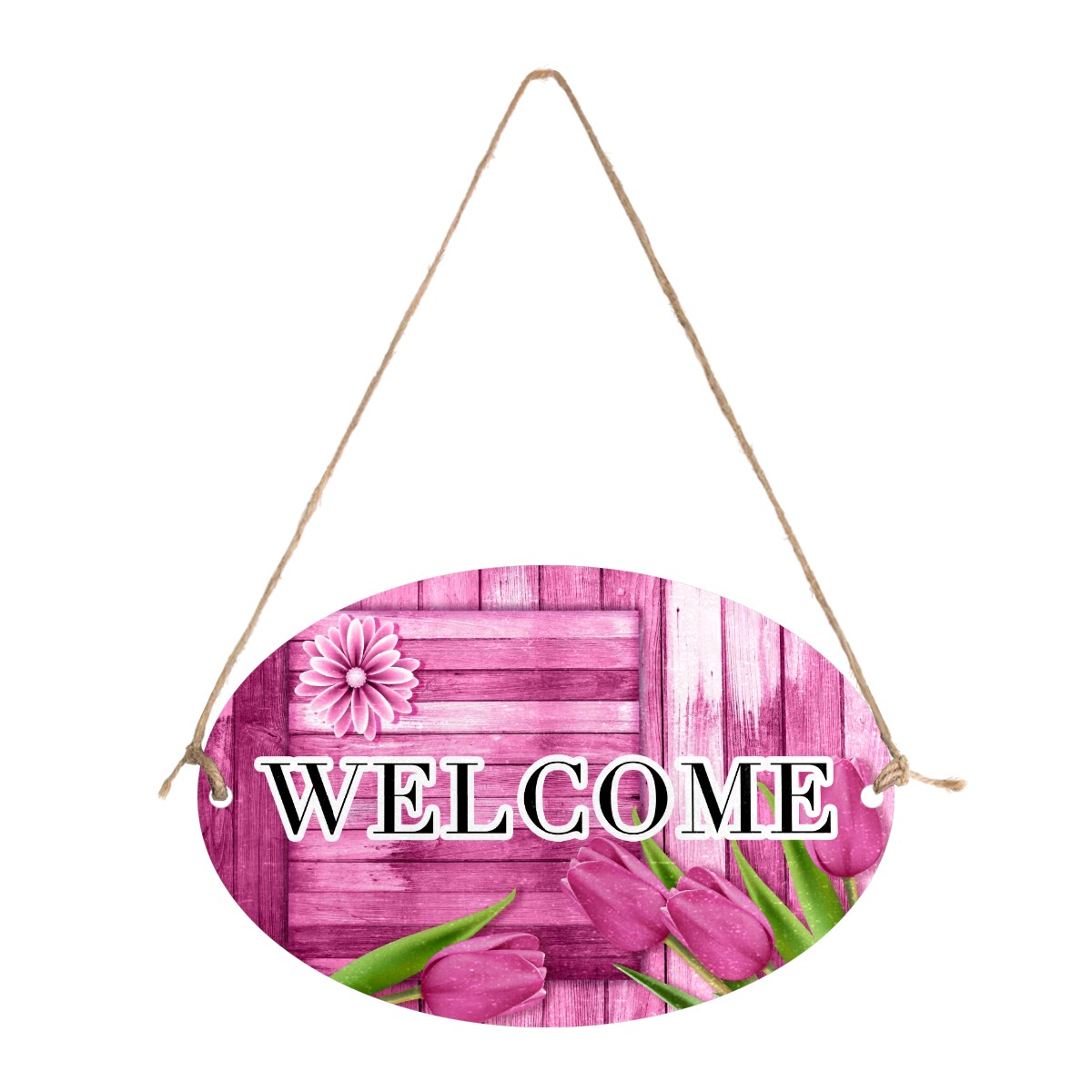 Welcome Sign Pink Tulip Wood Board Rustic Oval Wood Printed Door Plate Plaque Wall Hanging Front Door Decor Porch Garden Decorations Home Office Yard Room 12x8in with Hang Rope