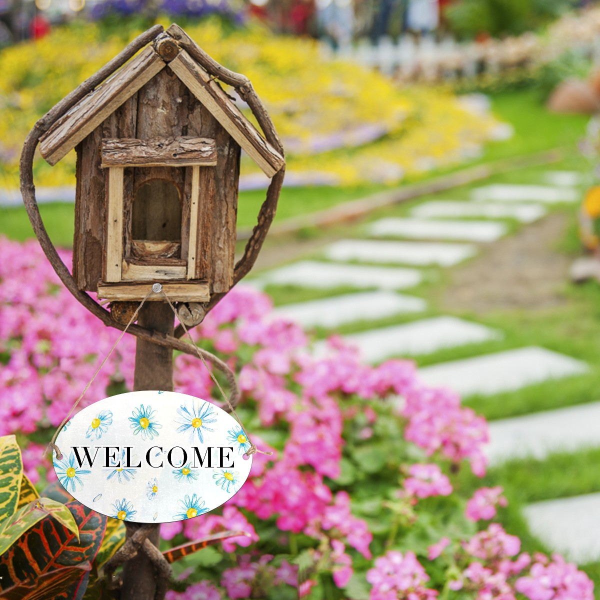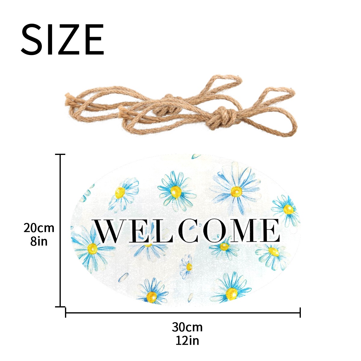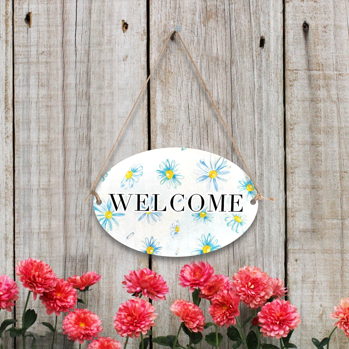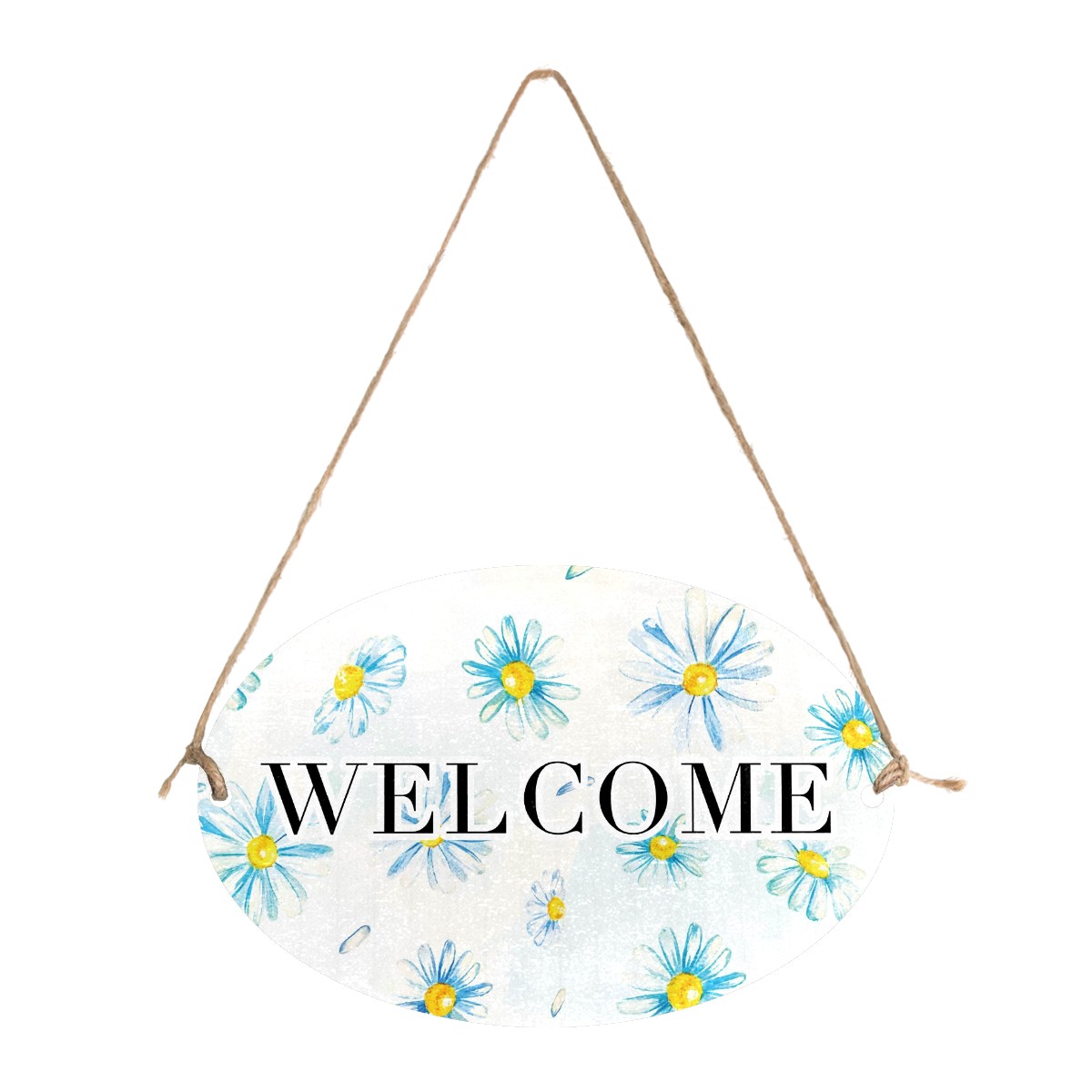 Welcome Sign Painted Blue Daisy Flower Watercolor Oval Wood Printed Door Plate Plaque Wall Hanging Front Door Decor Porch Garden Decorations Home Office Yard Room 12x8in with Hang Rope