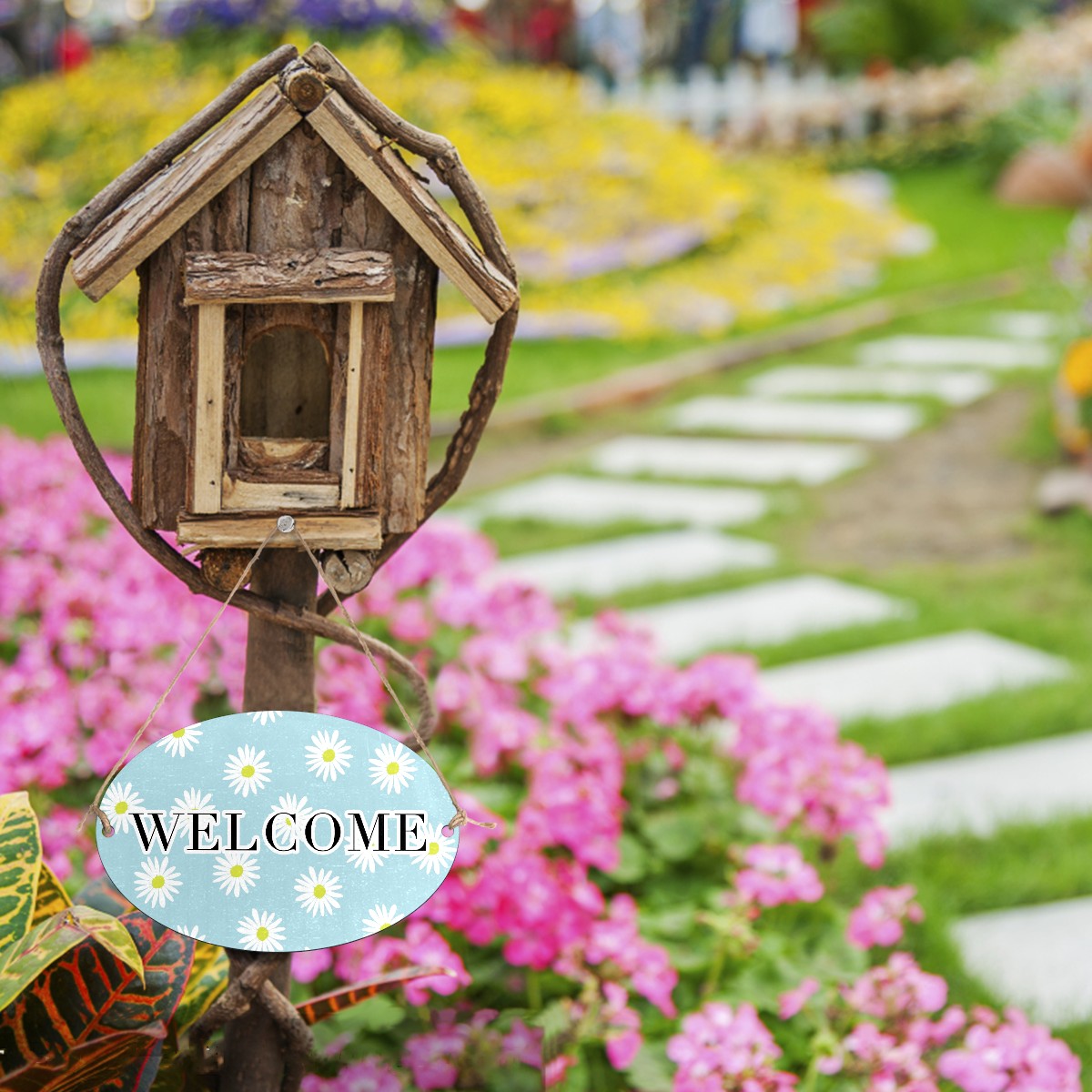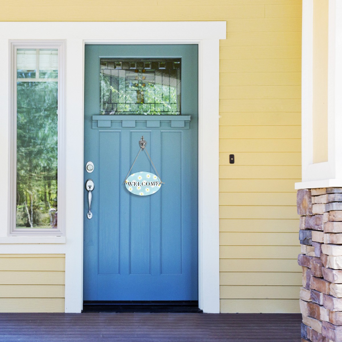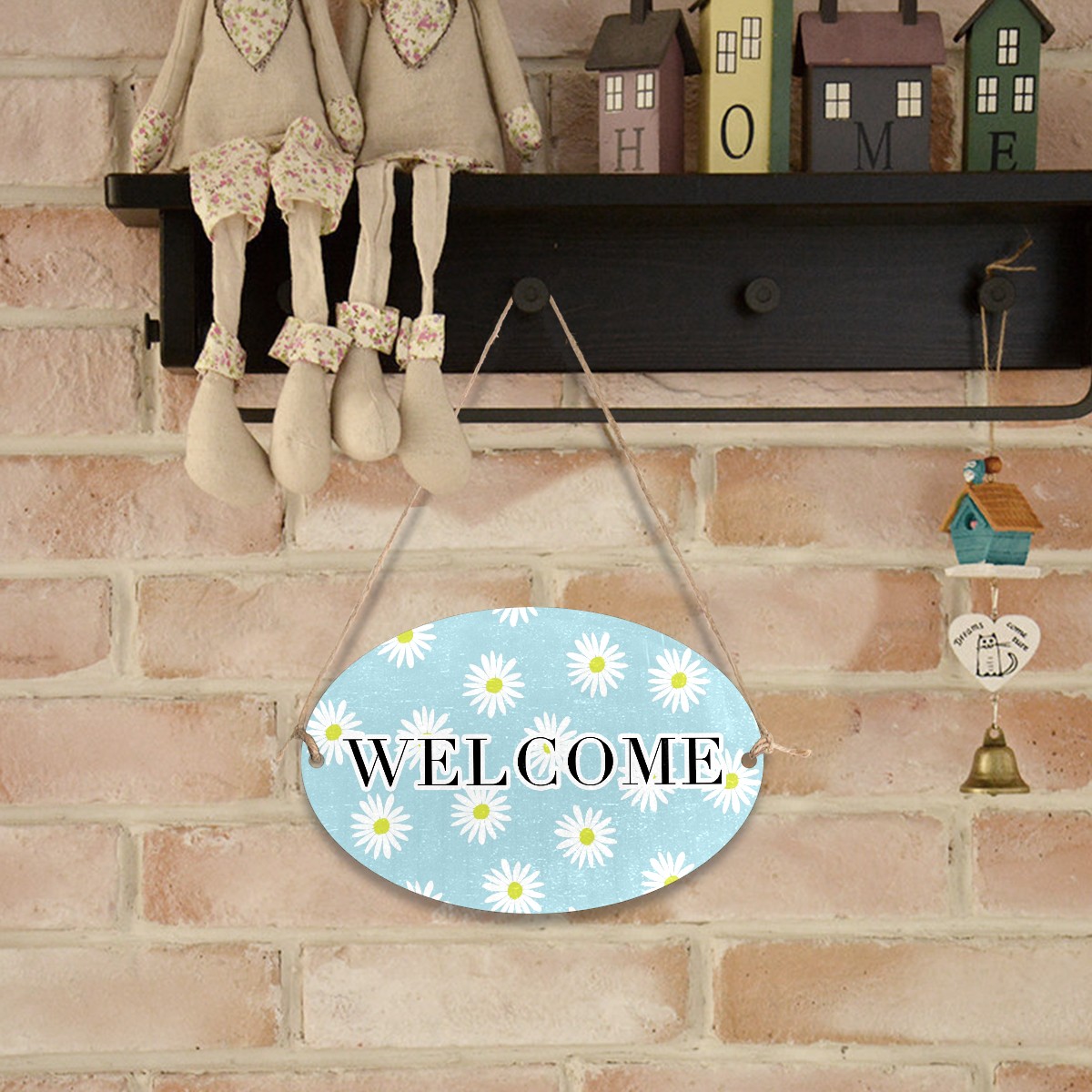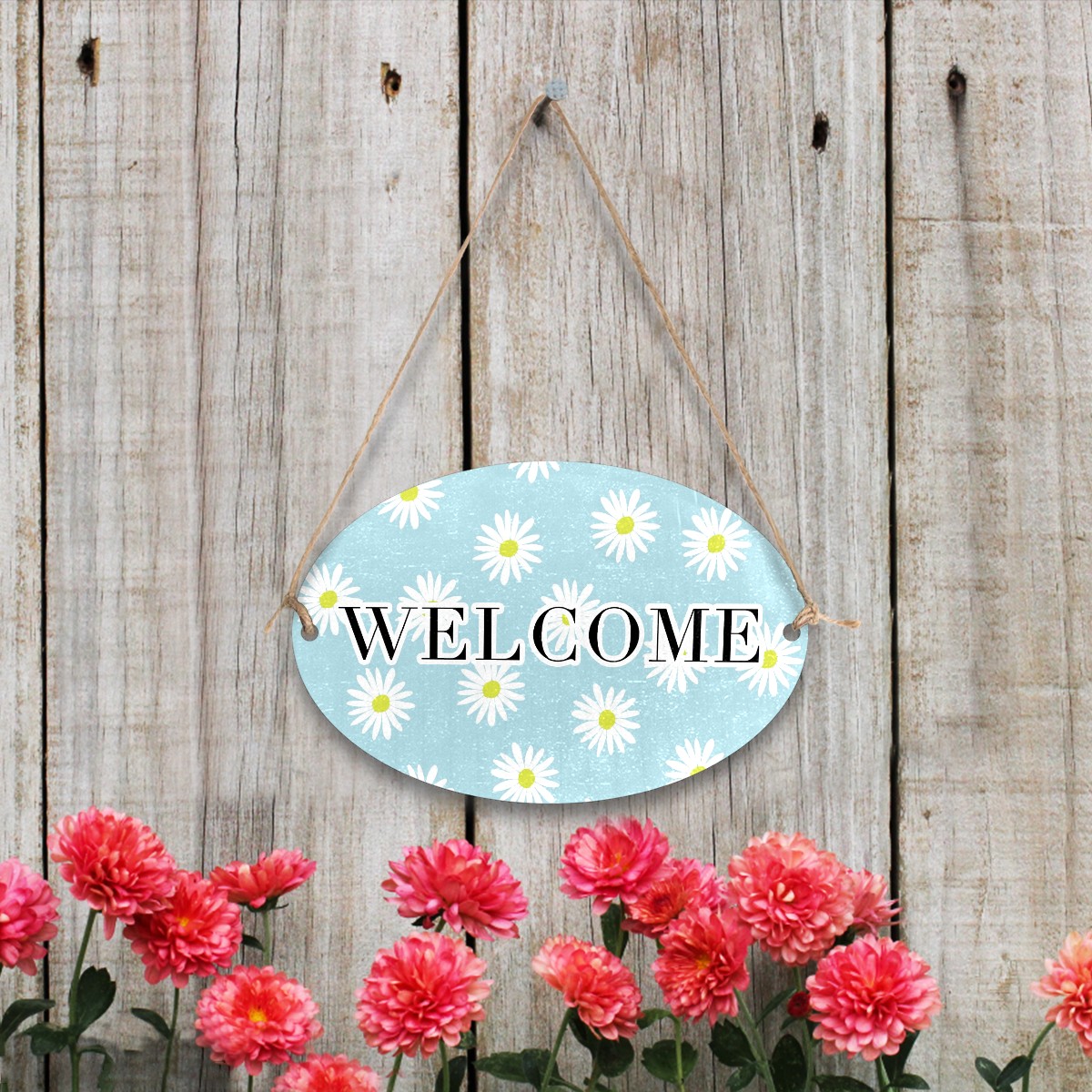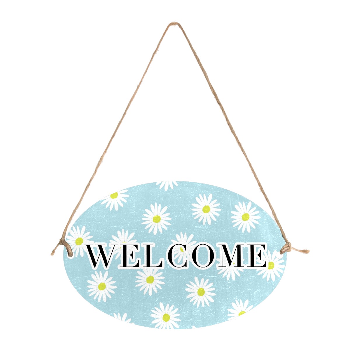 Welcome Sign Light Blue White Daisies Flower Pattern Oval Wood Printed Door Plate Plaque Wall Hanging Front Door Decor Porch Garden Decorations Home Office Yard Room 12x8in with Hang Rope