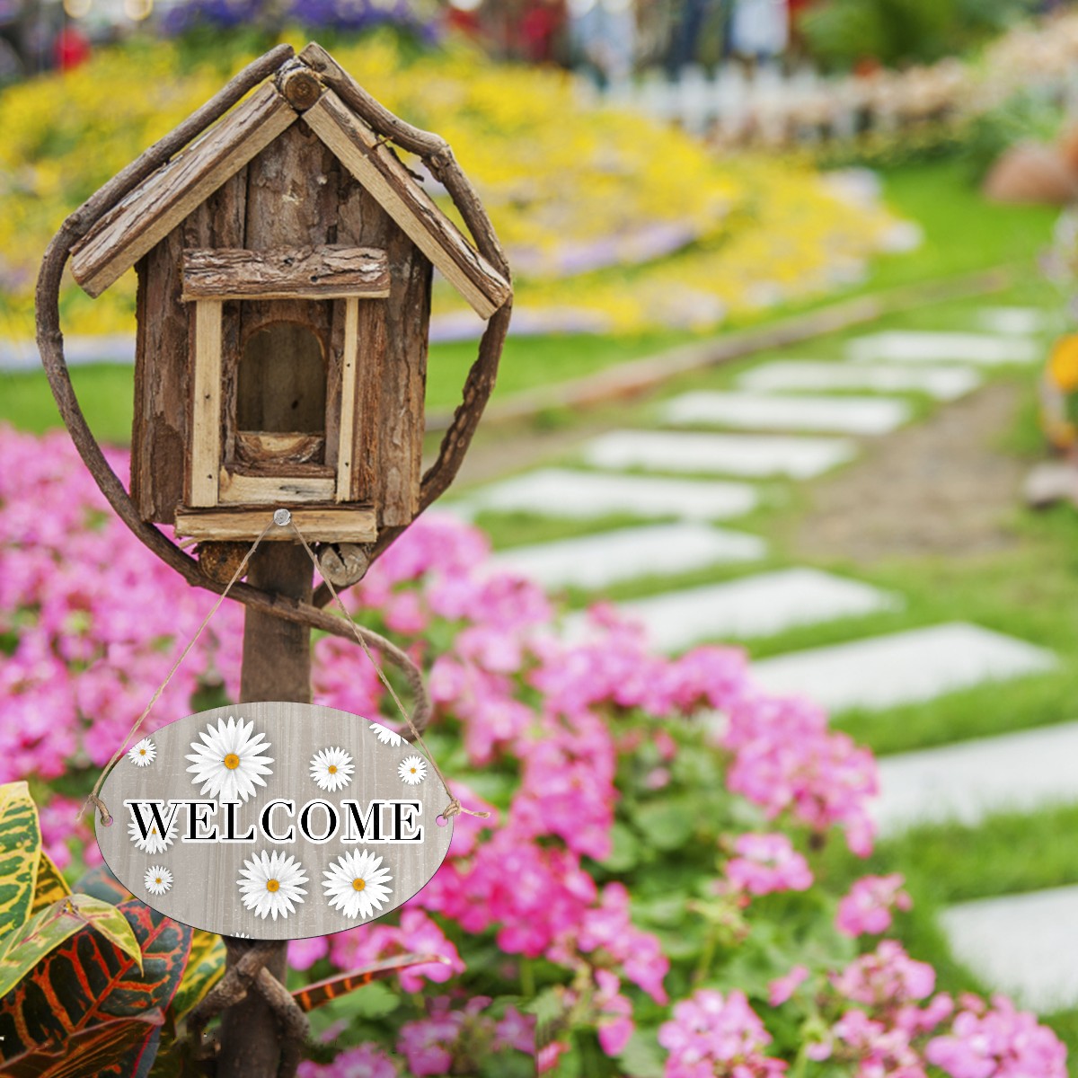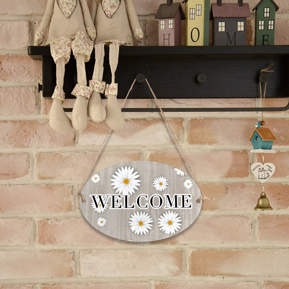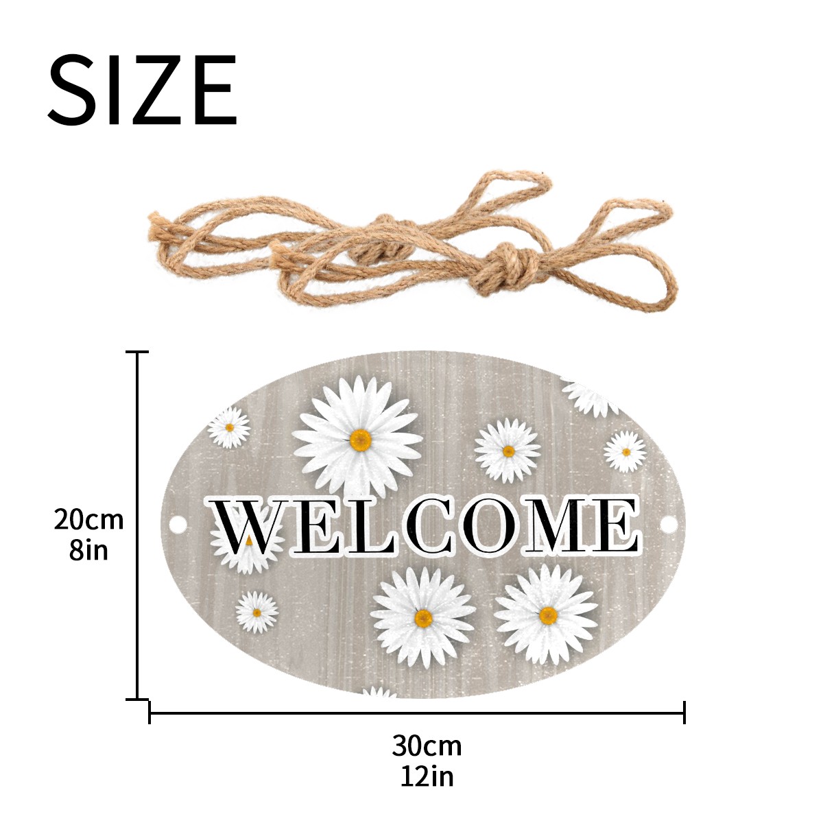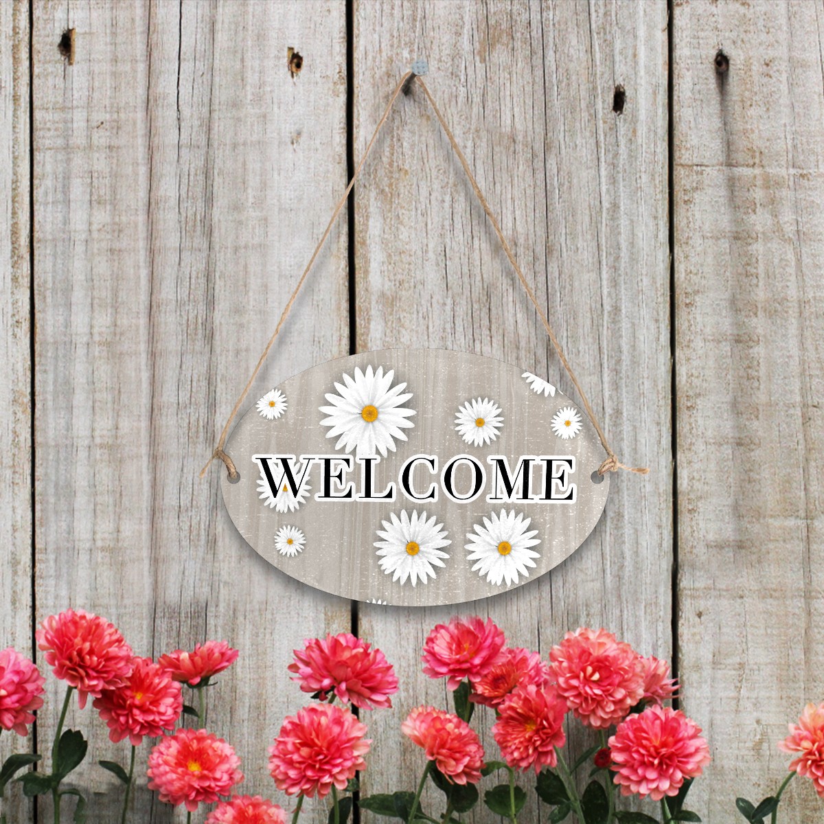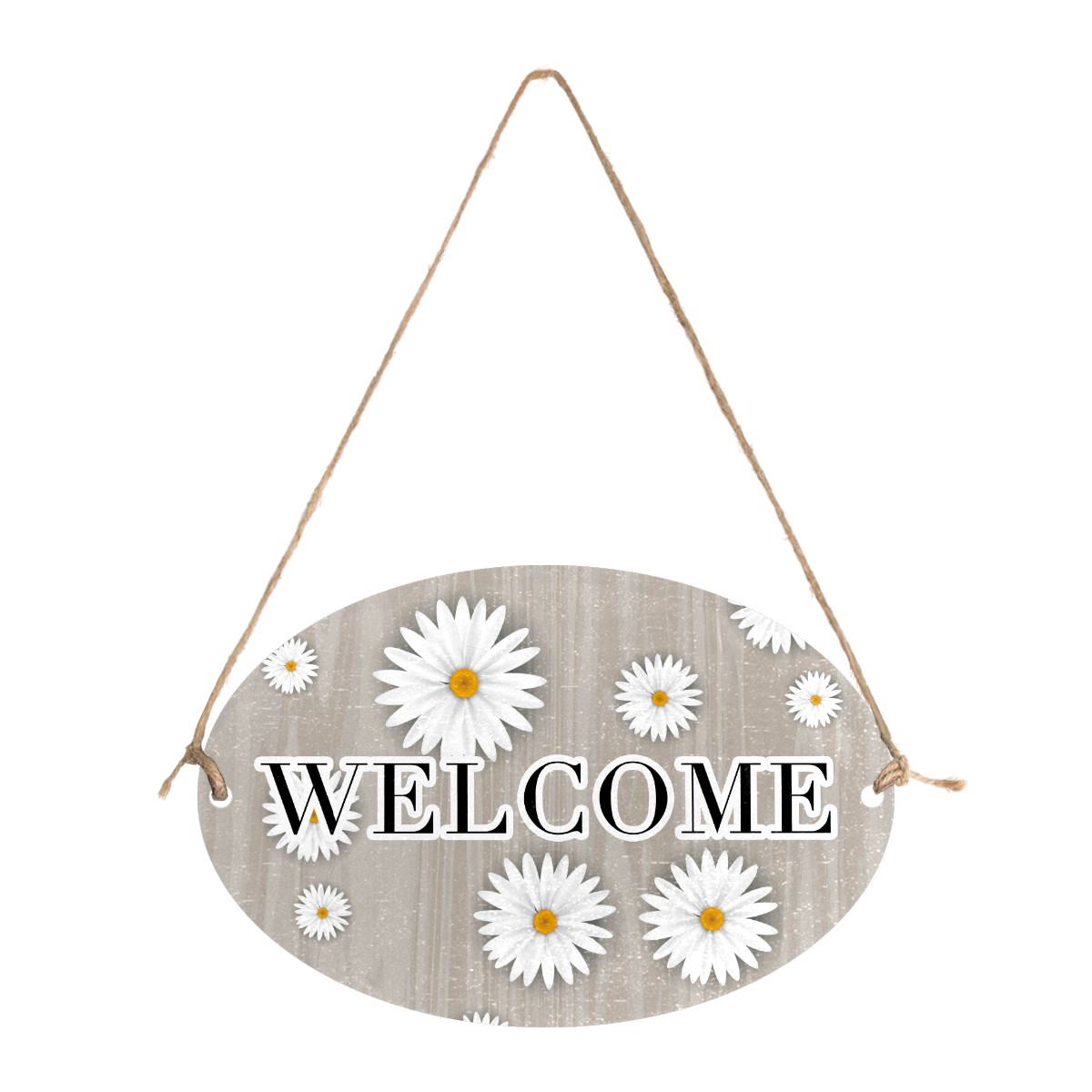 Welcome Sign Grey Wood White Daisy Oval Wood Printed Door Plate Plaque Wall Hanging Front Door Decor Porch Garden Decorations Home Office Yard Room 12x8in with Hang Rope
