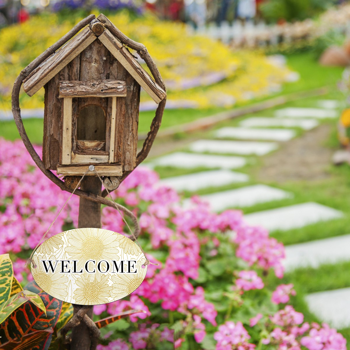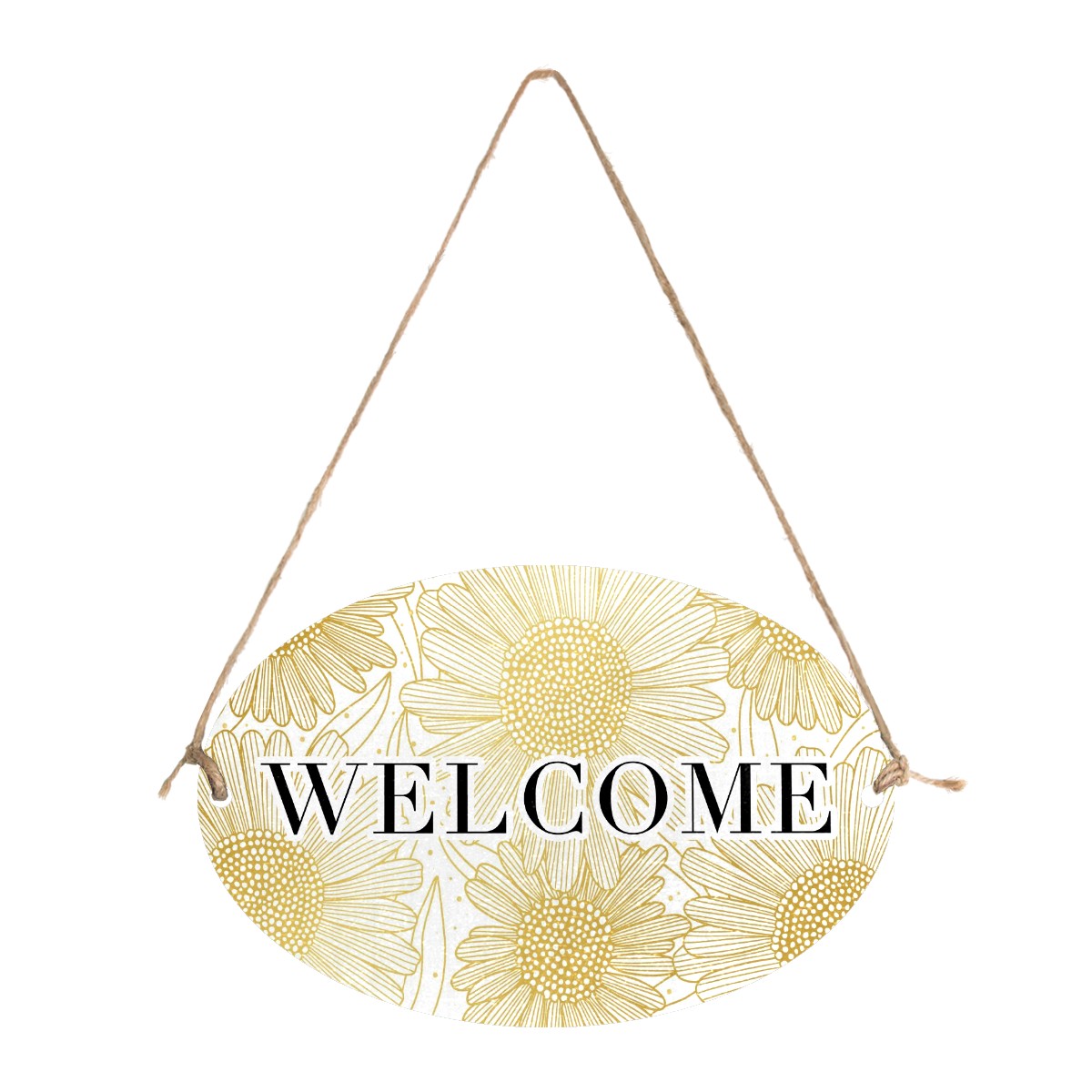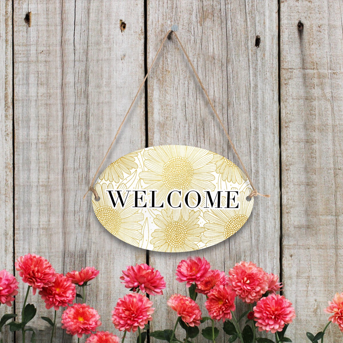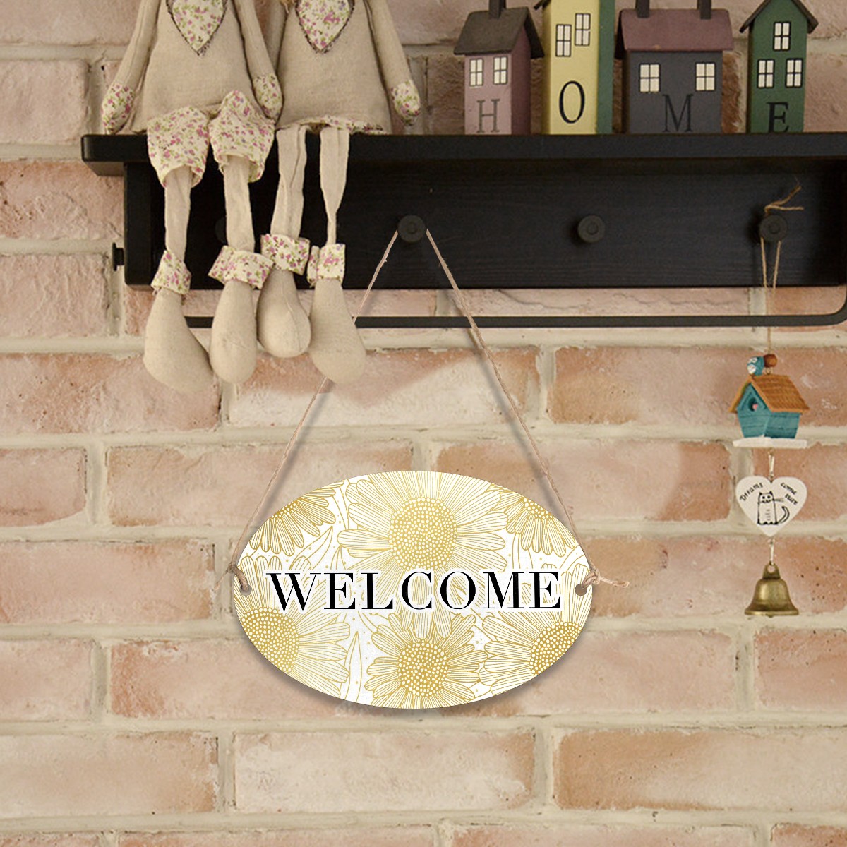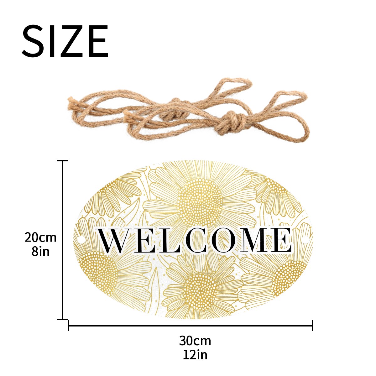 Welcome Sign Golden Hand Drawn Sunflower Pattern Oval Wood Printed Door Plate Plaque Wall Hanging Front Door Decor Porch Garden Decorations Home Office Yard Room 12x8in with Hang Rope