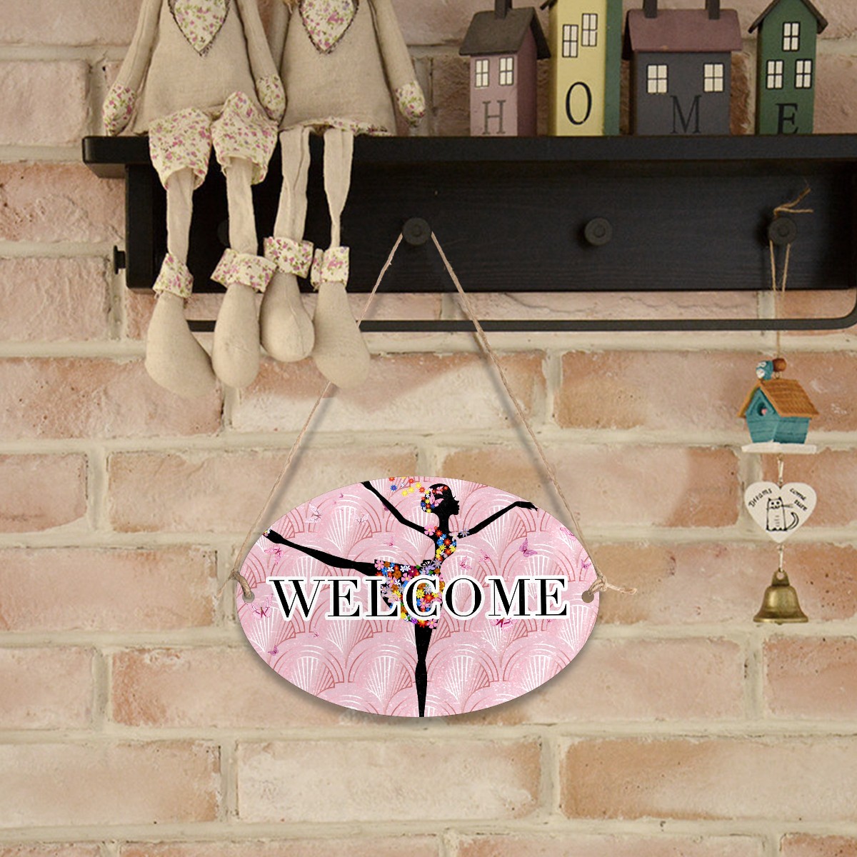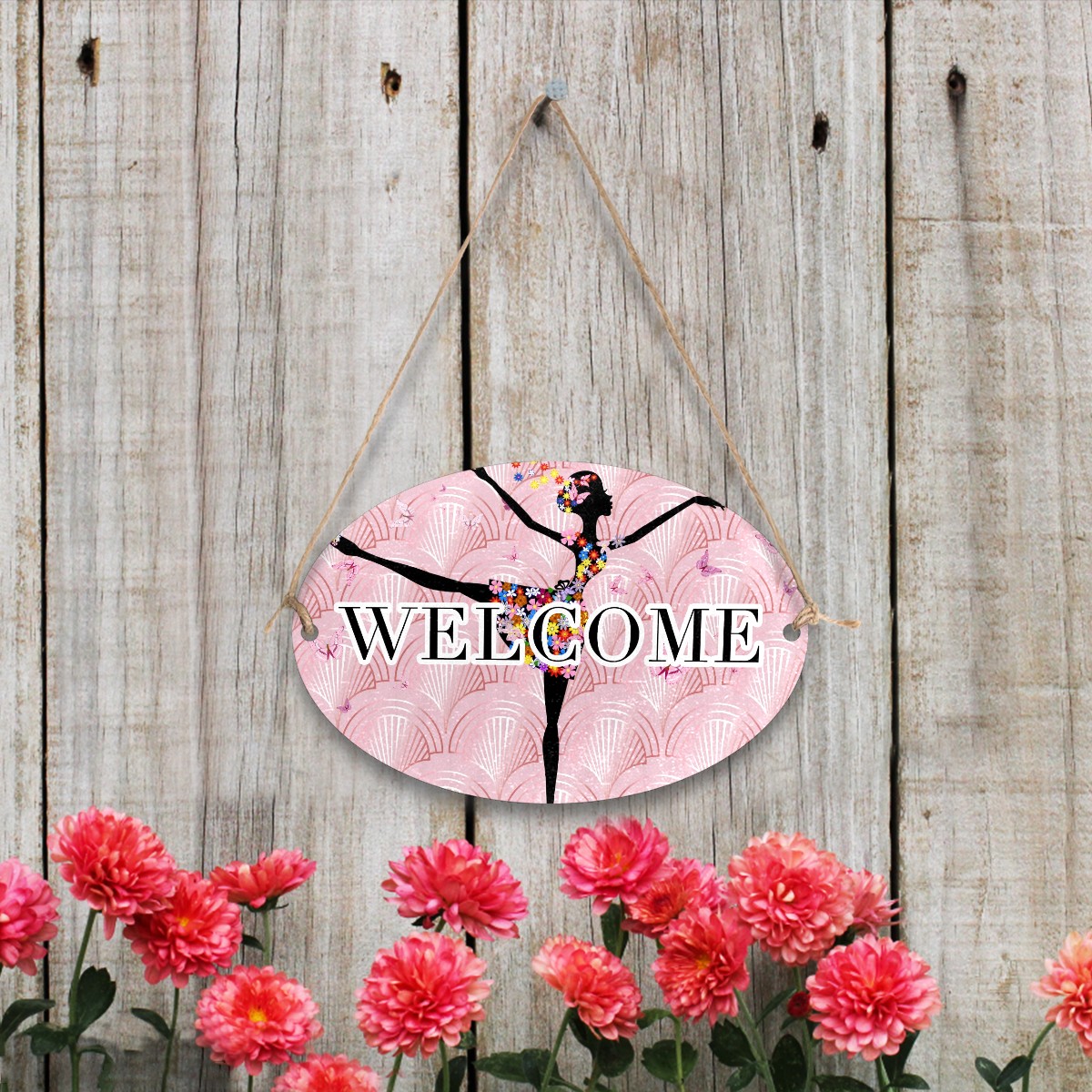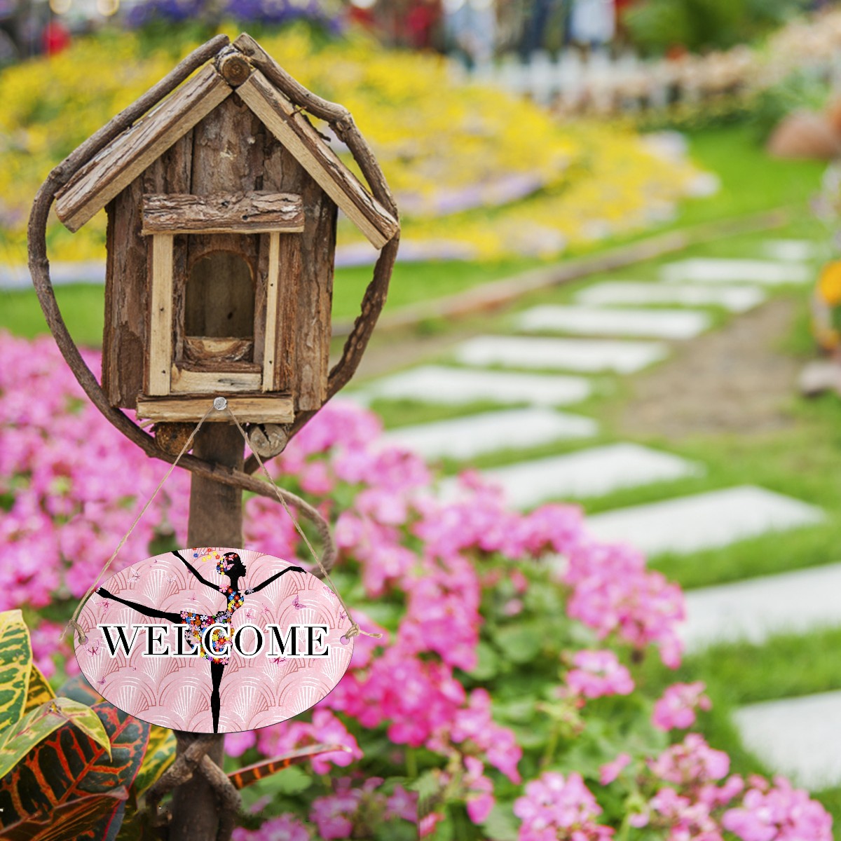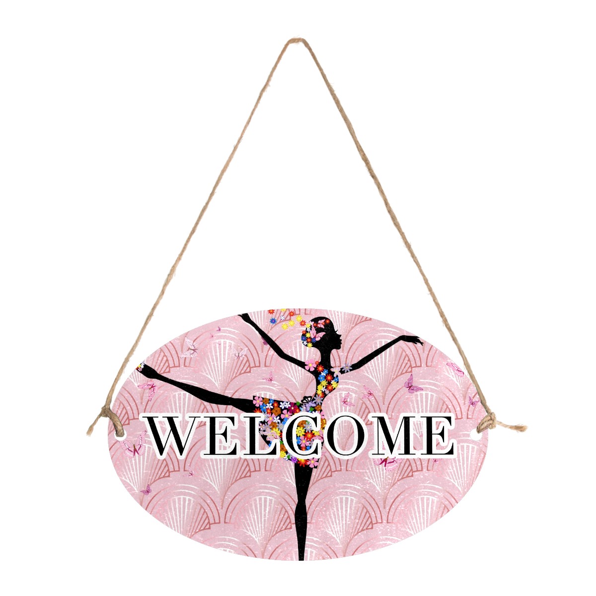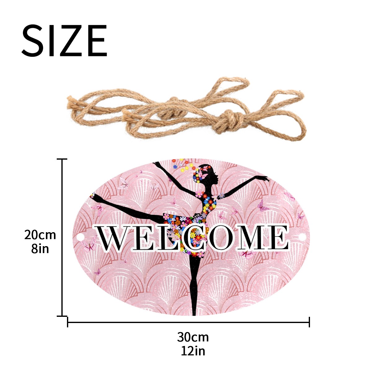 Welcome Sign Floral Ballet Girl Pink Scale Pattern Oval Wood Printed Door Plate Plaque Wall Hanging Front Door Decor Porch Garden Decorations Home Office Yard Room 12x8in with Hang Rope
