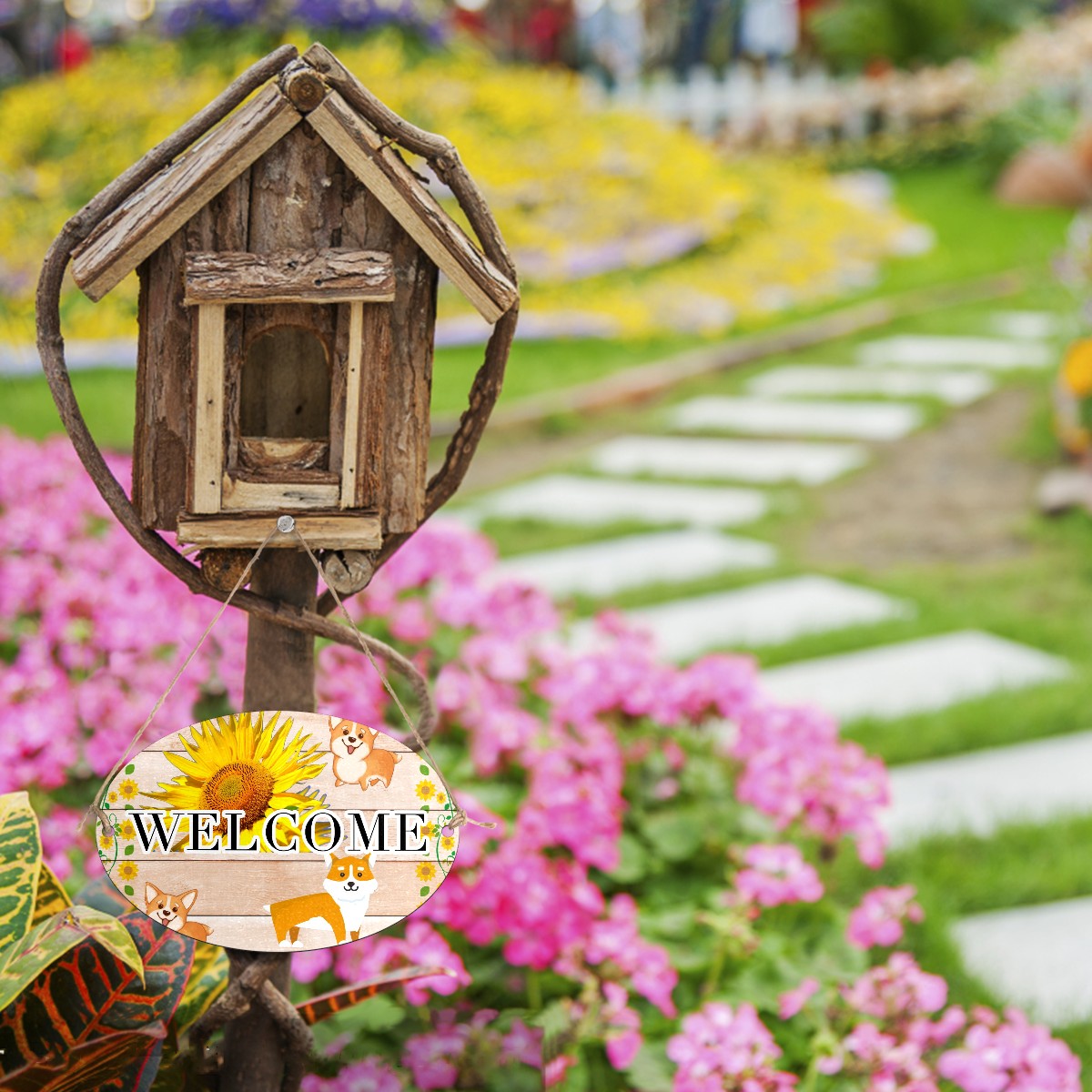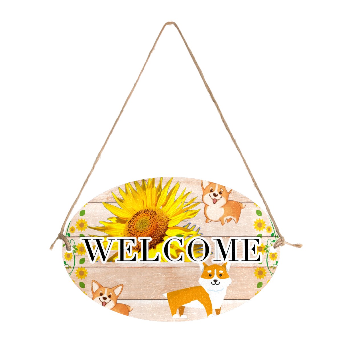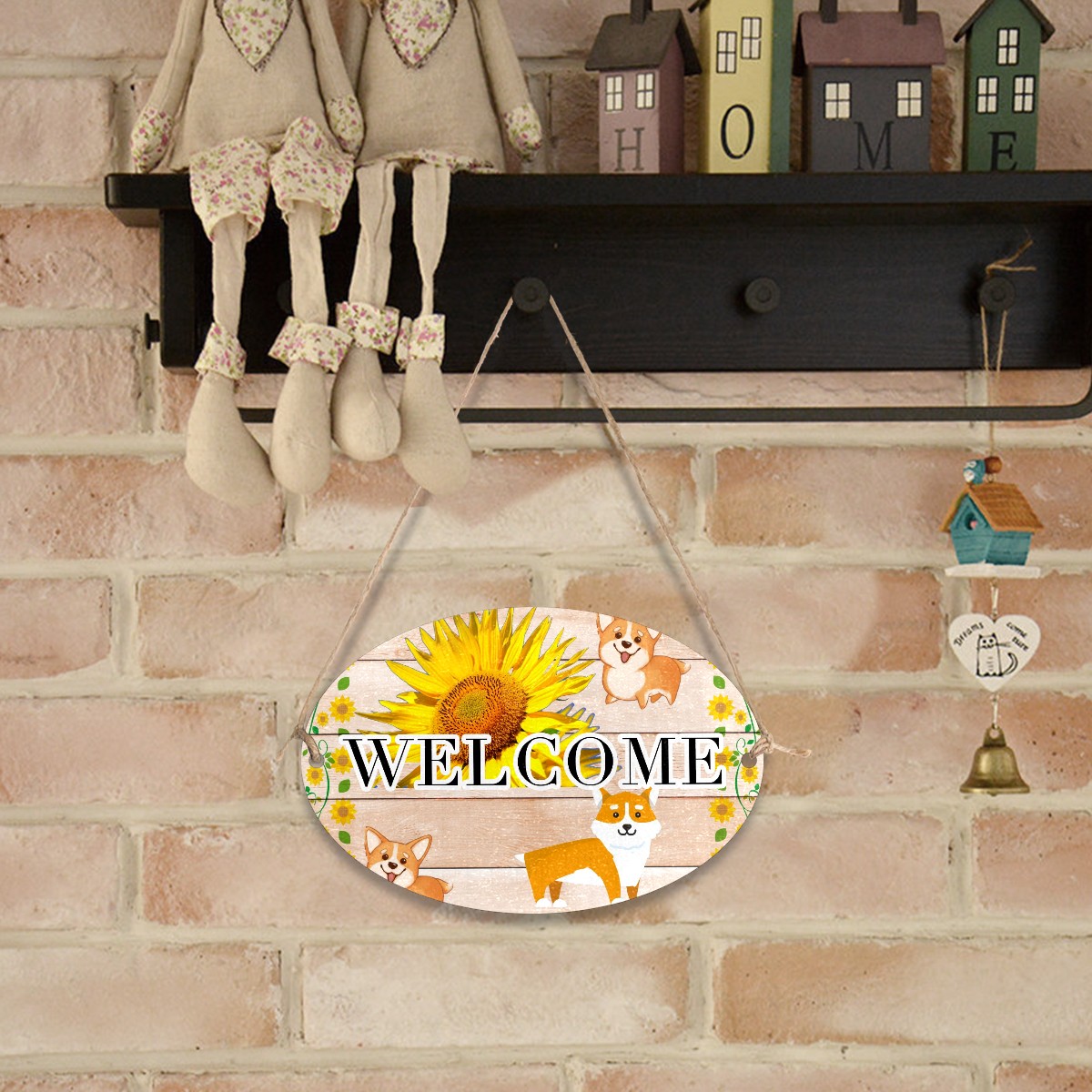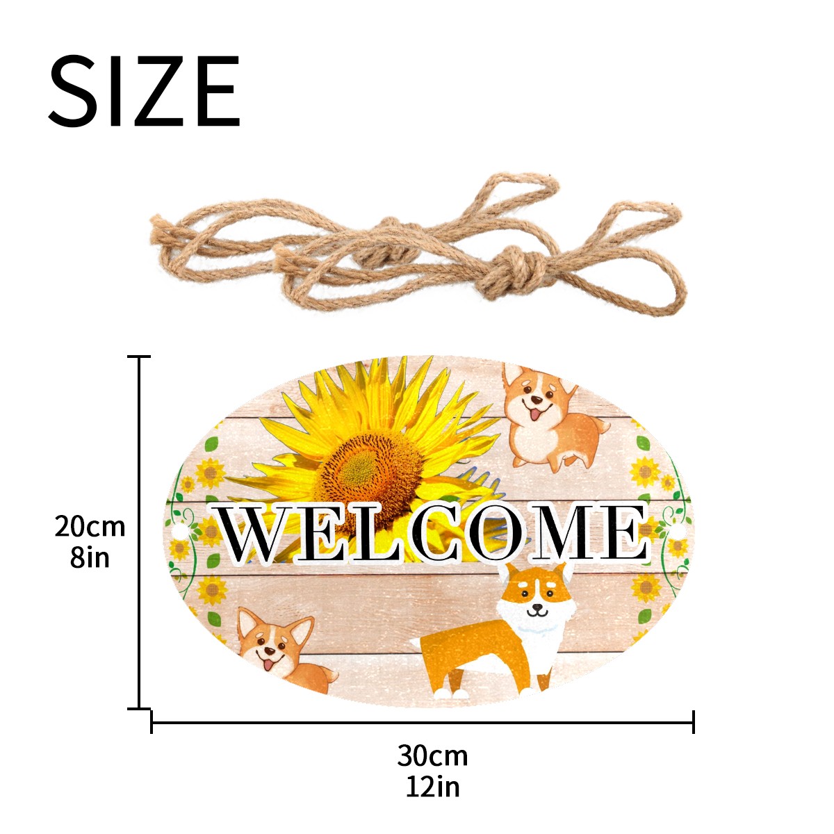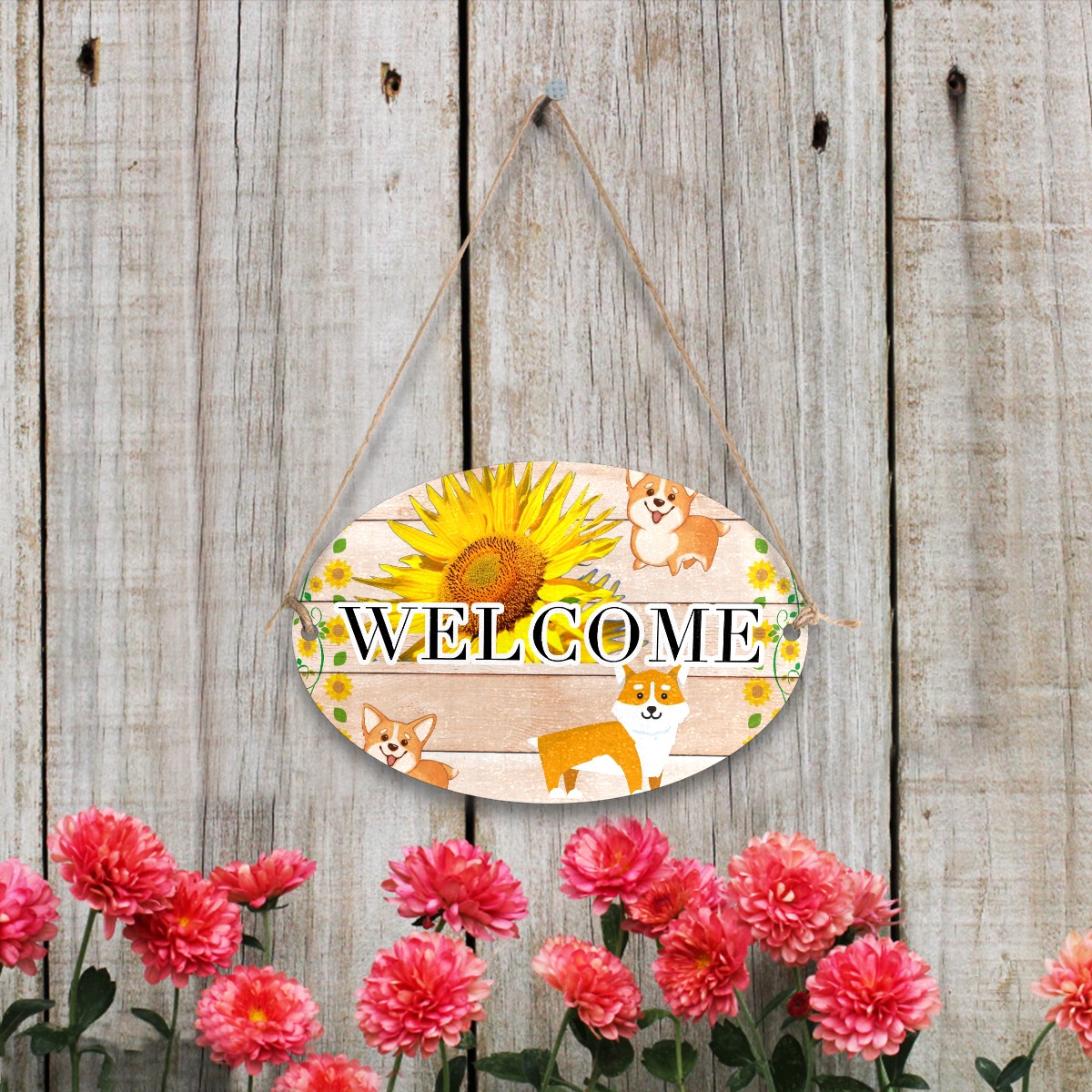 Welcome Sign Floral Arround Pattern Corgi Sunflower Wood Oval Wood Printed Door Plate Plaque Wall Hanging Front Door Decor Porch Garden Decorations Home Office Yard Room 12x8in with Hang Rope