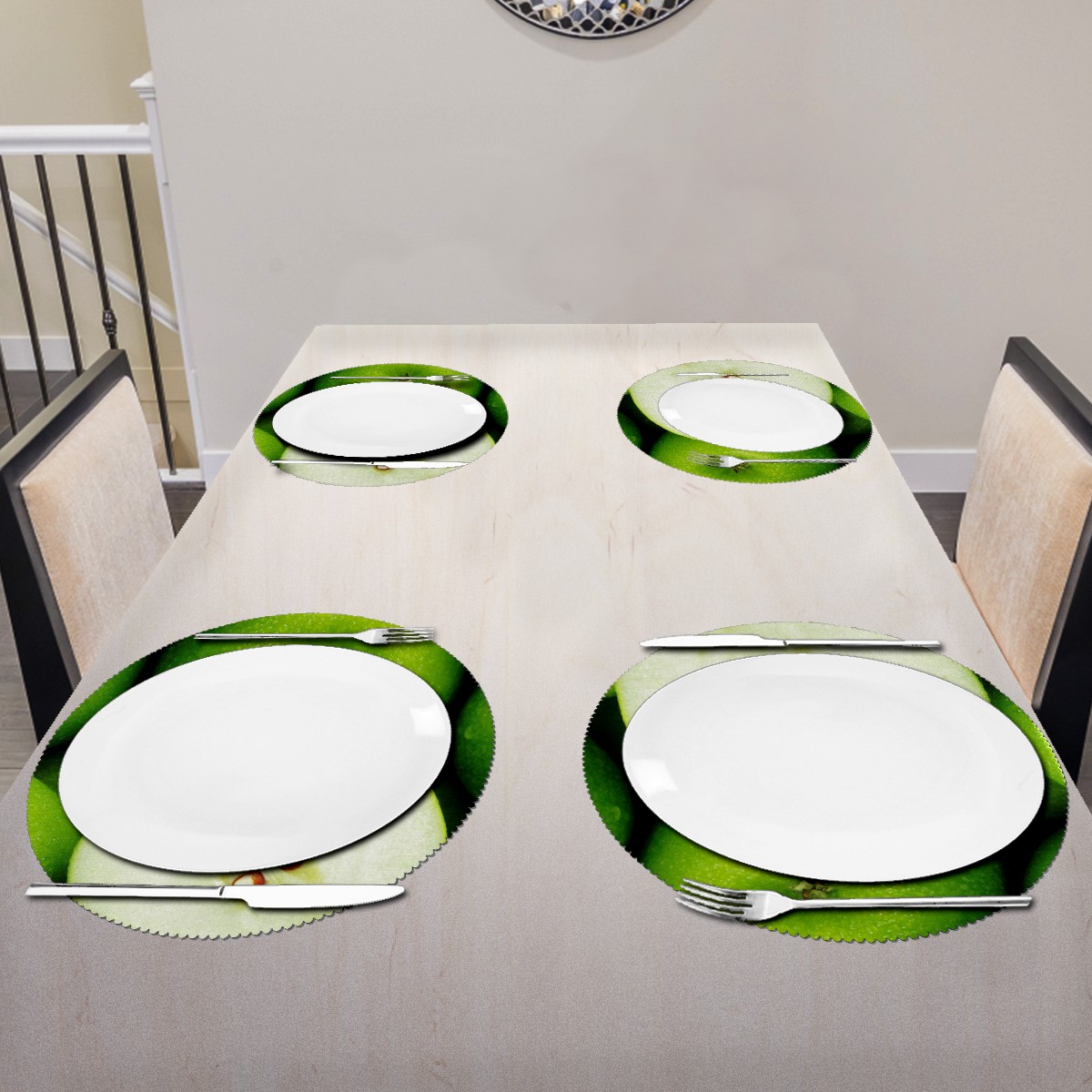 <p>Exquisite design placemats feel good would be the best decoration and Protection to your tables.</p> <p>Diameter: 15.3 Inch / 39 cm Weight: about 0.06 kg Package Included: 1 Pieces of Placemats.</p> <p>Material: 100% polyester, environmental protection material, can be washed directly.</p> <p>Protect: Isolate the table when there is a hot object to avoid scalding the table. Protect your table from scratches and stains ,liquid can go through placemats, clean it when finished.</p> <p>Easy to Care: Easy clean with wet cloth,or rinse with little cleaner would make them look as new. You can roll them up while you clean the table, convenient to care.</p> <p>Occasion: Great for dinner parties, housewarming, birthday celebrations, entertaining and family gatherings. They can be used indoor and outdoor. Use them in your home, garden, office, cafe, party house, restaurant, bar, hotel.</p> <p>Gift: Very practical and elegant gift for your wife, husband, parents, lover, colleague and friend for birthday, Valentine's Day, Thanksgiving, Halloween and Christmas.</p>