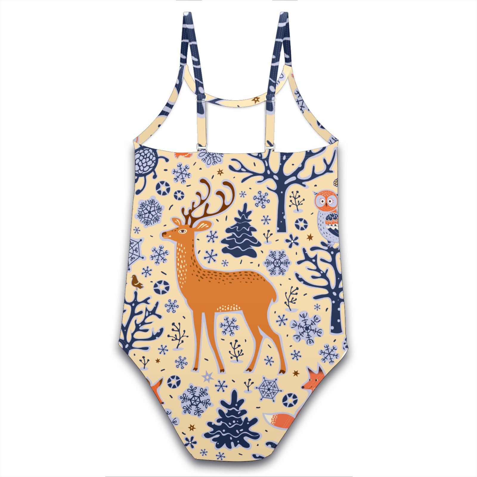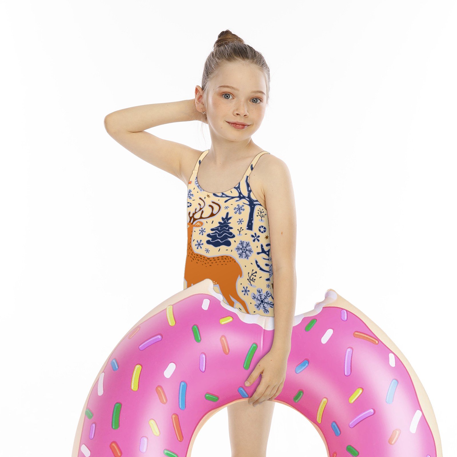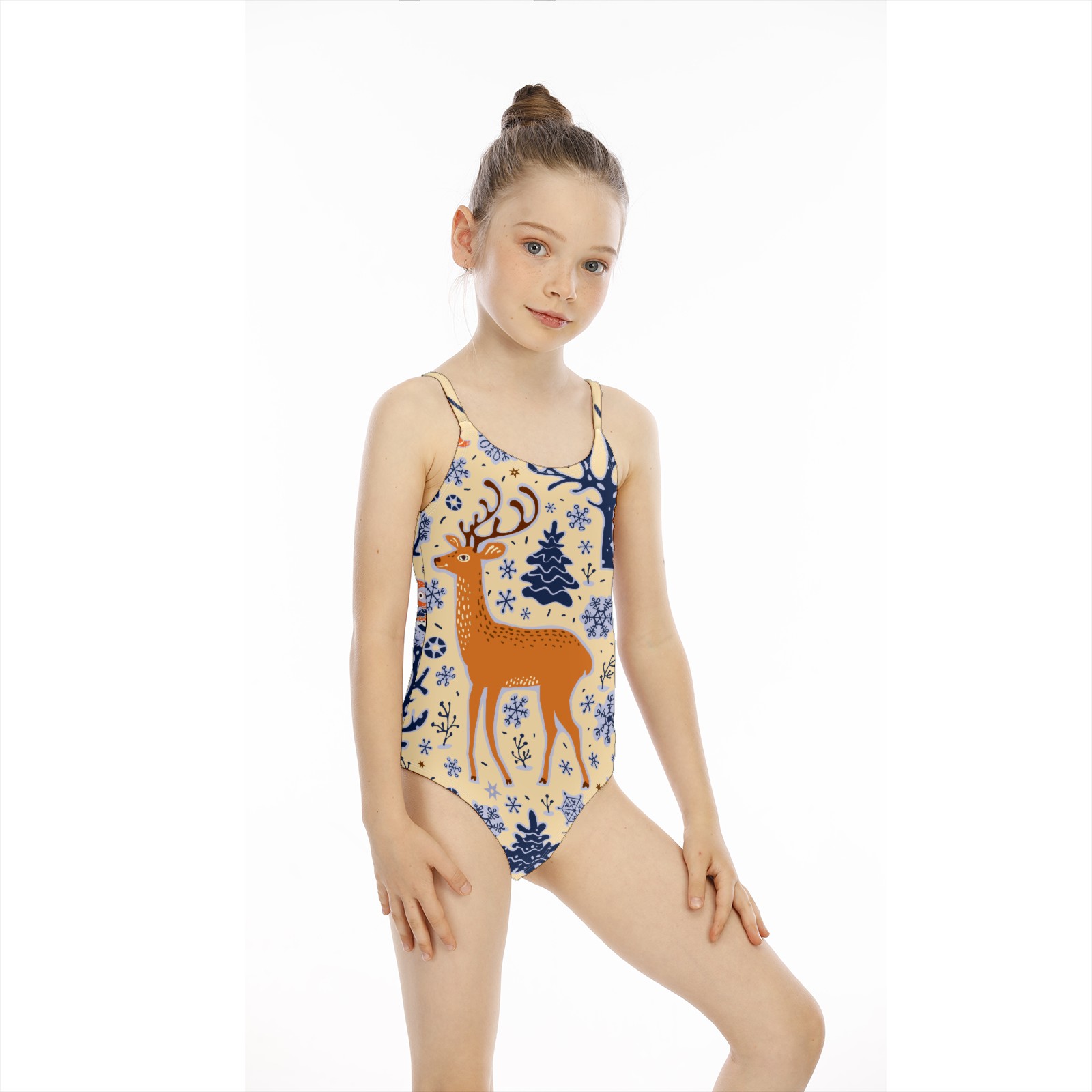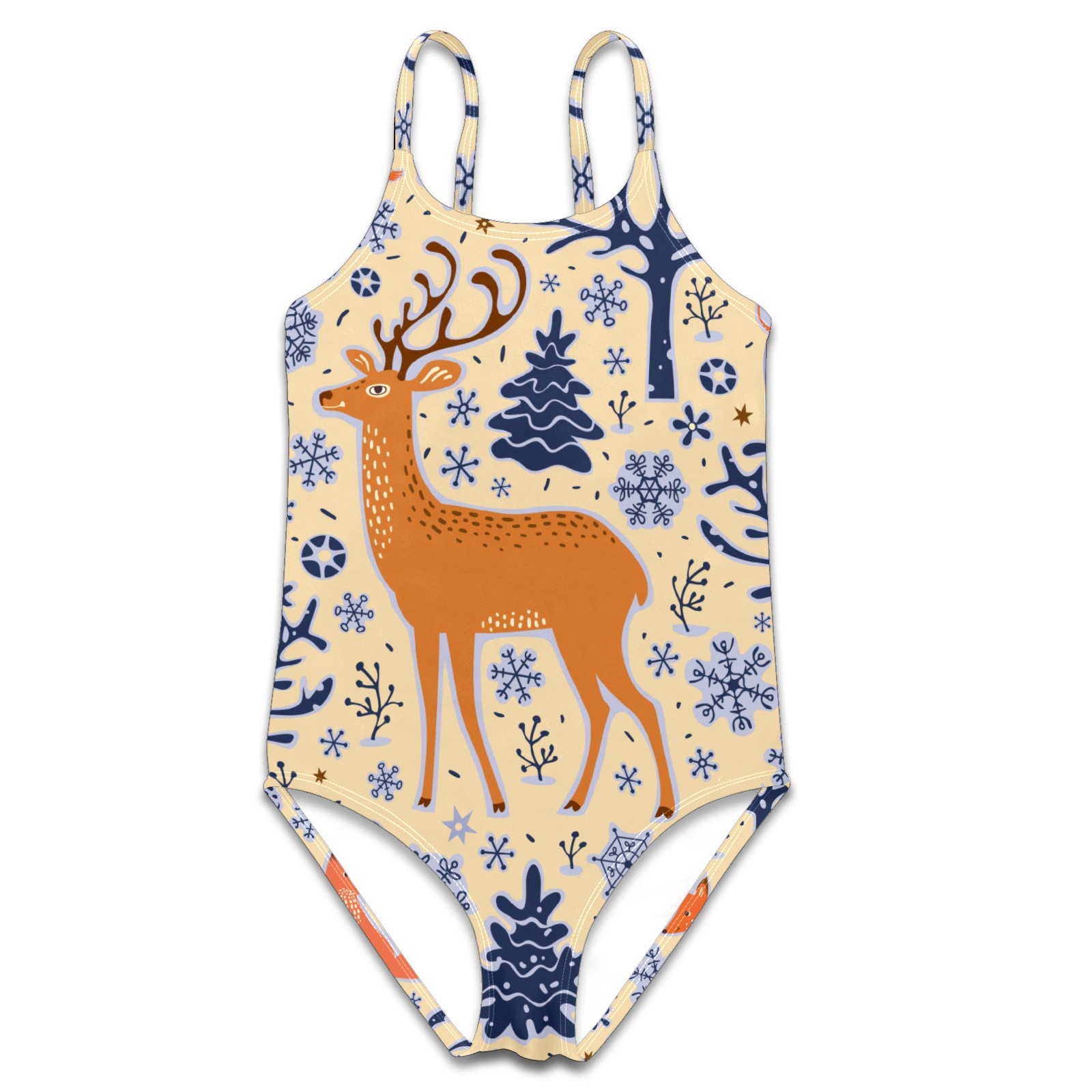 Girls Swimsuit One Piece Reindeer Tree Winter Snow Summer Swimwear Beach Sport Size 5-6 Years