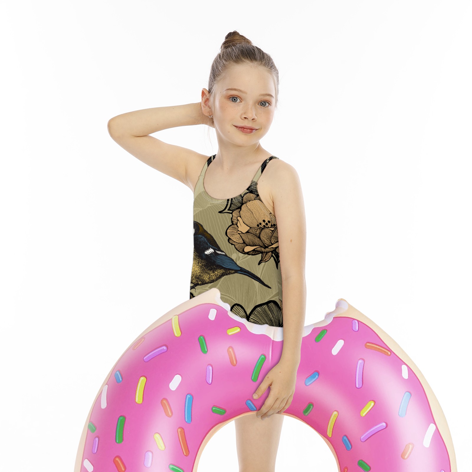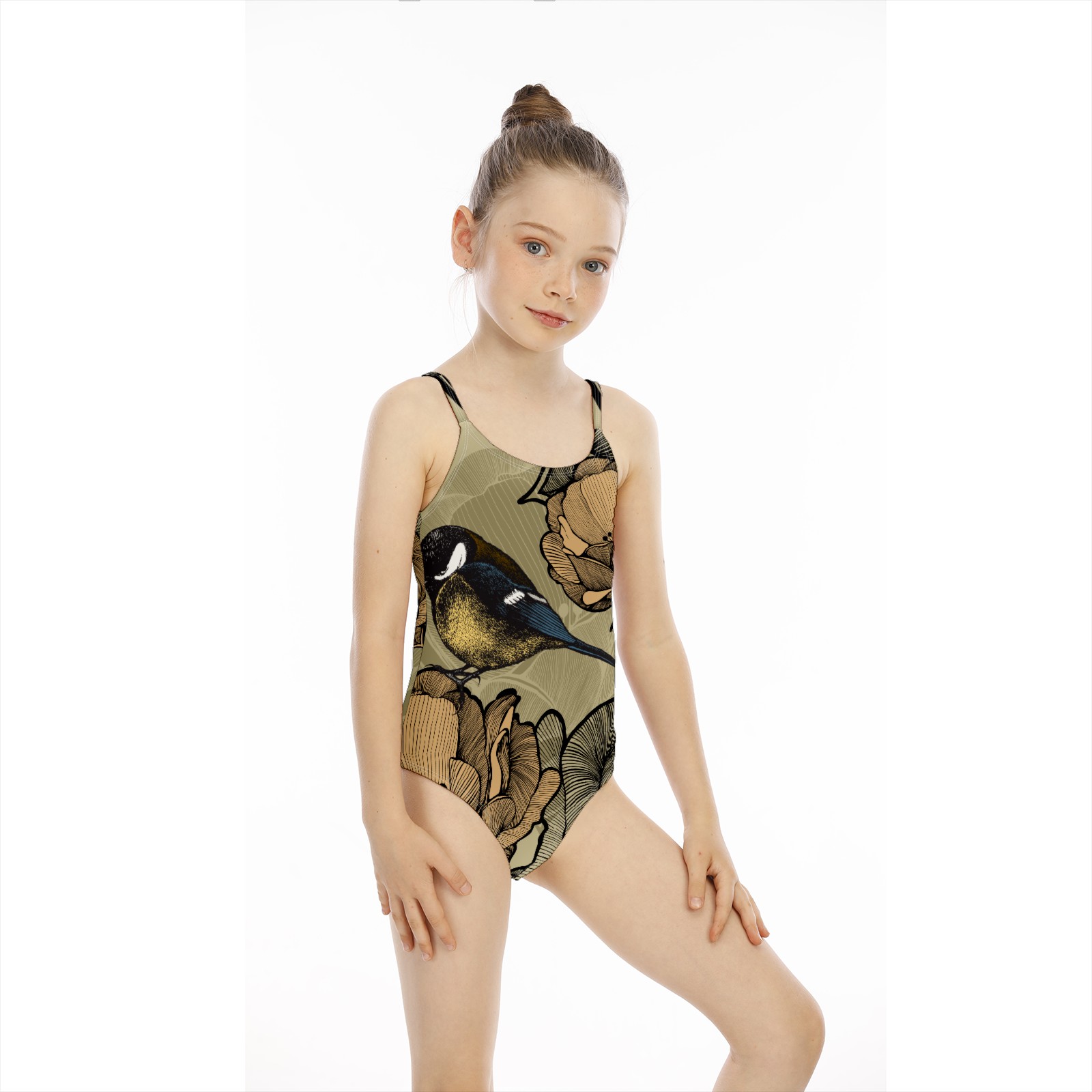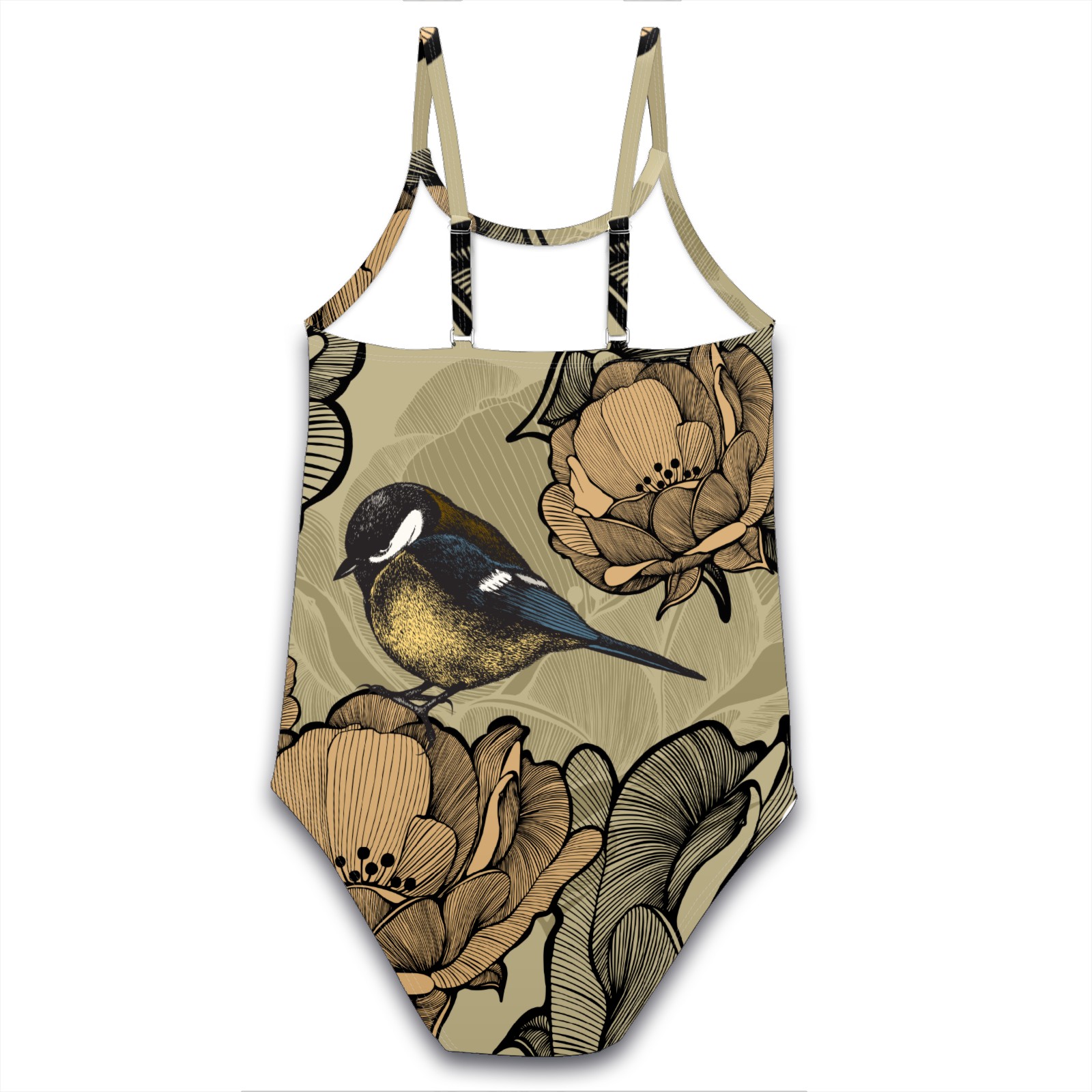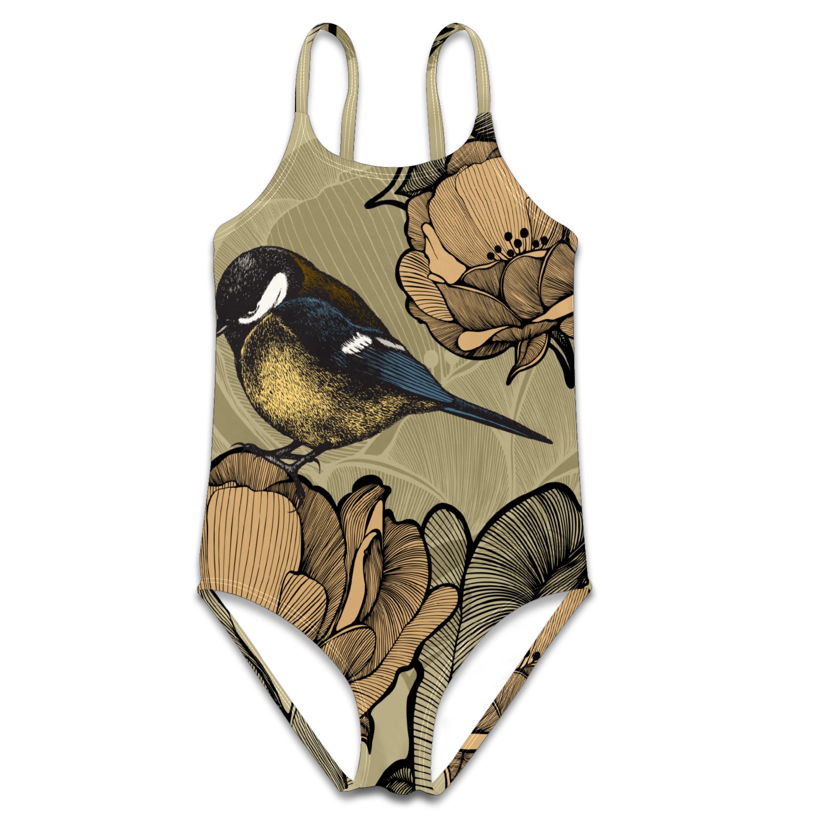 Girls Swimsuit One Piece Sparrow Vintage Bird Flower Summer Swimwear Beach Sport Size 5-6 Years