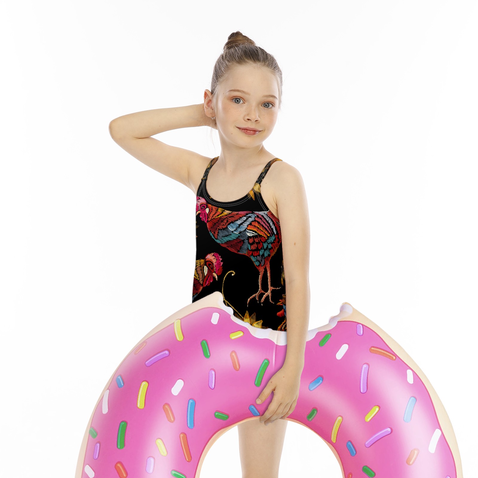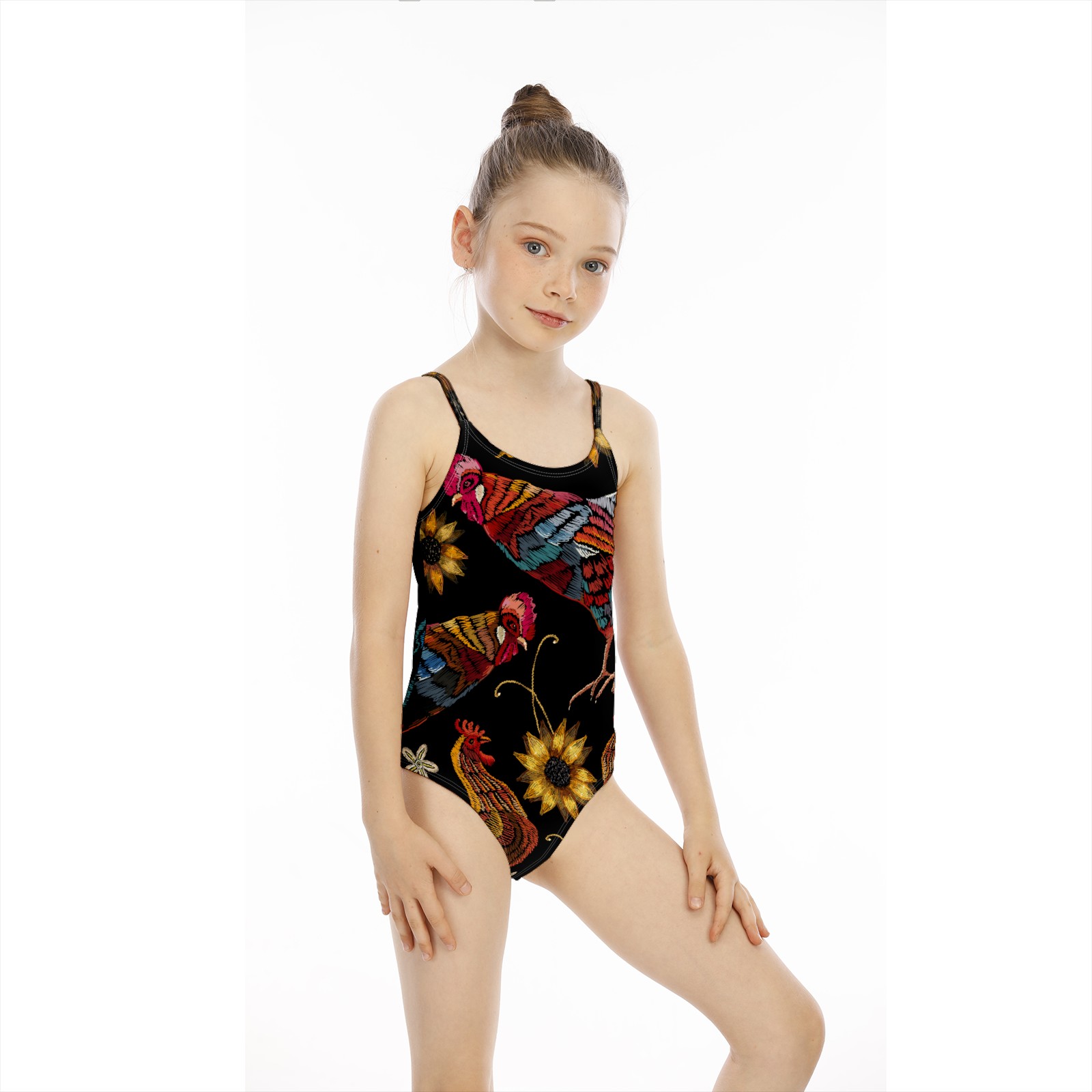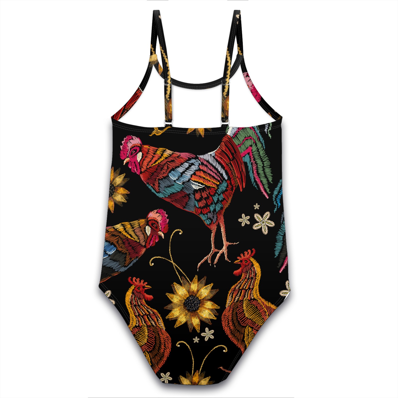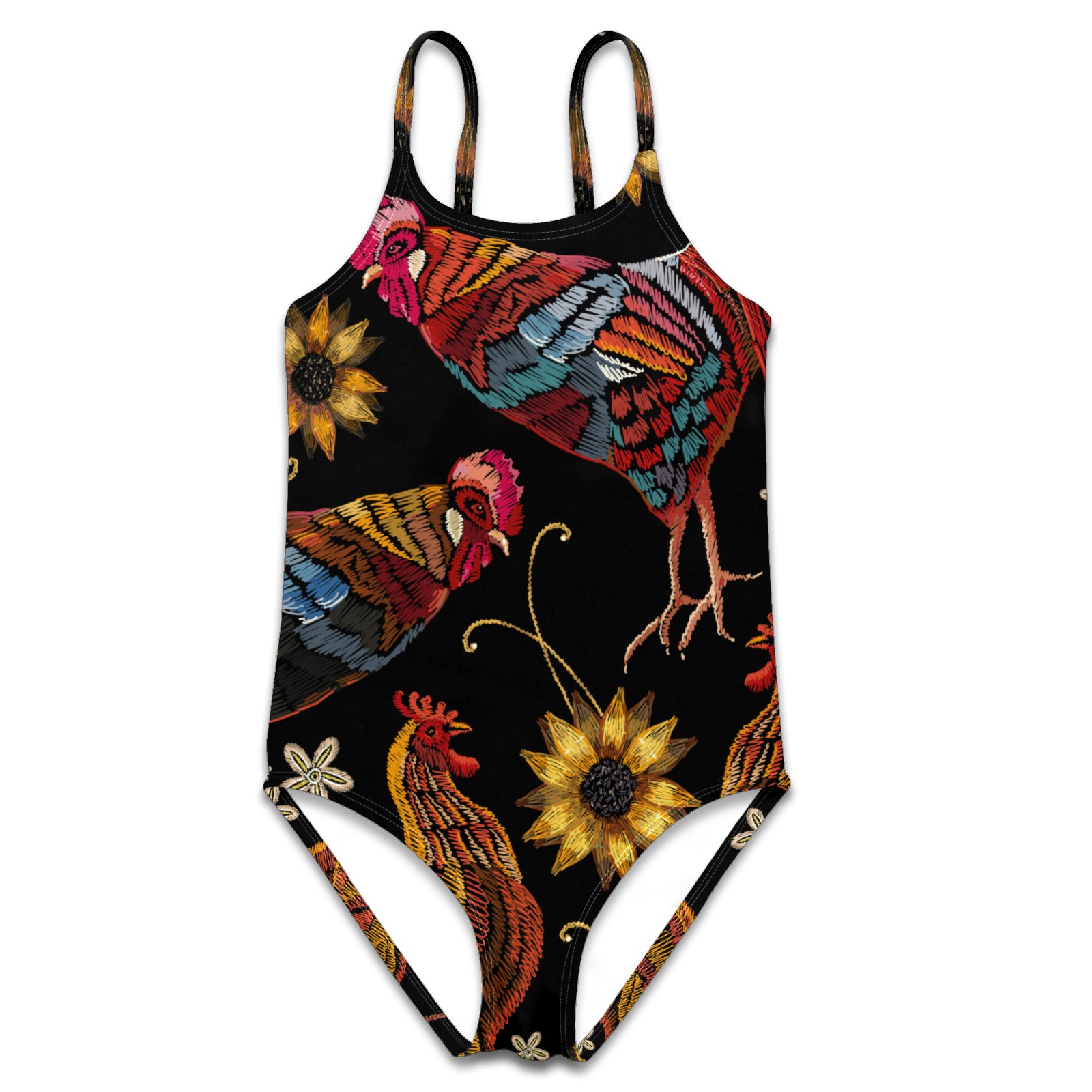 Girls Swimsuit One Piece Rooster Chicken Sunflower Rustic Embroidery Summer Swimwear Beach Sport Size 5-6 Years