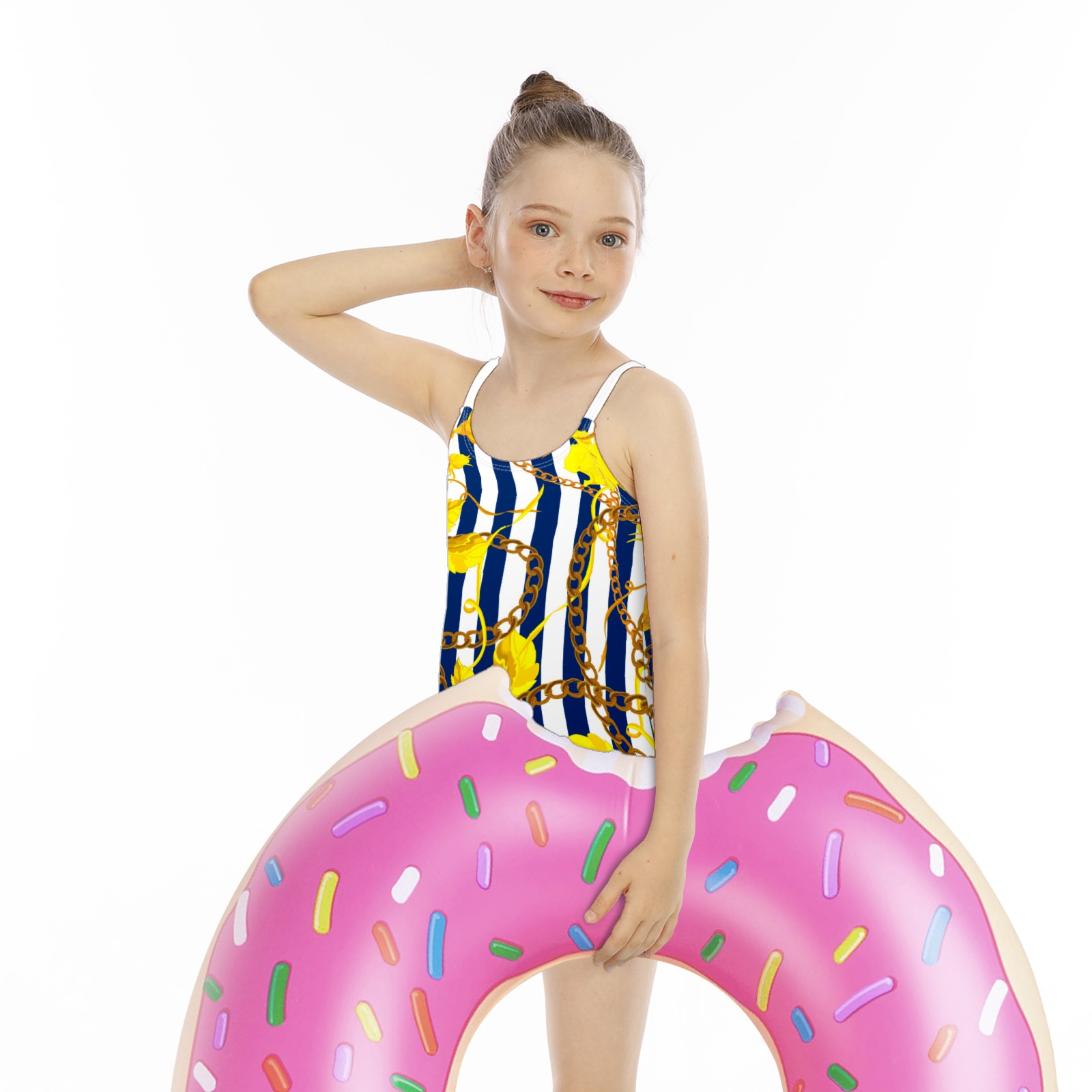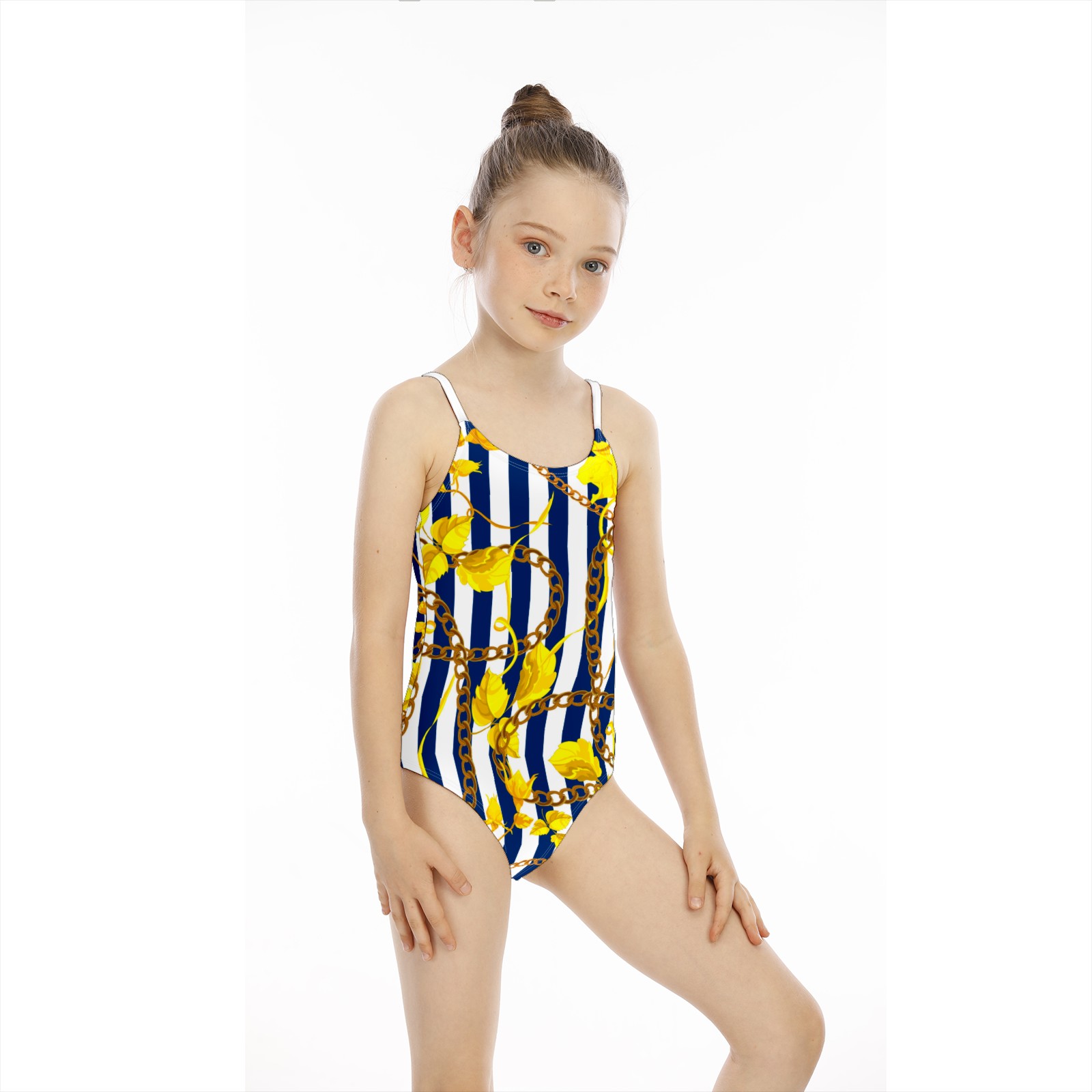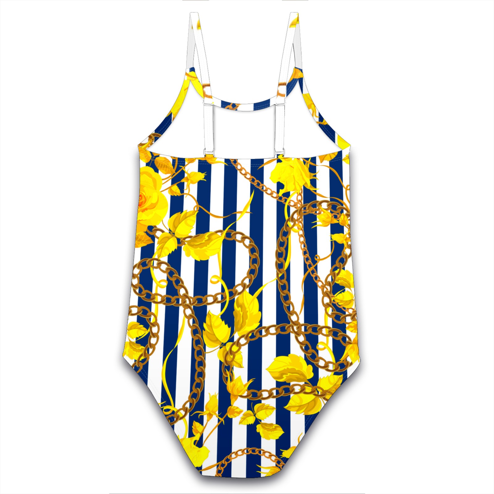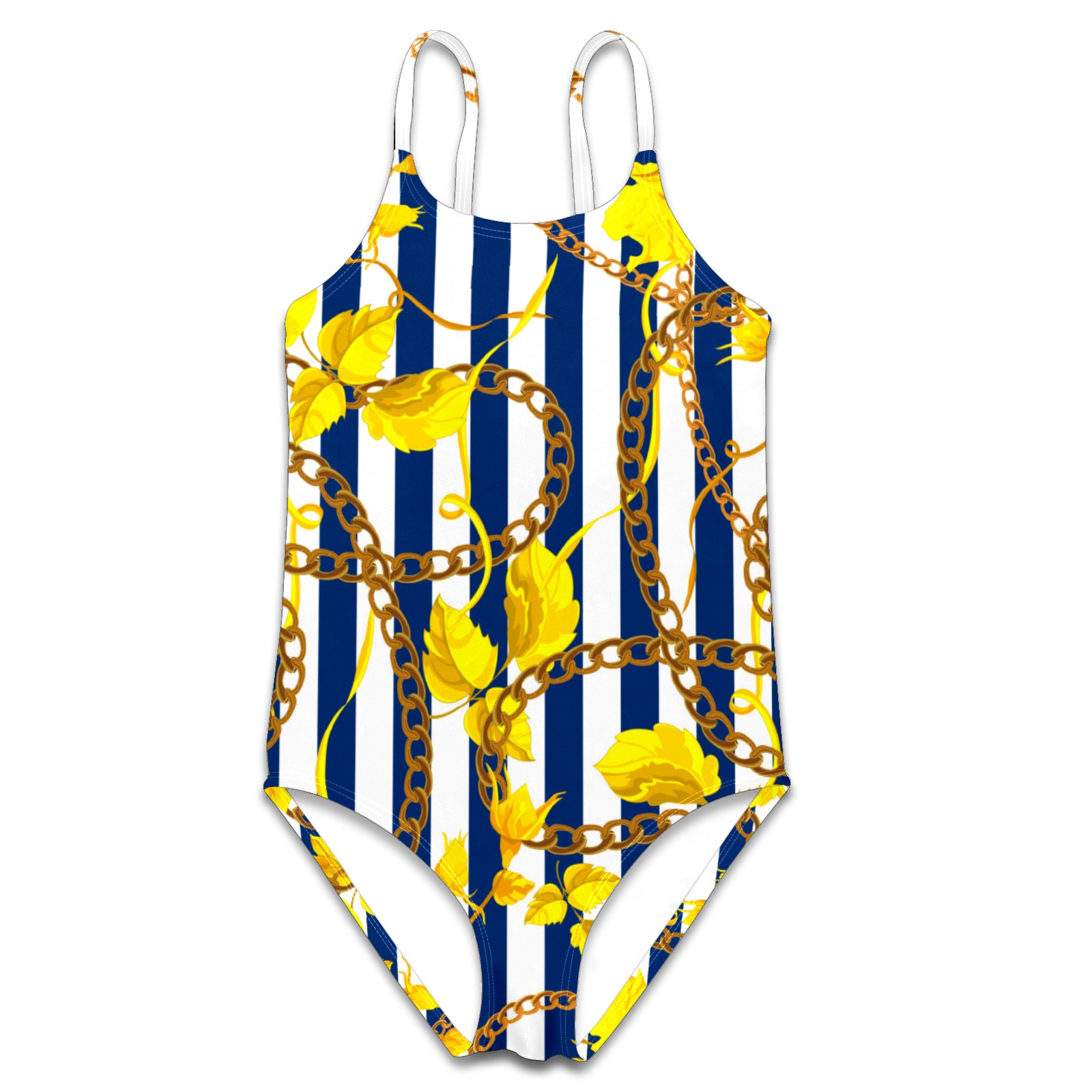 Girls Swimsuit One Piece Golden Chain Flowers Striped Summer Swimwear Beach Sport Size 5-6 Years