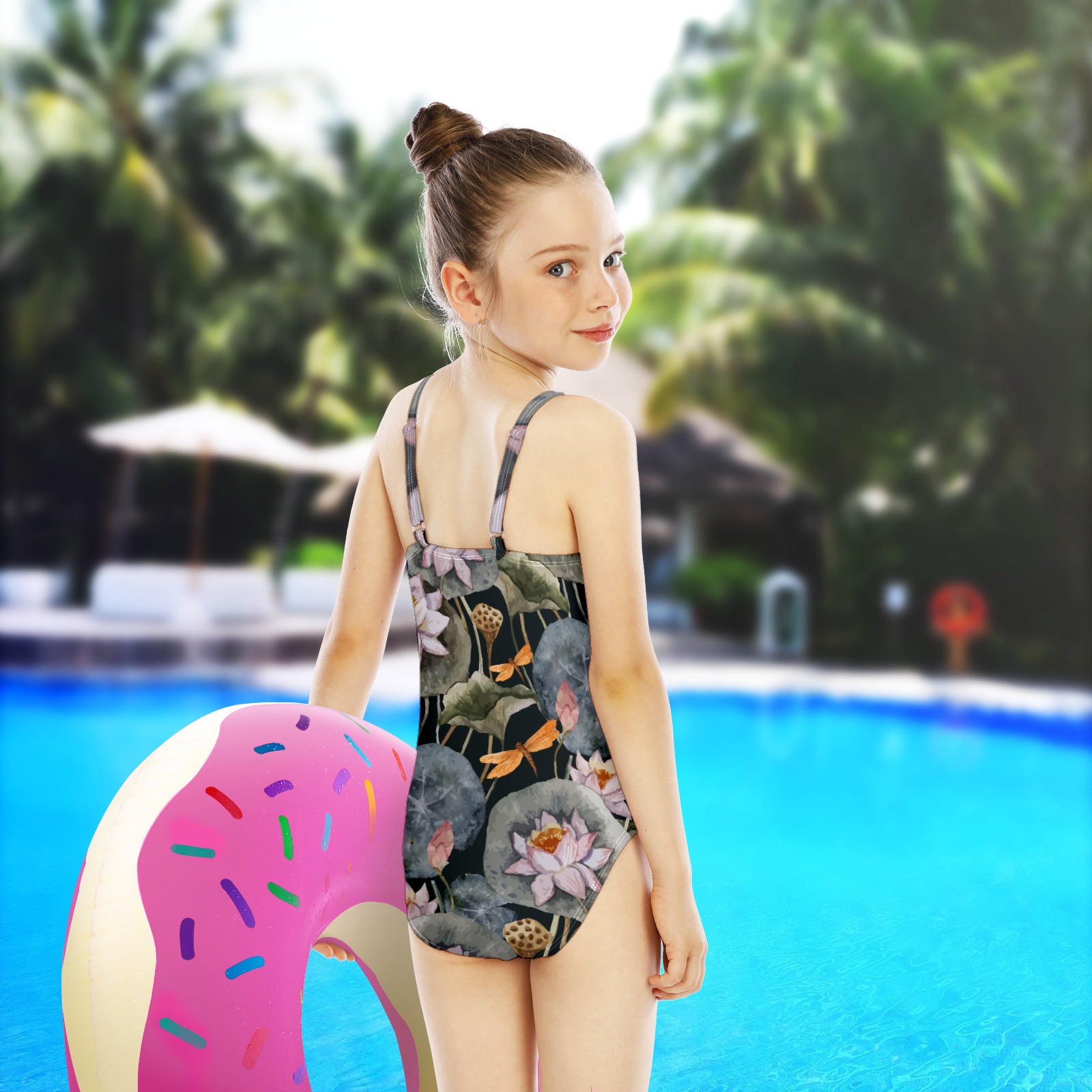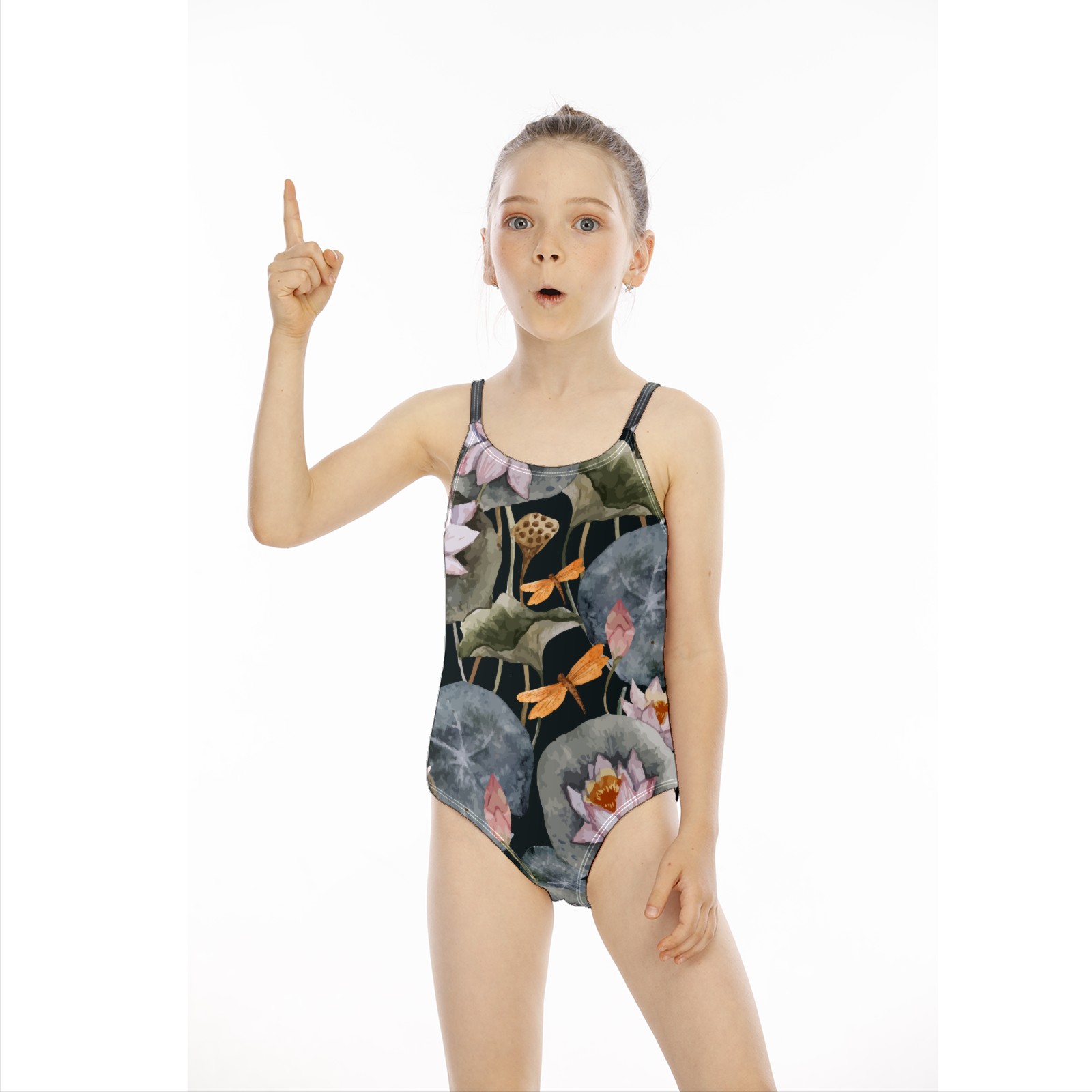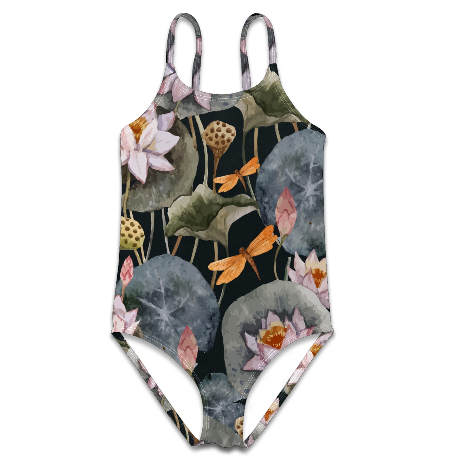 Girls Swimsuit One Piece Lotus Flower Chinese Dragonfly Summer Swimwear Beach Sport Size 5-6 Years
