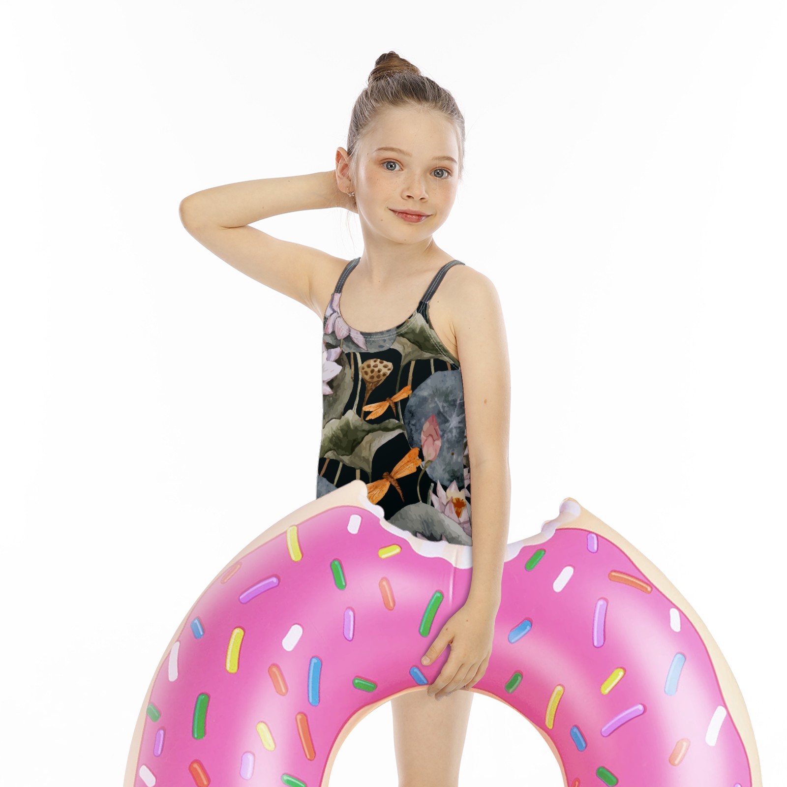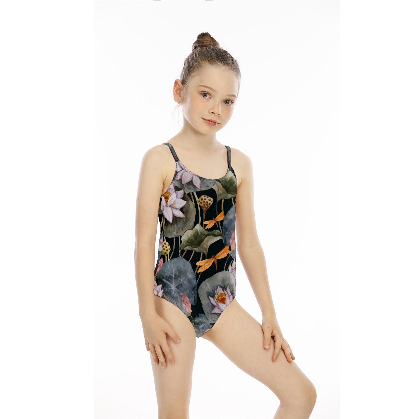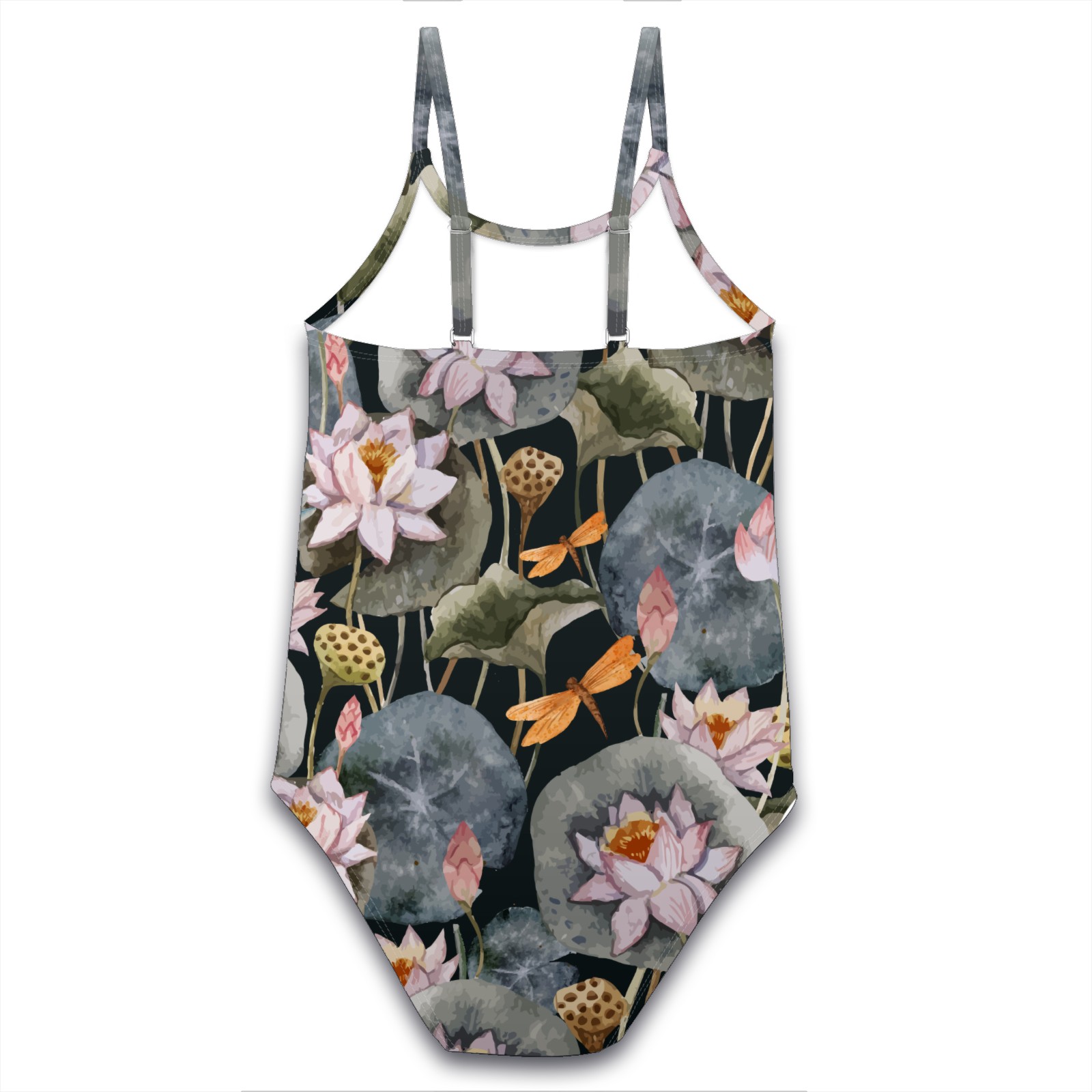 Girls Swimsuit One Piece Lotus Flower Chinese Dragonfly Summer Swimwear Beach Sport Size 5-6 Years
