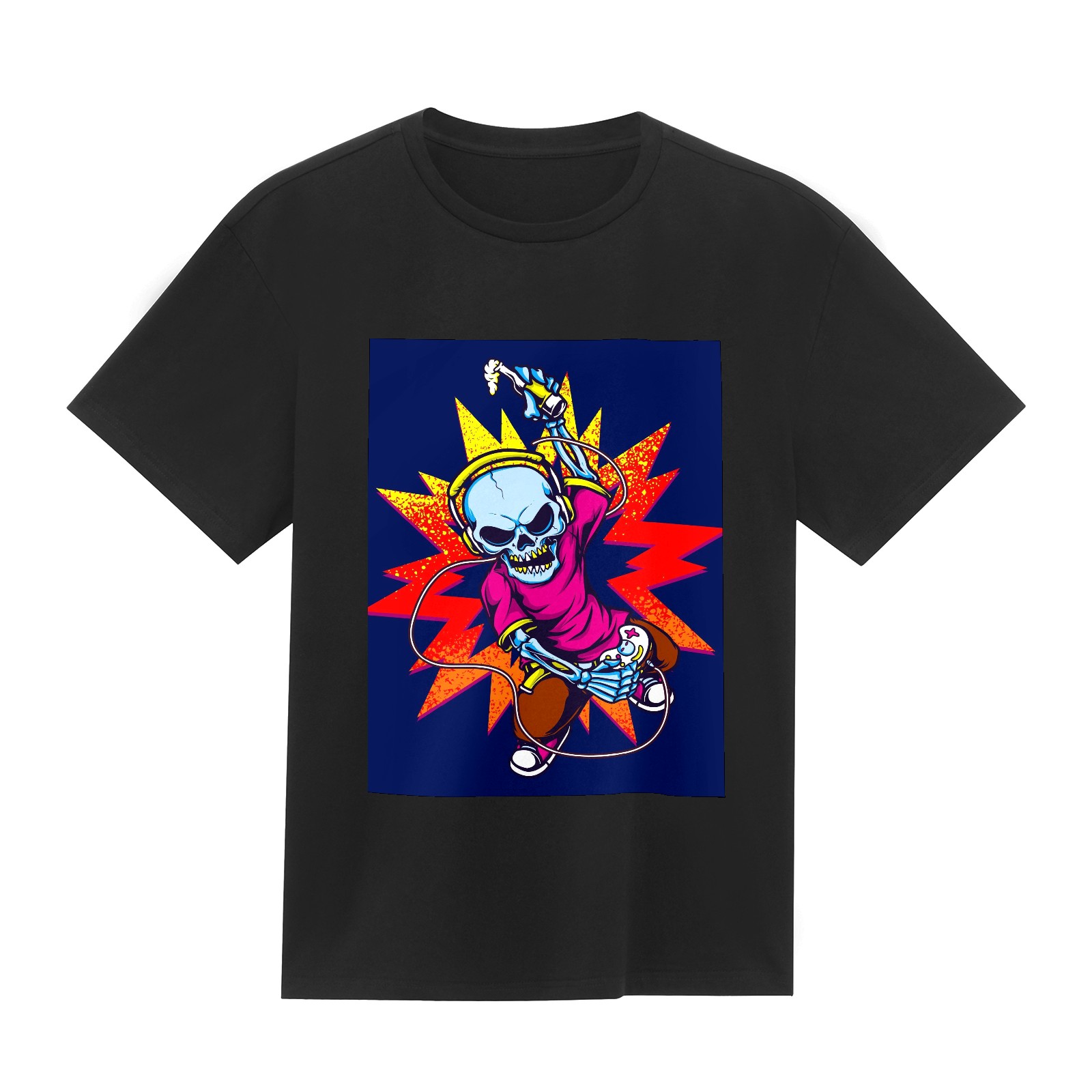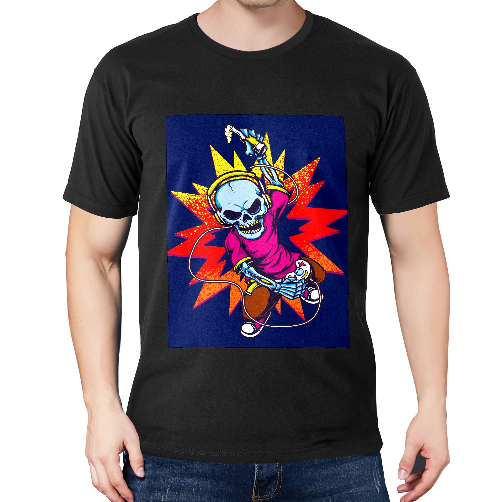 Men's Cotton T-Shirt Pop Art Skull With Game Controller Short Sleeve Black Adult Unisex Tee T-Shirts S