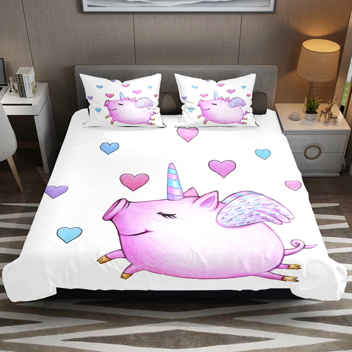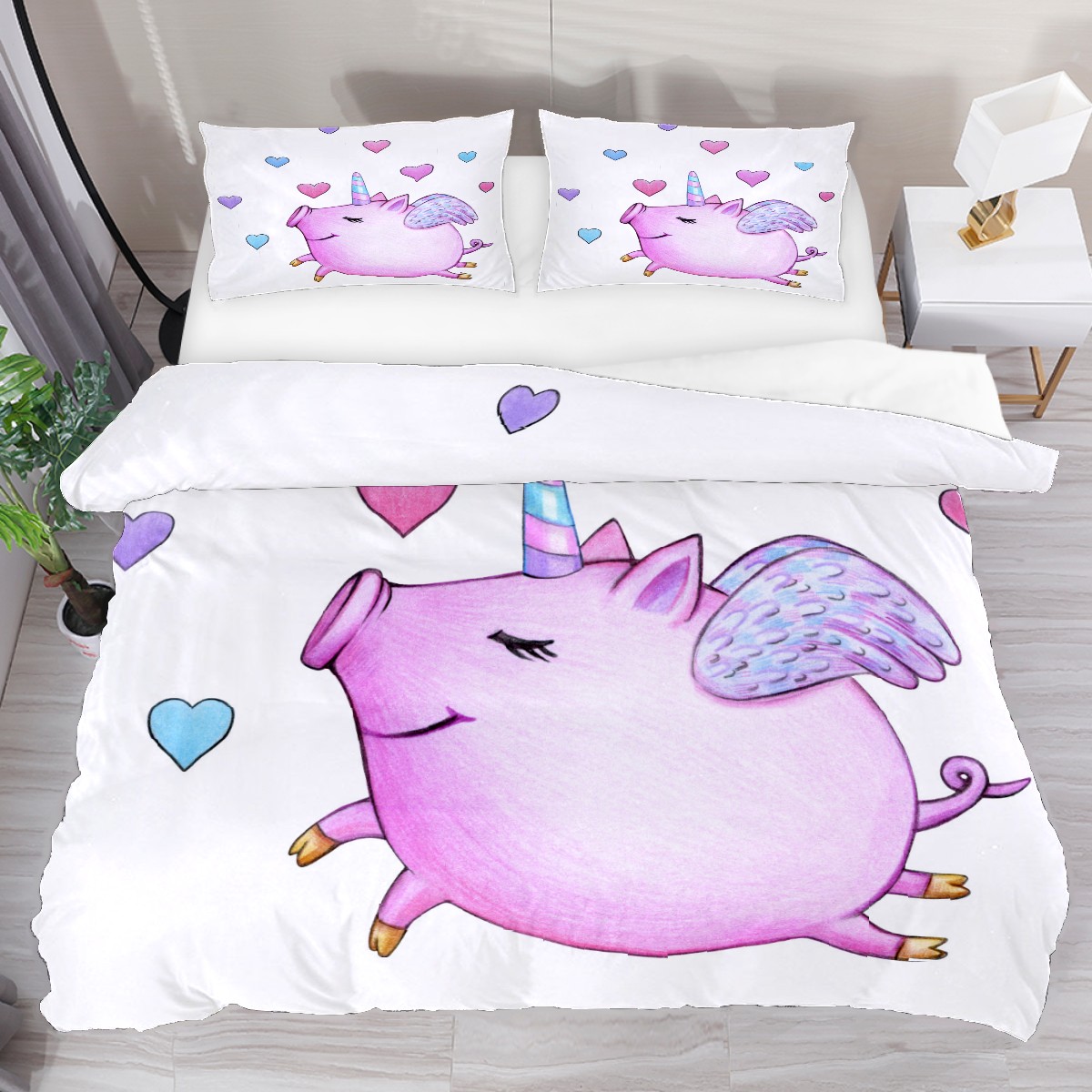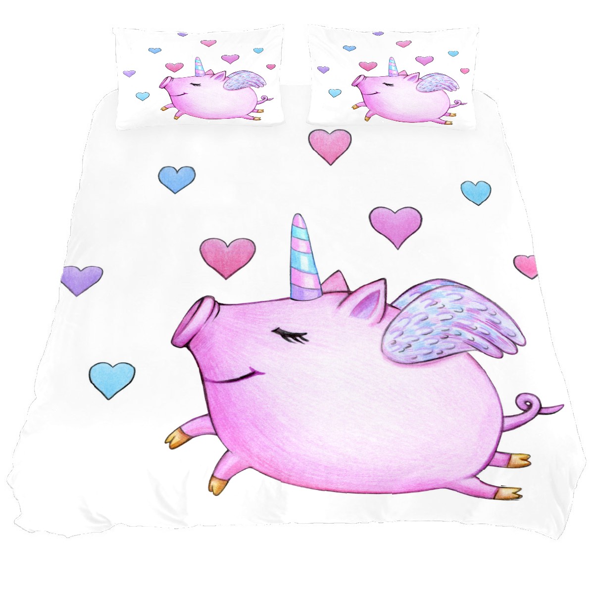 Duvet Cover Twin Animal Cute Pig Unicorn 3pcs Bedding Duvet Cover Set Modern Quilt Cover Microfiber Comforter Cover with Button Closure with 2 Pillow Cases 1 Duvet Cover